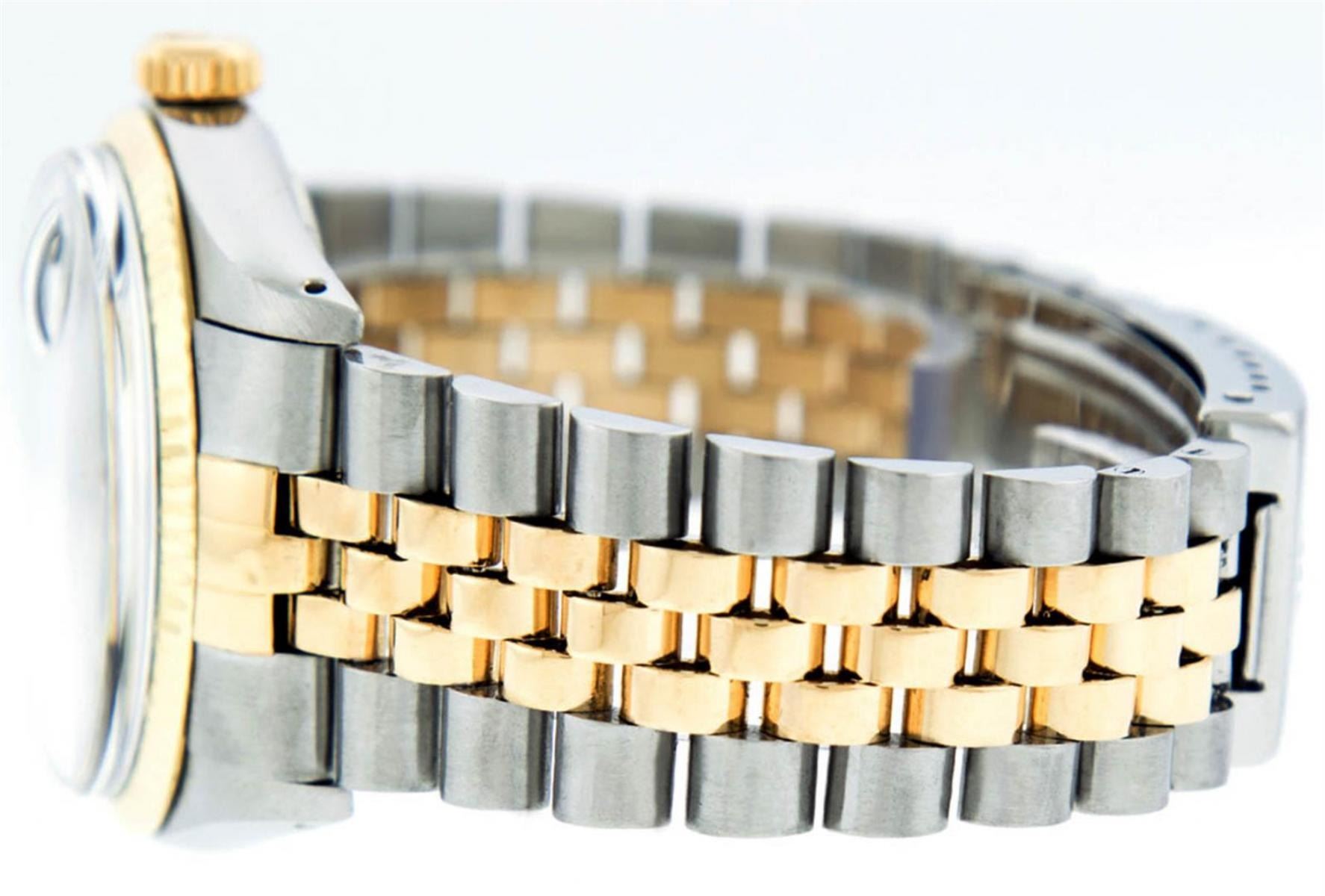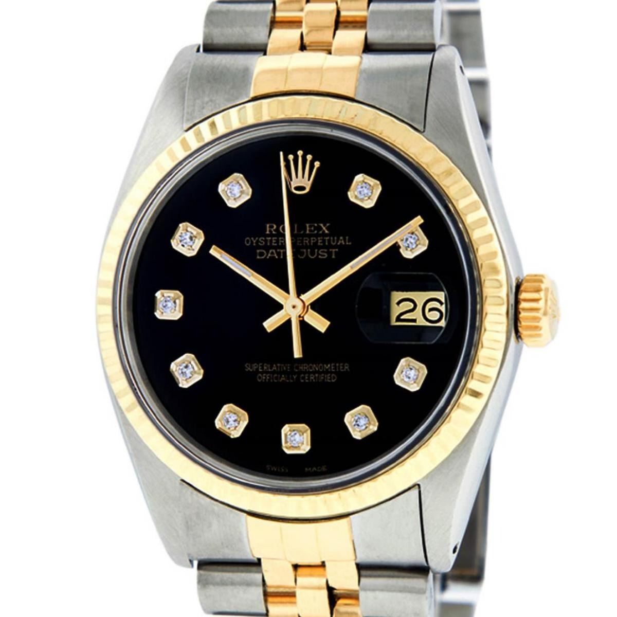 One Mens 14K Yellow Gold Two Tone Rolex Datejust Polished, Serviced & Electronically Tested, 14K Yellow Gold & Stainless Steel Case: 36mm, 14K Yellow Gold Crown, Bezel: 14K Yellow Gold Fluted Bezel. Custom Crystal: New Acrylic Cyclops Lens. Custom Hands: New Luminecent Hands. Movement: Automatic Winding Movement Caliber 3035. Custom Dial: Black Diamond Dial, Diamond Count: 10 Diamonds In Dial, Color: G to H, Clarity: SI-VS. Date Window: 3 O'Clock Position Date Display, Quickset, Model: 16013 Condition: G-6 Extra Fine. Bracelet: Two Tone 14K Yellow Gold & Stainless Steel Jubilee. Bright Polish. 7.0 Inch Length, Adjustable. Standard Clasp, With Rolex Logo. This Watch Has Been Serviced Time Tested And Is In Excellent Condition It Is Free Of All Scratches And Dents.