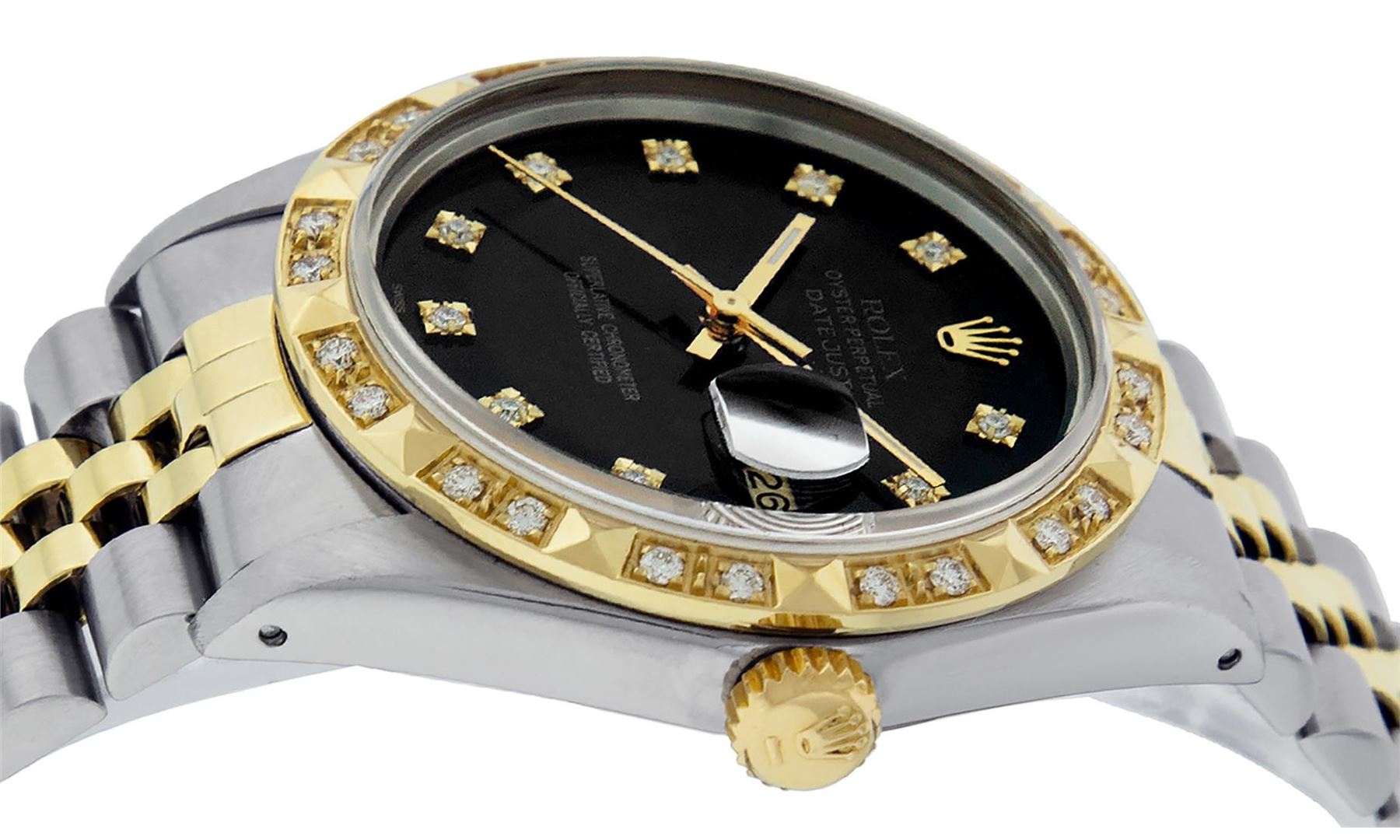 One Mens 14K Yellow Gold Rolex Datejust Polished Bright with Satin Finish, Serviced & Electronically Tested, Stainless Steel Case: 36mm, Yellow Gold Crown, Custom Bezel: New 18K Yellow Gold Pyramid Diamond Bezel, Diamond Count: 24 Diamonds, Total Weight .75 Carat, Clarity: SI-VS, Color: G to H. Custom Crystal: New Scratch Resistant Synthetic Sapphire Cyclops Lens. Custom Hands: New Luminecent Hands. Movement: Automatic Winding Movement Caliber 3035. Custom Dial: Black Single Cut Diamond Dial, Diamond Count: 10 Diamonds In Dial, Color: G to H, Clarity: VS. Date Window: 3 O'Clock Position Date Display, Quickset, Model: Datejust. Condition: G-6 Extra Fine. Bracelet: 14K Yellow Gold And Stainless Steel Jubilee Band. Bright Polish & Satin Finish. 7.0 Inch Length, Adjustable. Standard Clasp, With Rolex Logo. This Watch Has Been Serviced And Polished It Is Free Of All Scratches And Dents.