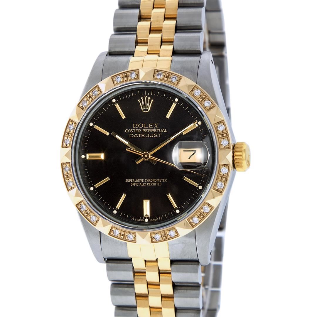 One Mens 14K Yellow Gold Rolex Datejust Polished Bright with Satin Finish, Serviced & Electronically Tested, Stainless Steel Case: 36mm, Yellow Gold Crown, Custom Bezel: New 18K Yellow Gold Pyramid Diamond Bezel, Diamond Count: 24 Diamonds, Total Weight .75 Carat, Clarity: SI-VS, Color: G to H. Custom Crystal: New Scratch Resistant Synthetic Sapphire Cyclops Lens. Custom Hands: New Luminecent Hands. Movement: Automatic Winding Movement Caliber 3035. Custom Dial: Black Index Dial With Dash Track & Lumi Dots. Date Window: 3 O'Clock Position Date Display, Quickset, Model: 16013 Datejust. Condition: G-6 Extra Fine. Bracelet: 14K Yellow Gold And Stainless Steel Jubilee Band. Bright Polish & Satin Finish. 7.0 Inch Length, Adjustable. Standard Clasp, With Rolex Logo. This Watch Has Been Serviced And Polished It Is Free Of All Scratches And Dents.
