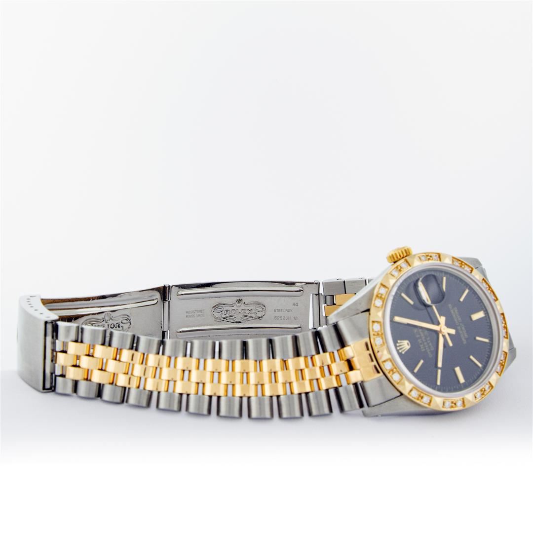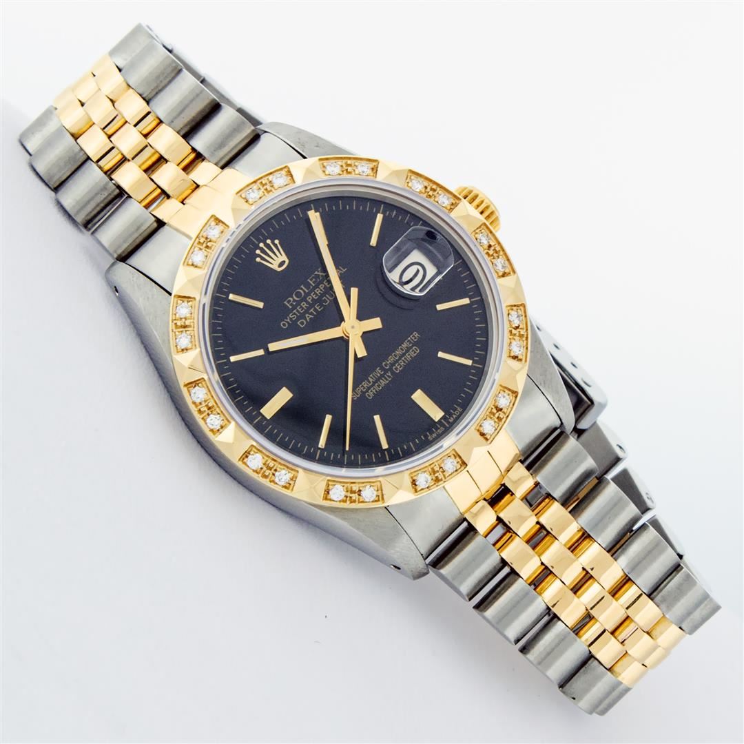 One Mens 14K Yellow Gold Rolex Datejust Polished Bright with Satin Finish, Serviced & Electronically Tested, Stainless Steel Case: 36mm, Yellow Gold Crown, Custom Bezel: New 18K Yellow Gold Pyramid Diamond Bezel, Diamond Count: 24 Diamonds, Total Weight .75 Carat, Clarity: SI-VS, Color: G to H. Custom Crystal: New Scratch Resistant Synthetic Sapphire Cyclops Lens. Custom Hands: New Luminecent Hands. Movement: Automatic Winding Movement Caliber 3035. Custom Dial: Black Index Dial With Dash Track & Lumi Dots. Date Window: 3 O'Clock Position Date Display, Quickset, Model: 16013 Datejust. Condition: G-6 Extra Fine. Bracelet: 14K Yellow Gold And Stainless Steel Jubilee Band. Bright Polish & Satin Finish. 7.0 Inch Length, Adjustable. Standard Clasp, With Rolex Logo. This Watch Has Been Serviced And Polished It Is Free Of All Scratches And Dents. This Watch Comes With A Rolex Box And Appraisal.
