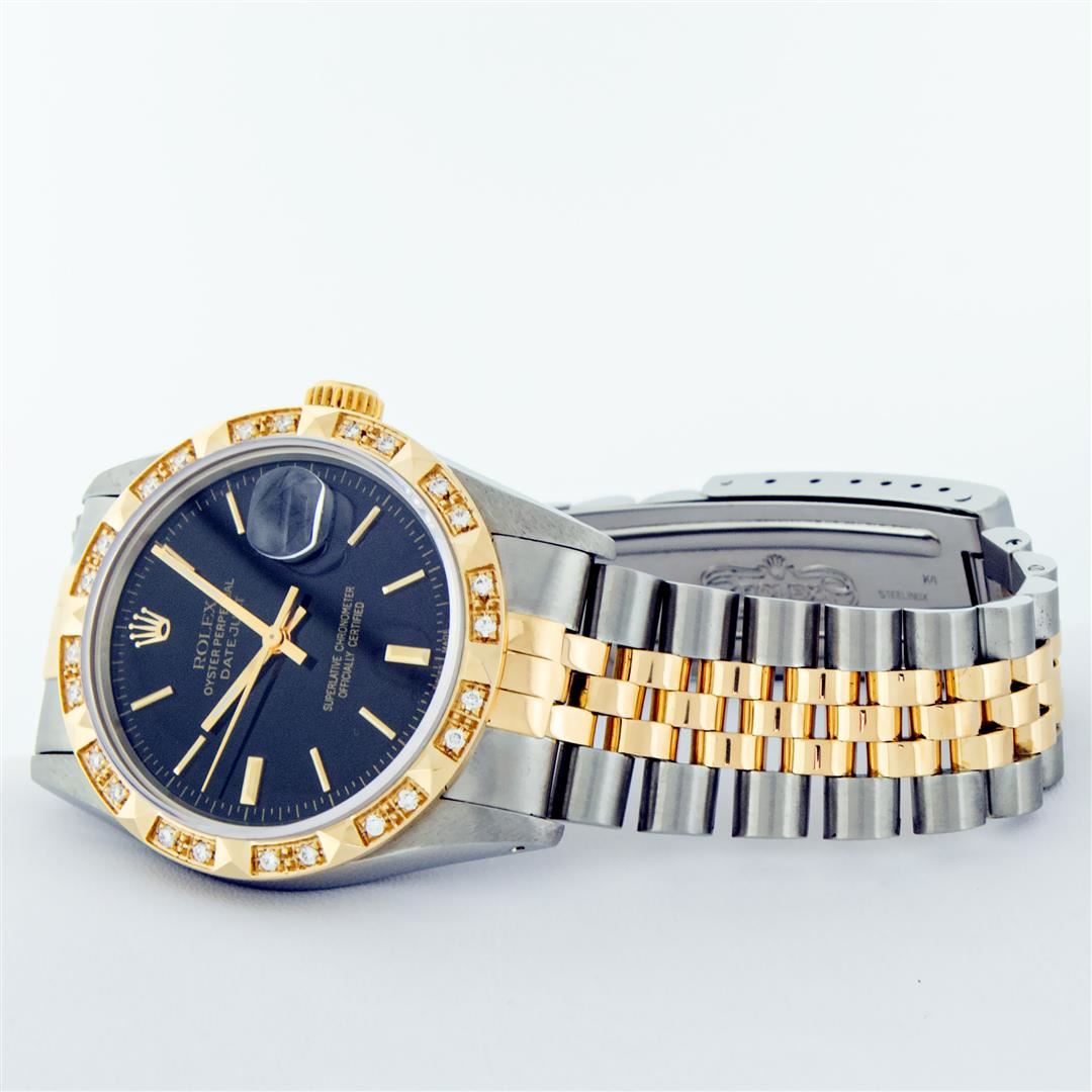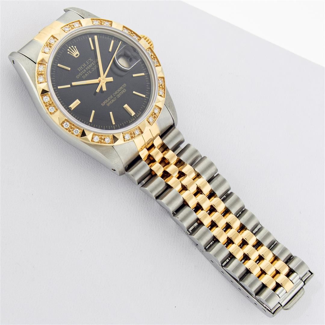 One Mens 14K Yellow Gold Rolex Datejust Polished Bright with Satin Finish, Serviced & Electronically Tested, Stainless Steel Case: 36mm, Yellow Gold Crown, Custom Bezel: New 18K Yellow Gold Pyramid Diamond Bezel, Diamond Count: 24 Diamonds, Total Weight .75 Carat, Clarity: SI-VS, Color: G to H. Custom Crystal: New Scratch Resistant Synthetic Sapphire Cyclops Lens. Custom Hands: New Luminecent Hands. Movement: Automatic Winding Movement Caliber 3035. Custom Dial: Black Index Dial With Dash Track & Lumi Dots. Date Window: 3 O'Clock Position Date Display, Quickset, Model: 16013 Datejust. Condition: G-6 Extra Fine. Bracelet: 14K Yellow Gold And Stainless Steel Jubilee Band. Bright Polish & Satin Finish. 7.0 Inch Length, Adjustable. Standard Clasp, With Rolex Logo. This Watch Has Been Serviced And Polished It Is Free Of All Scratches And Dents. This Watch Comes With A Rolex Box And Appraisal.
