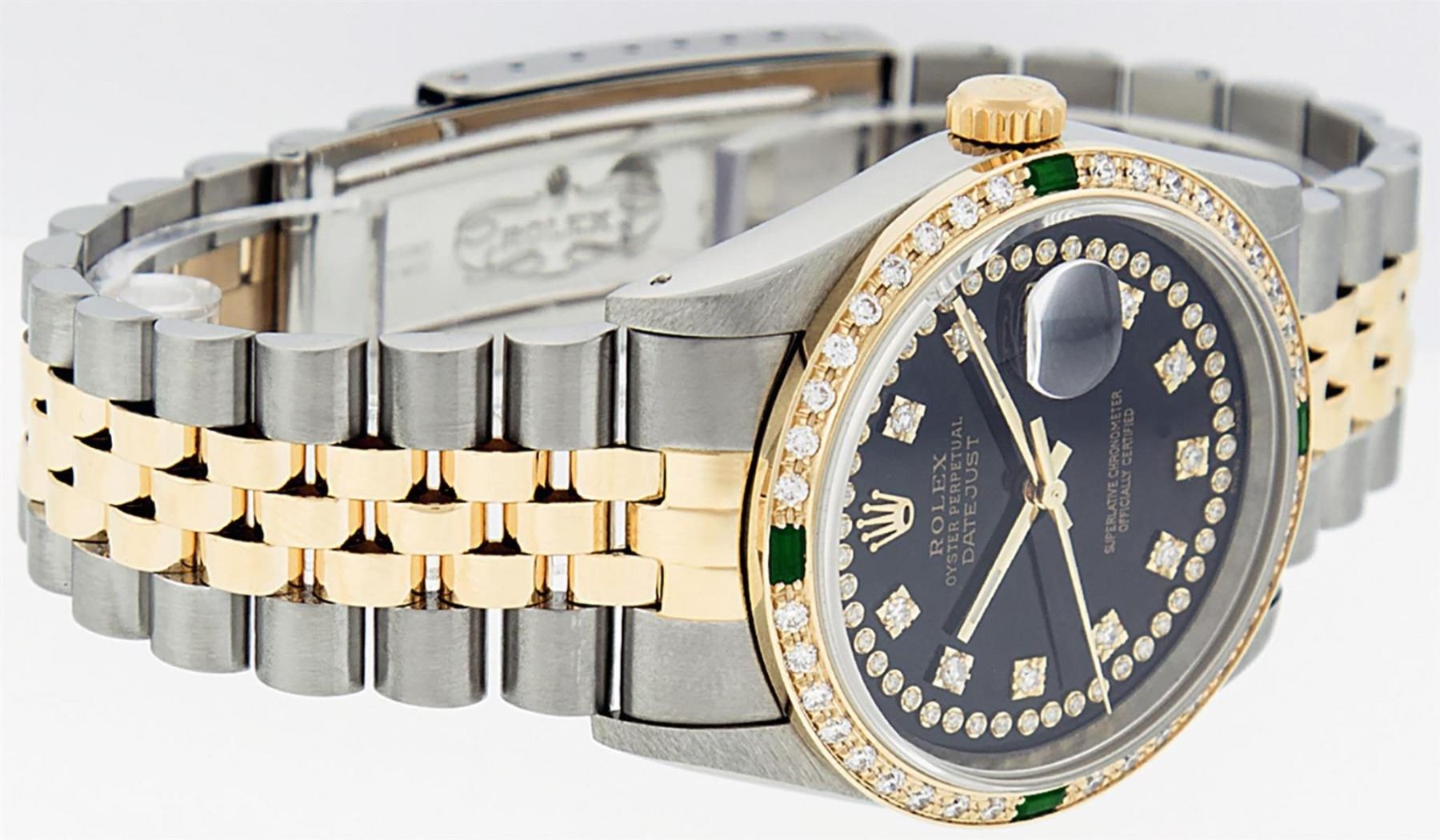 One Mens 14K Yellow Gold Two Tone Rolex Datejust Polished, Serviced & Electronically Tested, 14K Yellow Gold & Stainless Steel Case: 36mm, 14K Yellow Gold Crown, Custom Bezel: 18K Yellow Gold Emerald Beadset Diamond Bezel, Diamond Count: 36 Diamonds + 4 Emeralds, Total Weight 1.0 Carat, Clarity: SI-VS, Color: G to H. Custom Crystal: New Scratch Resistant Synthetic Sapphire Cyclops Lens. Custom Hands: New Luminecent Hands. Movement: Automatic Winding Movement Caliber 3035. Custom Dial: Black String Single Cut Diamond Dial, Diamond Count: 58 Diamonds In Dial, Color: G to H, Clairty: VS2 Date Window: 3 O'Clock Position Date Display,� Quickset, Model: 16013 Condition: G-6 Extra Fine. Bracelet: Two Tone 14K Yellow Gold & Stainless Steel Jubilee Band. Bright Polish. 7.0 Inch Length, Adjustable. Standard Clasp, With Rolex Logo. This Watch Has Been Serviced Time Tested And Is In Excellent Condition It Is Free Of All Scratches And Dents.