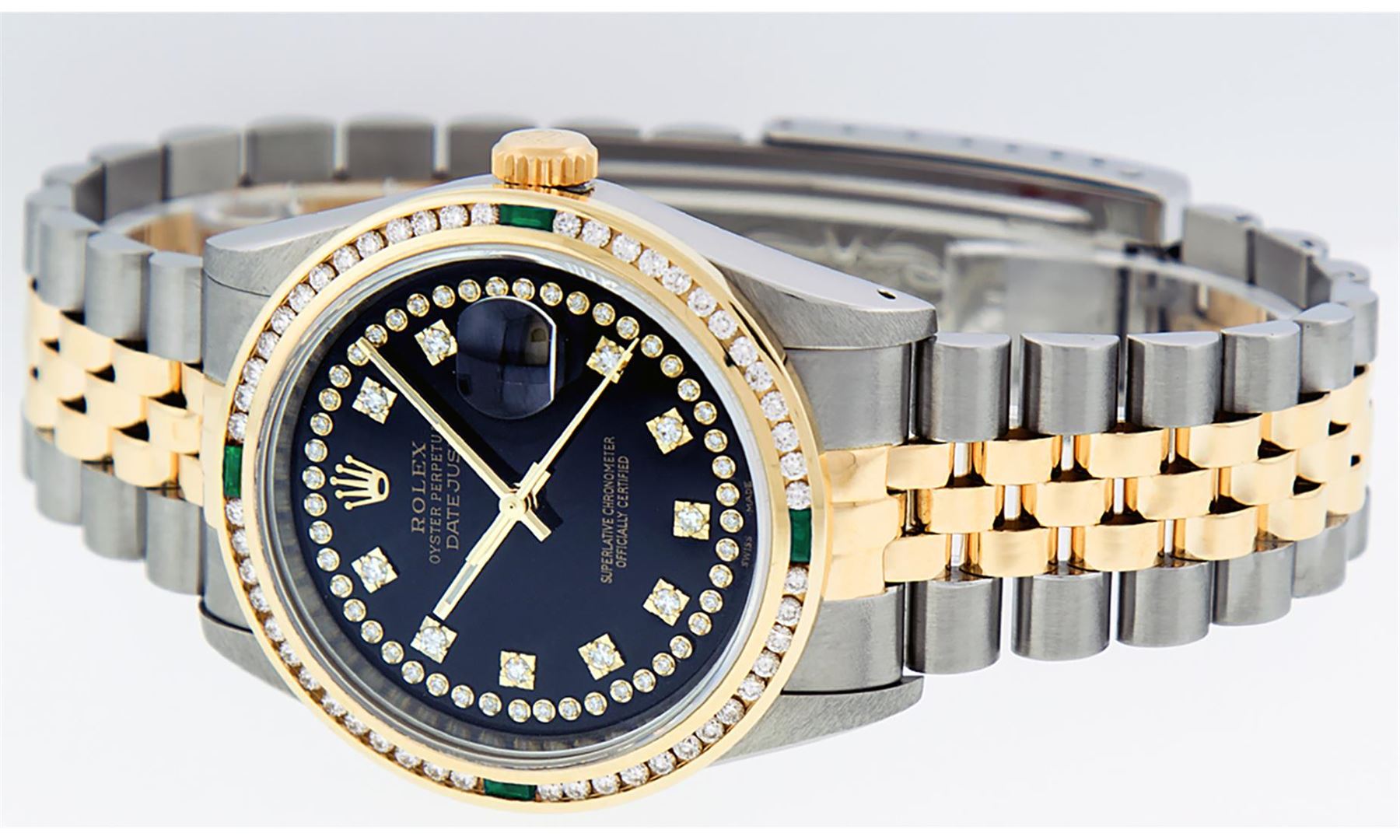 One Mens 14K Yellow Gold Two Tone Rolex Datejust Polished, Serviced & Electronically Tested, 14K Yellow Gold & Stainless Steel Case: 36mm, 14K Yellow Gold Crown, Custom Bezel: New 18K Yellow Gold Emerald Channel Set Diamond Bezel, Diamond Count: 52 Diamonds + 4 Emeralds, Total Weight 1.30 Carat, Clarity: SI-VS, Color: G to H. Custom Crystal: New Scratch Resistant Synthetic Sapphire Cyclops Lens. Custom Hands: New Luminecent Hands. Movement: Automatic Winding Movement Caliber 3035. Custom Dial: Black String Diamond Dial With Single Cut Diamonds, Diamond Count: 58 Diamonds in Dial. Date Window: 3 O'Clock Position Date Display, Quickset, Model: 16013 Datejust. Condition: G-6 Extra Fine. Bracelet:Two Tone 14K Yellow Gold & Stainless Steel Jubilee Band. Bright Polish. 7.0 Inch Length, Adjustable. Standard Clasp, With Rolex Logo. This Watch Has Been Serviced Time Tested And Is In Excellent Condition It Is Free Of All Scratches And Dents.