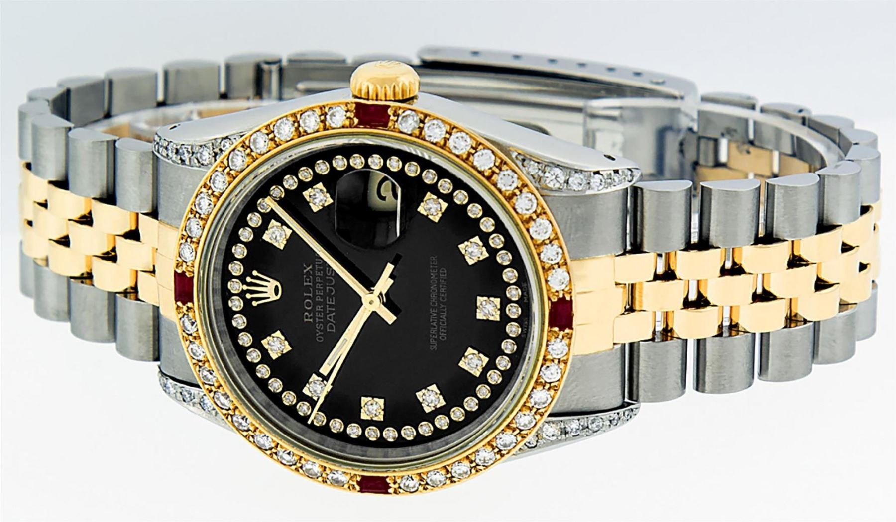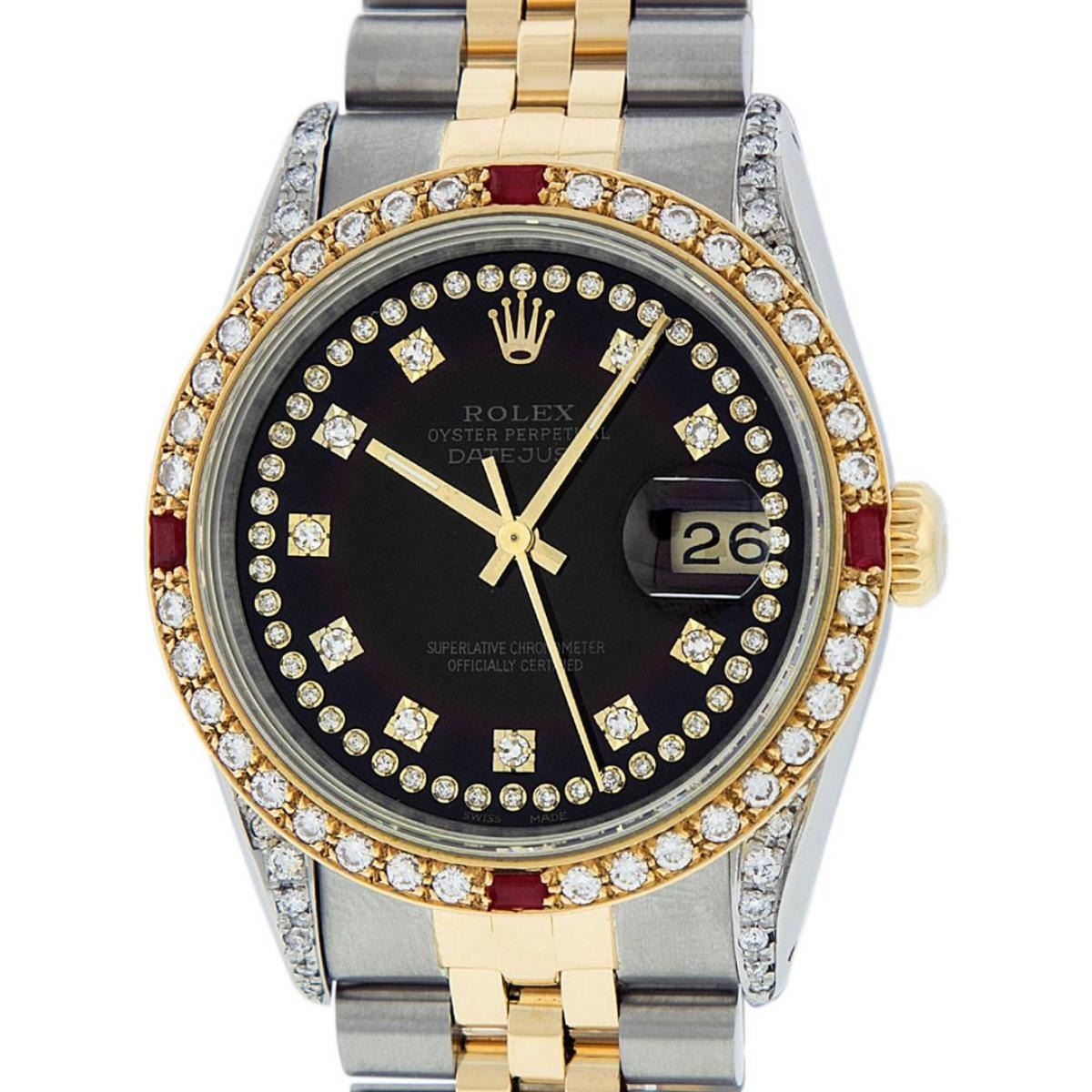One Mens 14K Yellow Gold Rolex Datejust Polished Bright with Satin Finish, Serviced & Electronically Tested, Stainless Steel Case: 36mm, Custom Diamond Lugs: 28 Diamonds On Lugs, Color: G to H, Clarity: SI-VS. Yellow Gold Crown, Custom Bezel: New 18K Yellow Gold Beadset Diamond + Ruby Bezel, Diamond + Stone Count: 36 Diamonds + 4 Rubies, Total Weight 1.00 Carat, Clarity: SI-VS, Color: G to H. Custom Crystal: New Scratch Resistant Synthetic Sapphire Cyclops Lens. Custom Hands: New Luminecent Hands. Movement: Automatic Winding Movement Caliber 3035. Custom Dial: Black Single Cut String Diamond Dial, Stone Count: 58 Diamonds In Dial, Color: G to H, Clarity: VS2. Date Window: 3 O'Clock Position Date Display, Quickset, Model: Datejust. Condition: G-6 Extra Fine. Bracelet: 14K Yellow Gold And Stainless Steel Jubilee Band. Bright Polish & Satin Finish. 7.0 Inch Length, Adjustable. Standard Clasp, With Rolex Logo. This Watch Has Been Serviced And Polished It Is Free Of All Scratches And Dents.