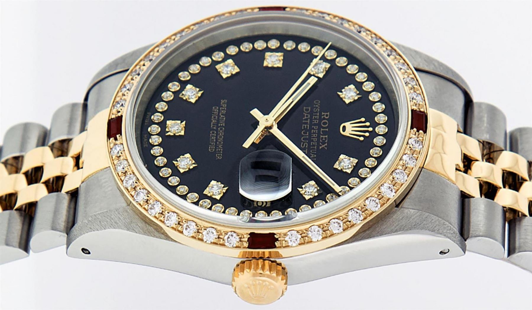 One Mens 14K Yellow Gold Two Tone Rolex Datejust Polished, Serviced & Electronically Tested, 14K Yellow Gold & Stainless Steel Case: 36mm, 14K Yellow Gold Crown, Custom Bezel: New 18K Yellow Gold Ruby Beadset Diamond Bezel, Diamond Count: 36 Diamonds + 4 Rubies In Bezel, Total Weight 1.0 Carat, Clarity: SI-VS, Color: G to H. Custom Crystal: New Scratch Resistant Synthetic Sapphire Cyclops Lens. Custom Hands: New Luminecent Hands. Movement: Automatic Winding Movement Caliber 3035. Custom Dial: Black String Single Cut Diamond Dial, Diamond Count: 58 Diamonds In Dial, Color: G to H, Clairty: VS2 Date Window: 3 O'Clock Position Date Display, Quickset, Model: 16013 Datejust, Condition: G-6 Extra Fine. Bracelet: Two Tone 14K Yellow Gold & Stainless Steel Jubilee Band. Bright Polish. 7.0 Inch Length, Adjustable. Standard Clasp, With Rolex Logo. This Watch Has Been Serviced Time Tested And Is In Excellent Condition It Is Free Of All Scratches And Dents.