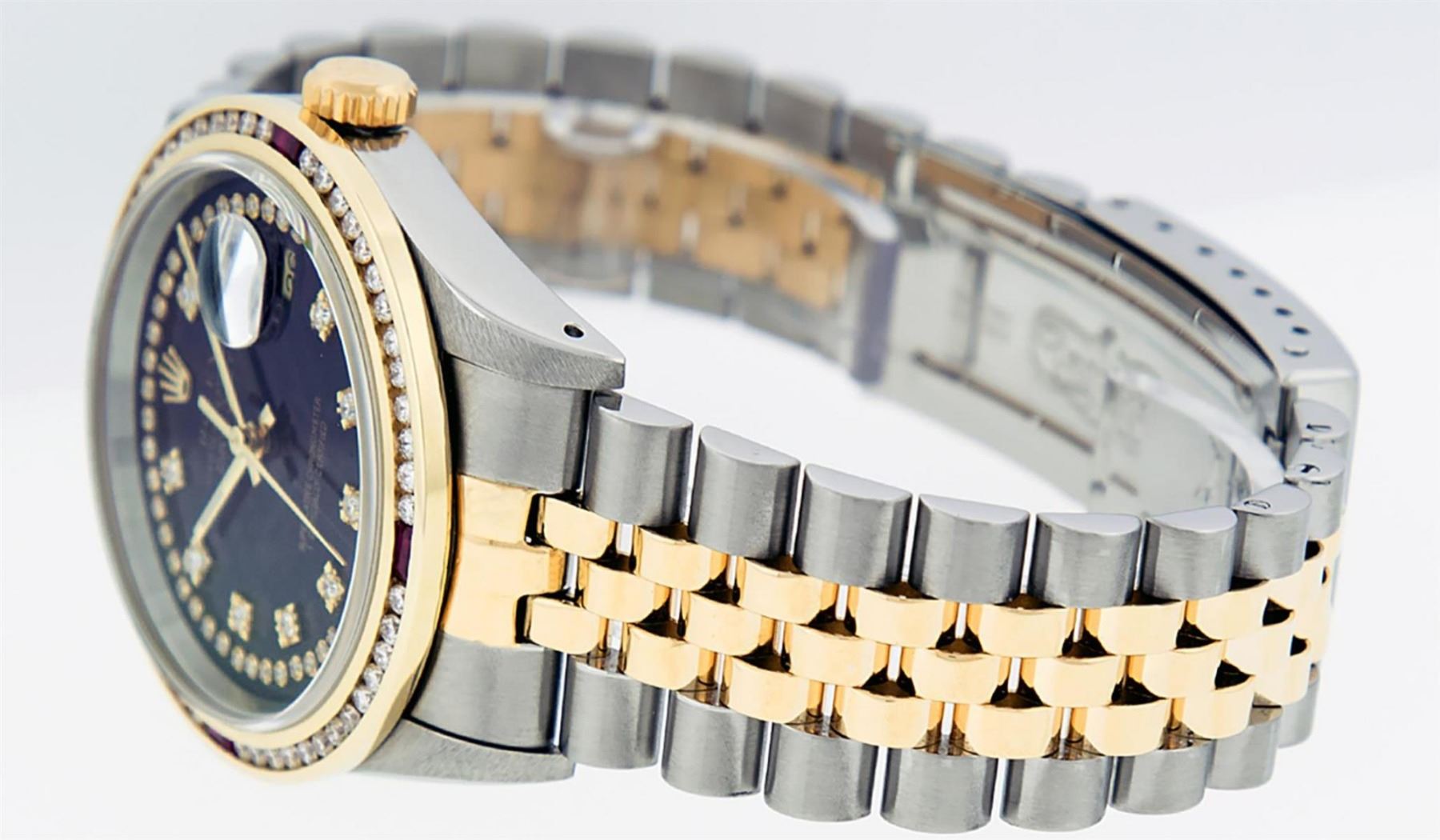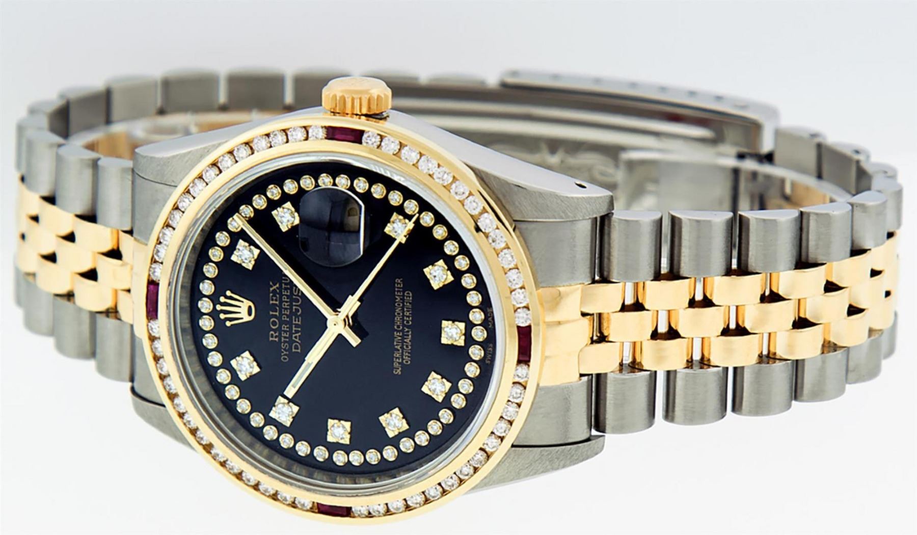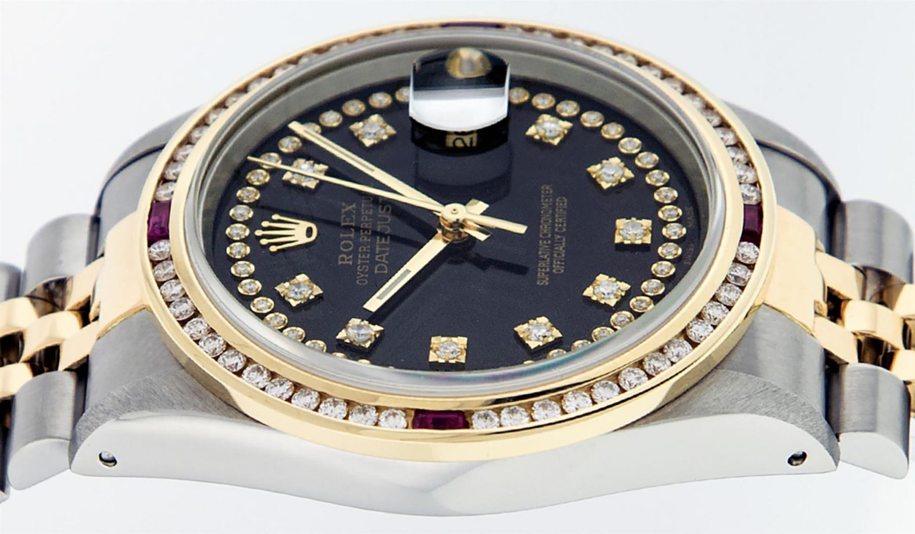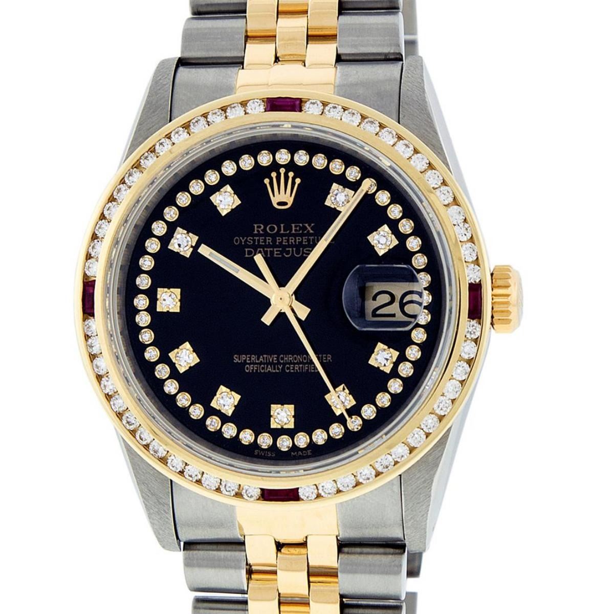 One Mens 14K Yellow Gold Two Tone Rolex Datejust Polished, Serviced & Electronically Tested, 14K Yellow Gold & Stainless Steel Case: 36mm, 14K Yellow Gold Crown, Custom Bezel: 18K Yellow Gold Ruby Channel Set Diamond Bezel, Diamond Count: 52 Diamonds + 4 Rubies, Total Weight 1.30 Carat, Clarity: SI-VS, Color: G to H. Custom Crystal: New Scratch Resistant Synthetic Sapphire Cyclops Lens. Custom Hands: New Luminecent Hands. Movement: Automatic Winding Movement Caliber 3035. Custom Dial: Black String Diamond Dial With Single Cut Diamonds, Diamond Count: 58 Diamonds in Dial. Date Window: 3 O'Clock Position Date Display, Quickset, Model: 16013 Datejust. Condition: G-6 Extra Fine. Bracelet:Two Tone 14K Yellow Gold & Stainless Steel Jubilee Band. Bright Polish. 7.0 Inch Length, Adjustable. Standard Clasp, With Rolex Logo. This Watch Has Been Serviced Time Tested And Is In Excellent Condition It Is Free Of All Scratches And Dents.