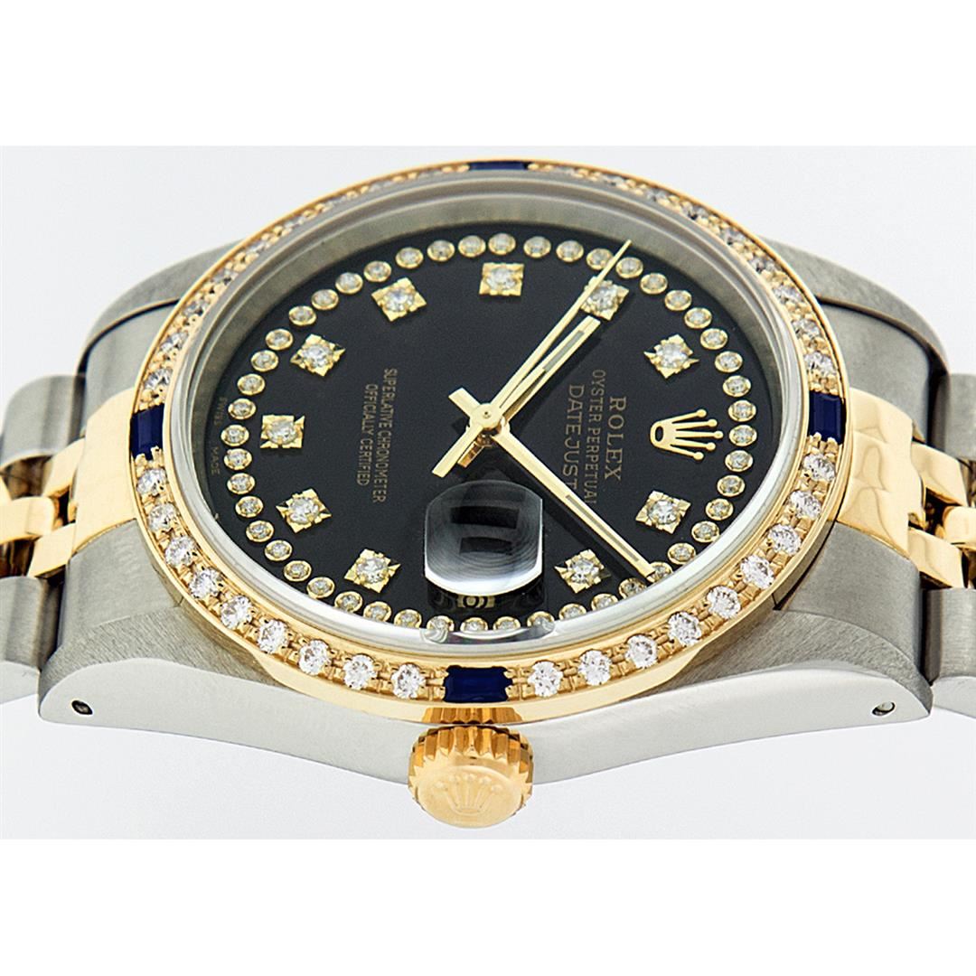 One Mens 14K Yellow Gold Two Tone Rolex Datejust Polished, Serviced & Electronically Tested, 14K Yellow Gold & Stainless Steel Case: 36mm, 14K Yellow Gold Crown, Custom Bezel: 18K Yellow Gold Sapphire Beadset Diamond Bezel, Diamond Count: 36 Diamonds + 4 Sapphires, Total Weight 1.0 Carat, Clarity: SI-VS, Color: G to H. Custom Crystal: New Scratch Resistant Synthetic Sapphire Cyclops Lens. Custom Hands: New Luminecent Hands. Movement: Automatic Winding Movement Caliber 3035. Custom Dial: Black String Single Cut Diamond Dial, Diamond Count: 58 Diamonds In Dial, Color: G to H, Clairty: SI-VS Date Window: 3 O'Clock Position Date Display, Quickset, Model: 16013 Datejust, Condition: G-6 Extra Fine. Bracelet: Two Tone 14K Yellow Gold & Stainless Steel Jubilee Band. Bright Polish. 7.0 Inch Length, Adjustable. Standard Clasp, With Rolex Logo. This Watch Has Been Serviced Time Tested And Is In Excellent Condition It Is Free Of All Scratches And Dents.