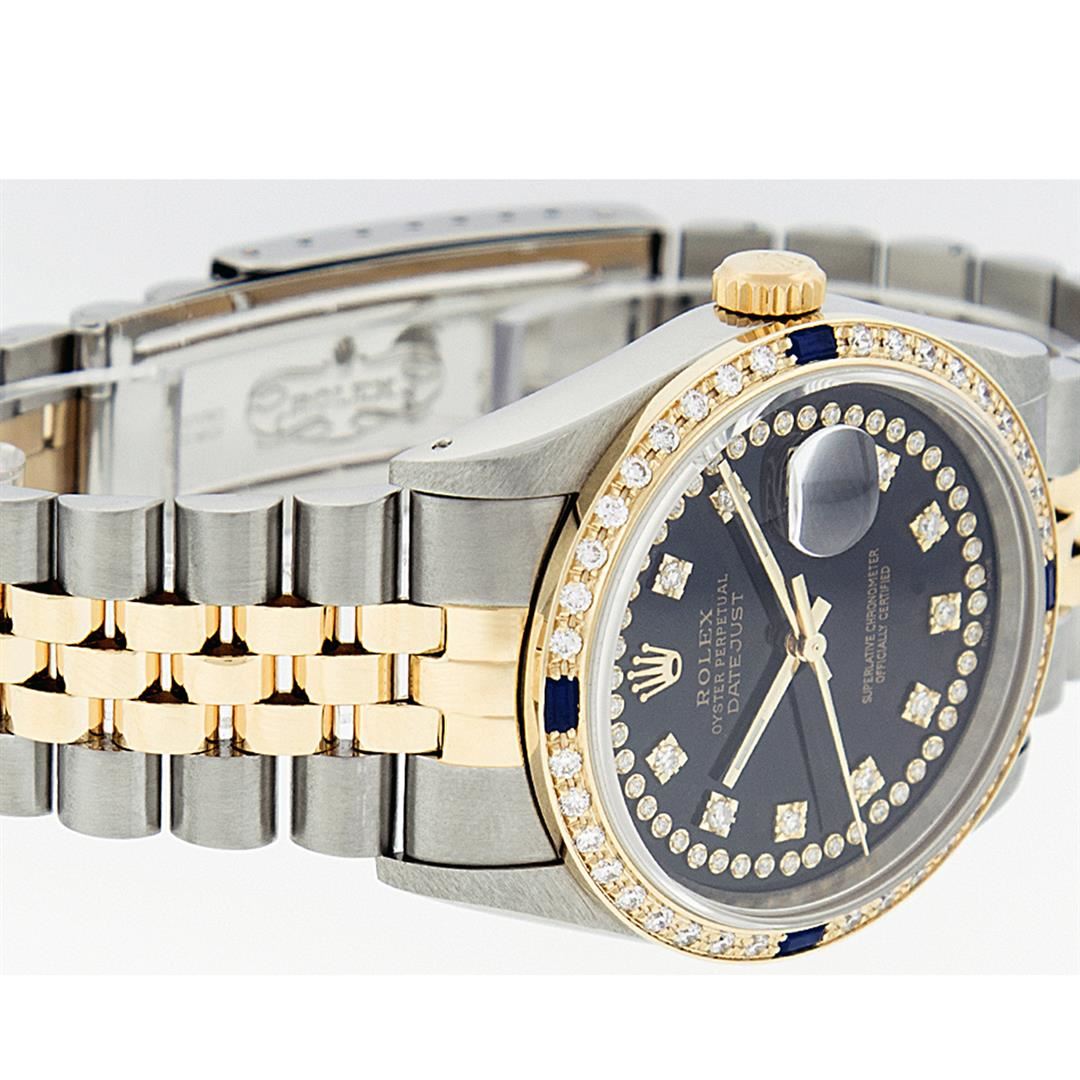 One Mens 14K Yellow Gold Two Tone Rolex Datejust Polished, Serviced & Electronically Tested, 14K Yellow Gold & Stainless Steel Case: 36mm, 14K Yellow Gold Crown, Custom Bezel: 18K Yellow Gold Sapphire Beadset Diamond Bezel, Diamond Count: 36 Diamonds + 4 Sapphires, Total Weight 1.0 Carat, Clarity: SI-VS, Color: G to H. Custom Crystal: New Scratch Resistant Synthetic Sapphire Cyclops Lens. Custom Hands: New Luminecent Hands. Movement: Automatic Winding Movement Caliber 3035. Custom Dial: Black String Single Cut Diamond Dial, Diamond Count: 58 Diamonds In Dial, Color: G to H, Clairty: SI-VS Date Window: 3 O'Clock Position Date Display, Quickset, Model: 16013 Datejust, Condition: G-6 Extra Fine. Bracelet: Two Tone 14K Yellow Gold & Stainless Steel Jubilee Band. Bright Polish. 7.0 Inch Length, Adjustable. Standard Clasp, With Rolex Logo. This Watch Has Been Serviced Time Tested And Is In Excellent Condition It Is Free Of All Scratches And Dents.
