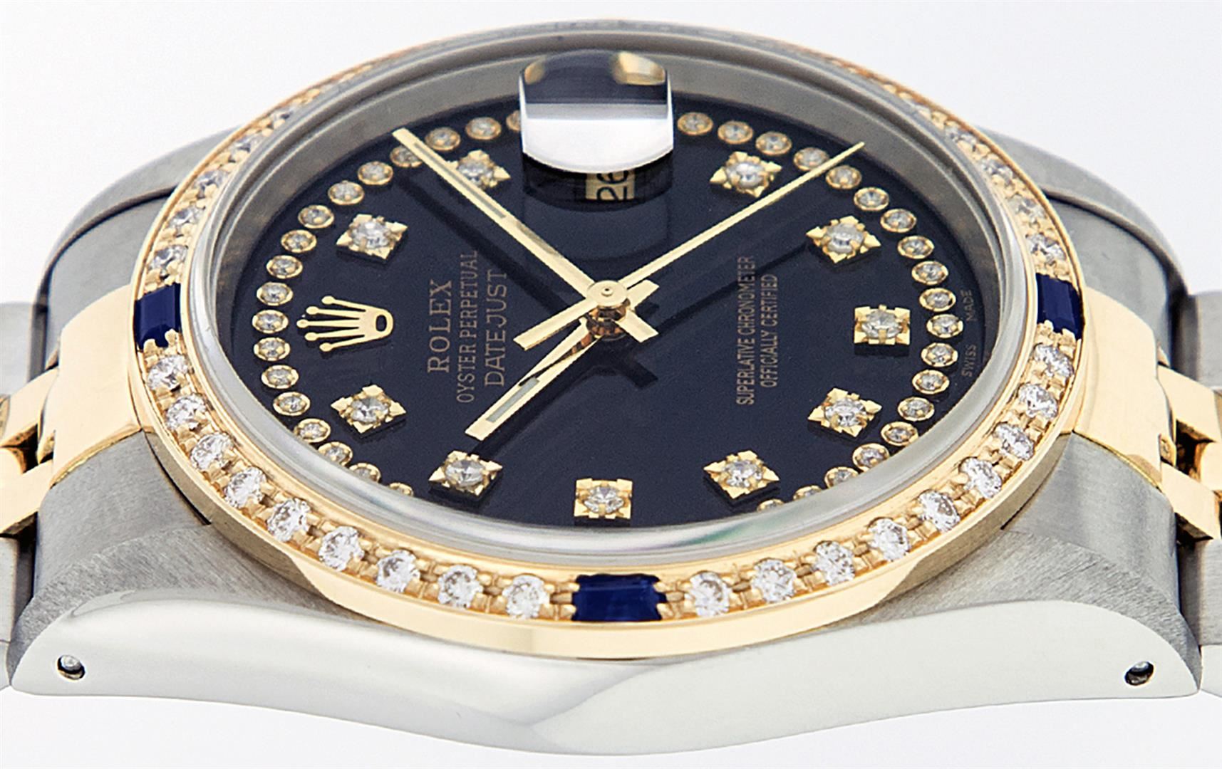 One Mens 14K Yellow Gold Two Tone Rolex Datejust Polished, Serviced & Electronically Tested, 14K Yellow Gold & Stainless Steel Case: 36mm, 14K Yellow Gold Crown, Custom Bezel: 18K Yellow Gold Sapphire Beadset Diamond Bezel, Diamond Count: 36 Diamonds + 4 Sapphires, Total Weight 1.0 Carat, Clarity: SI-VS, Color: G to H. Custom Crystal: New Scratch Resistant Synthetic Sapphire Cyclops Lens. Custom Hands: New Luminecent Hands. Movement: Automatic Winding Movement Caliber 3035. Custom Dial: Black String Single Cut Diamond Dial, Diamond Count: 58 Diamonds In Dial, Color: G to H, Clairty: SI-VS Date Window: 3 O'Clock Position Date Display, Quickset, Model: 16013 Datejust, Condition: G-6 Extra Fine. Bracelet: Two Tone 14K Yellow Gold & Stainless Steel Jubilee Band. Bright Polish. 7.0 Inch Length, Adjustable. Standard Clasp, With Rolex Logo. This Watch Has Been Serviced Time Tested And Is In Excellent Condition It Is Free Of All Scratches And Dents.