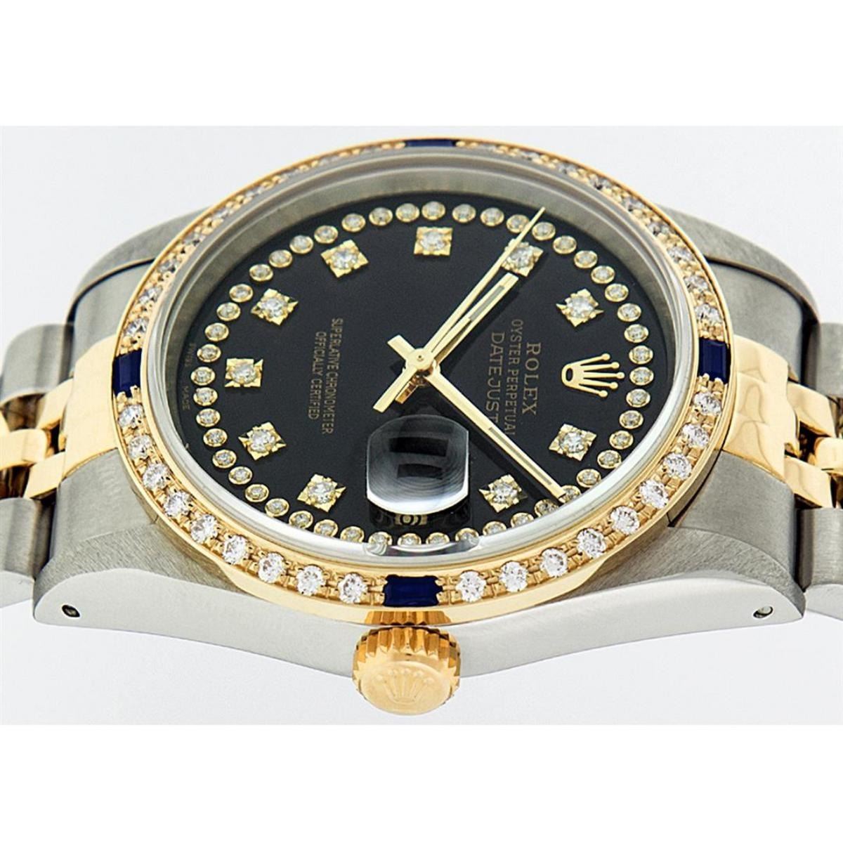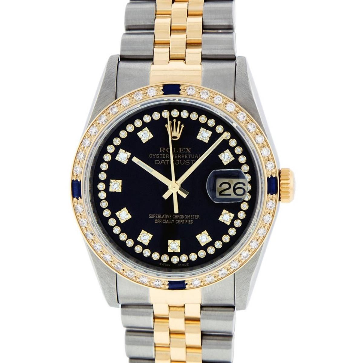 One Mens 14K Yellow Gold Two Tone Rolex Datejust Polished, Serviced & Electronically Tested, 14K Yellow Gold & Stainless Steel Case: 36mm, 14K Yellow Gold Crown, Custom Bezel: 18K Yellow Gold Sapphire Beadset Diamond Bezel, Diamond Count: 36 Diamonds + 4 Sapphires, Total Weight 1.0 Carat, Clarity: SI-VS, Color: G to H. Custom Crystal: New Scratch Resistant Synthetic Sapphire Cyclops Lens. Custom Hands: New Luminecent Hands. Movement: Automatic Winding Movement Caliber 3035. Custom Dial: Black String Single Cut Diamond Dial, Diamond Count: 58 Diamonds In Dial, Color: G to H, Clairty: SI-VS Date Window: 3 O'Clock Position Date Display, Quickset, Model: 16013 Datejust, Condition: G-6 Extra Fine. Bracelet: Two Tone 14K Yellow Gold & Stainless Steel Jubilee Band. Bright Polish. 7.0 Inch Length, Adjustable. Standard Clasp, With Rolex Logo. This Watch Has Been Serviced Time Tested And Is In Excellent Condition It Is Free Of All Scratches And Dents.
