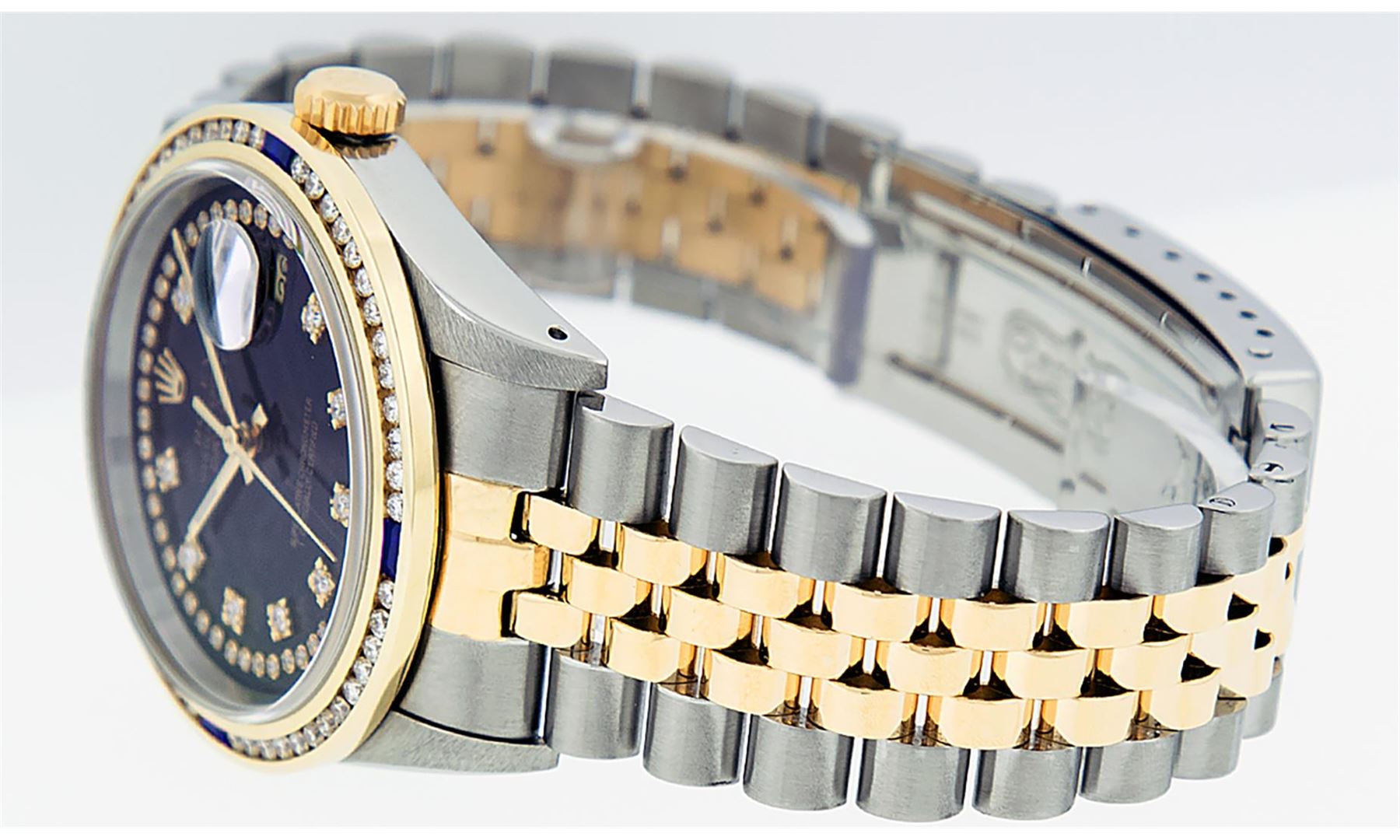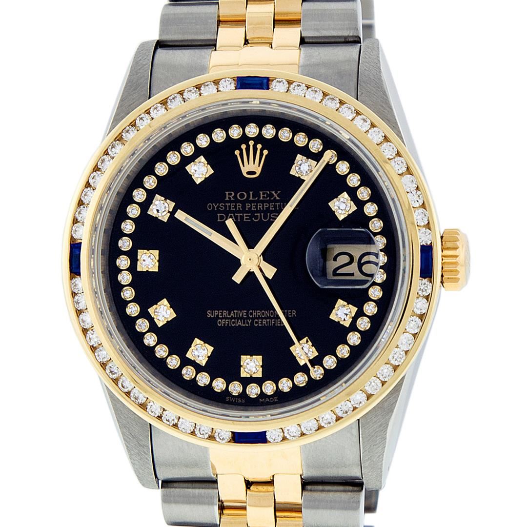 One Mens 14K Yellow Gold Two Tone Rolex Datejust Polished, Serviced & Electronically Tested, 14K Yellow Gold & Stainless Steel Case: 36mm, 14K Yellow Gold Crown, Custom Bezel: New 18K Yellow Gold Sapphire Channel Set Diamond Bezel, Diamond Count: 52 Diamonds + 4 Sapphires, Total Weight 1.30 Carat, Clarity: SI-VS, Color: G to H. Custom Crystal: New Scratch Resistant Synthetic Sapphire Cyclops Lens. Custom Hands: New Luminecent Hands. Movement: Automatic Winding Movement Caliber 3035. Custom Dial: Black String Diamond Dial With Single Cut Diamonds, Diamond Count: 58 Diamonds in Dial. Date Window: 3 O'Clock Position Date Display,�Quickset, Model: 16013 Datejust. Condition: G-6 Extra Fine. Bracelet:Two Tone 14K Yellow Gold & Stainless Steel Jubilee Band. Bright Polish.�7.0 Inch Length, Adjustable. Standard Clasp, With Rolex Logo. This Watch Has Been Serviced Time Tested And Is In Excellent Condition It Is Free Of All Scratches And Dents.