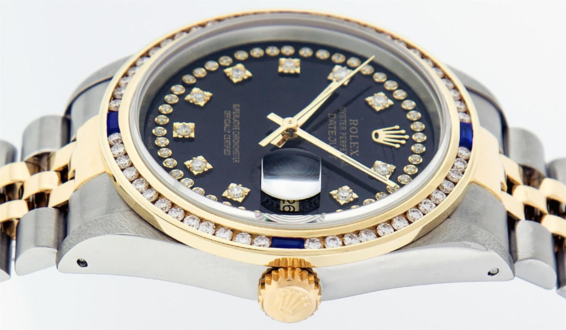 One Mens 14K Yellow Gold Two Tone Rolex Datejust Polished, Serviced & Electronically Tested, 14K Yellow Gold & Stainless Steel Case: 36mm, 14K Yellow Gold Crown, Custom Bezel: New 18K Yellow Gold Sapphire Channel Set Diamond Bezel, Diamond Count: 52 Diamonds + 4 Sapphires, Total Weight 1.30 Carat, Clarity: SI-VS, Color: G to H. Custom Crystal: New Scratch Resistant Synthetic Sapphire Cyclops Lens. Custom Hands: New Luminecent Hands. Movement: Automatic Winding Movement Caliber 3035. Custom Dial: Black String Diamond Dial With Single Cut Diamonds, Diamond Count: 58 Diamonds in Dial. Date Window: 3 O'Clock Position Date Display, Quickset, Model: 16013 Datejust. Condition: G-6 Extra Fine. Bracelet:Two Tone 14K Yellow Gold & Stainless Steel Jubilee Band. Bright Polish. 7.0 Inch Length, Adjustable. Standard Clasp, With Rolex Logo. This Watch Has Been Serviced Time Tested And Is In Excellent Condition It Is Free Of All Scratches And Dents.