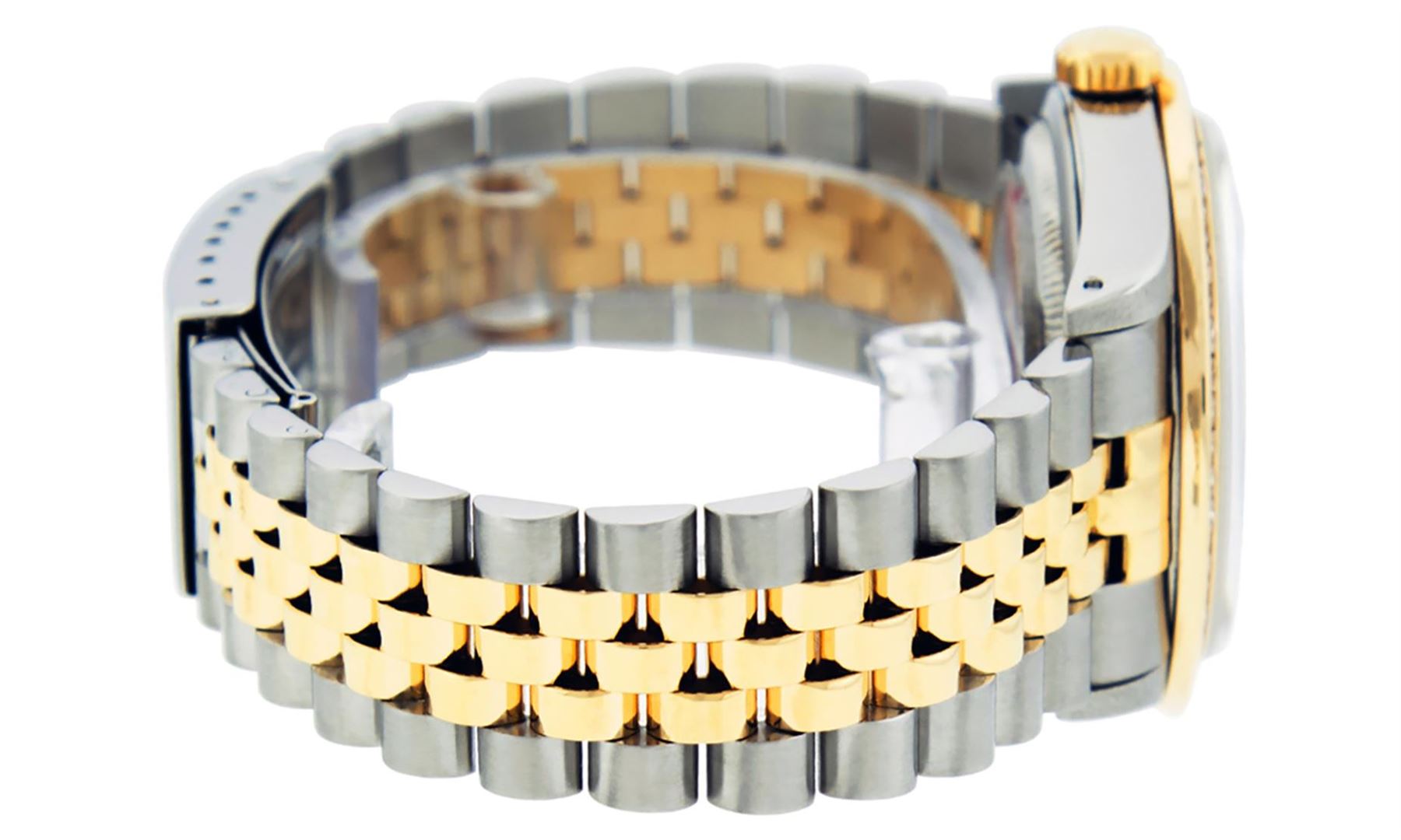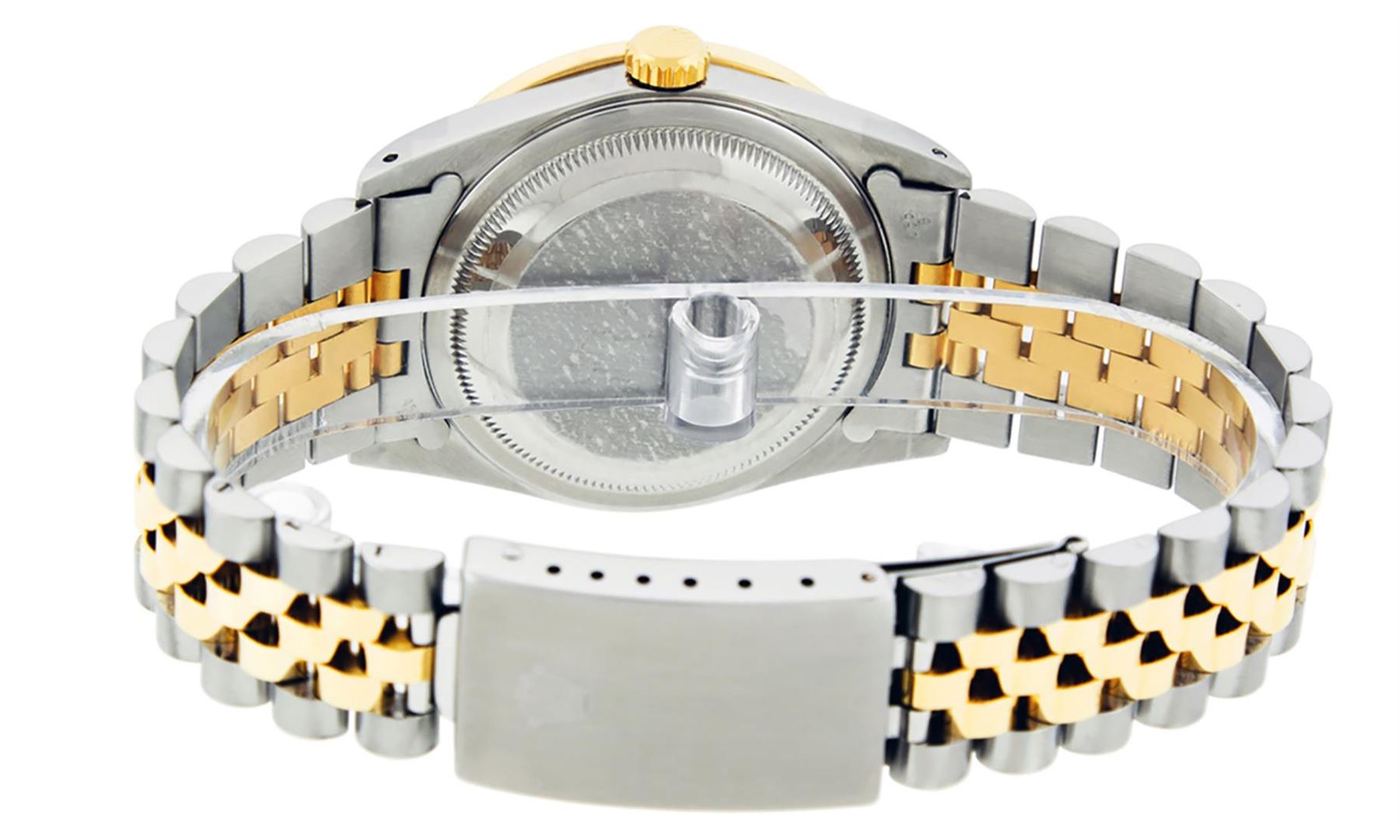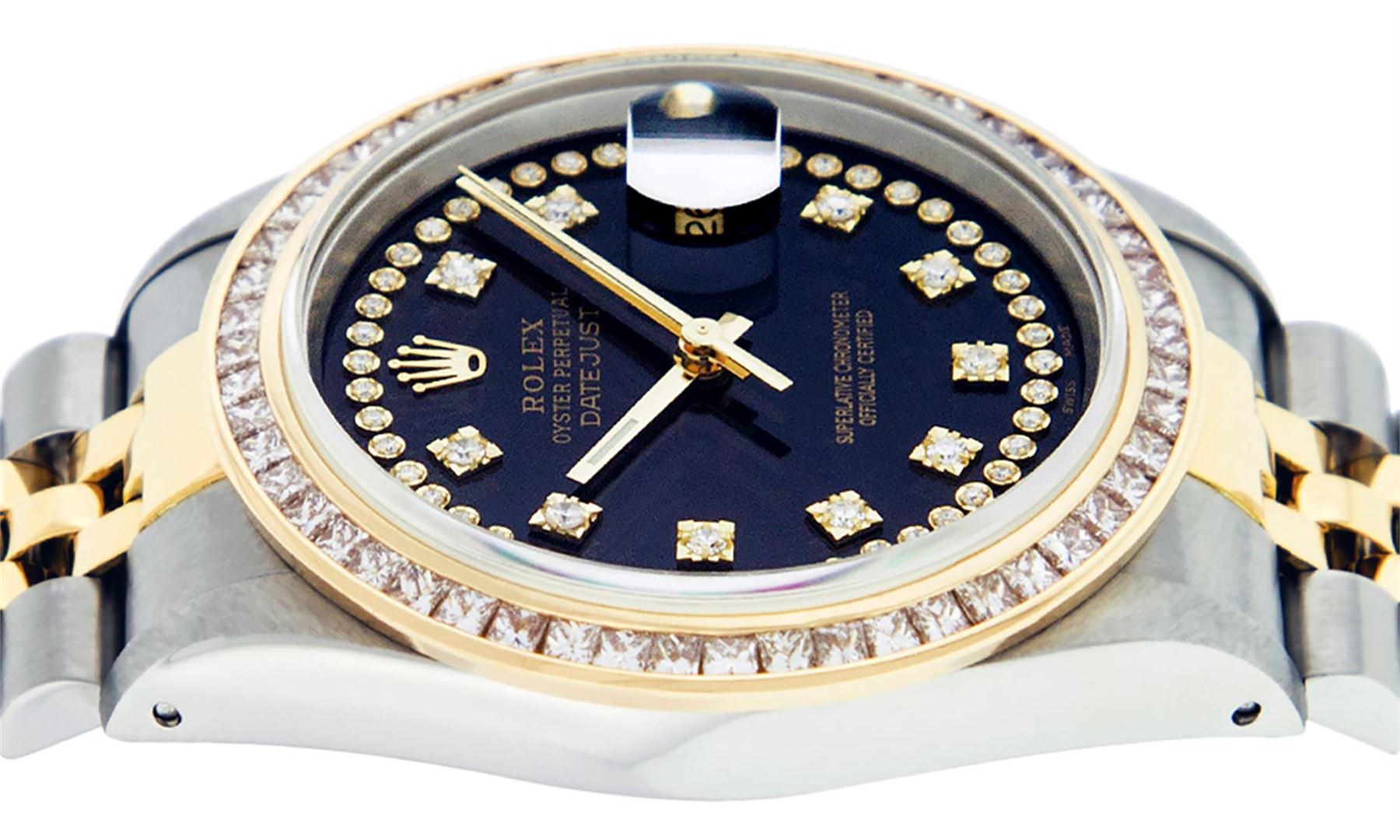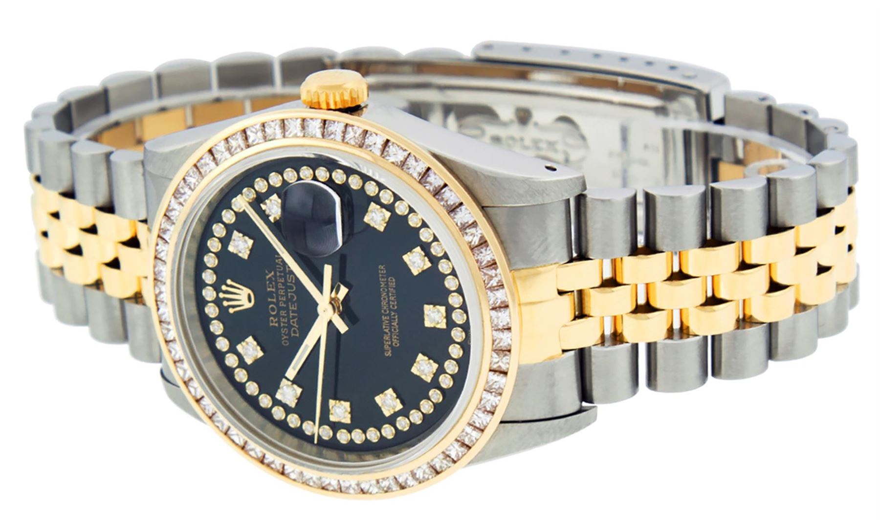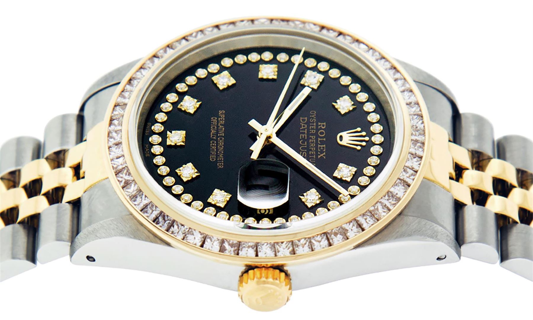 One Mens 14K Yellow Gold Two Tone Rolex Datejust Polished Bright with Satin Finish, Serviced & Electronically Tested, 14K Yellow Gold And Stainless Steel Case: 36mm, 14K Yellow Gold Crown, Custom Bezel: New 14K Yellow Gold Princess Cut Diamond Bezel, Diamond Count: 53 Diamonds, Total Weight 2.75 Carat, Clarity: SI-VS, Color: G to H. Custom Crystal: New Synthetic Sapphire Cyclops Lens. Custom Hands: New Luminecent Hands. Movement: Automatic Winding Movement Caliber 3035. Custom Dial: Black String Diamond Dial, Diamond Count: 58 Diamond in Dial, Dial Color: G To H In Color, Clarity: VS2. Date Window: 3 O'Clock Position Date Display, Quickset, Model: 16013 Datejust. Condition: G-6 Extra Fine. Bracelet: 14K Yellow Gold And Stainless Steel Jubilee. Bright Polish & Satin Finish. 7.0 Inch Length, Adjustable. Standard Clasp, With Rolex Logo. This Watch Has Been Serviced and Polished And It Is Free Of All Dents And Scratches And Has Been Time Tested.