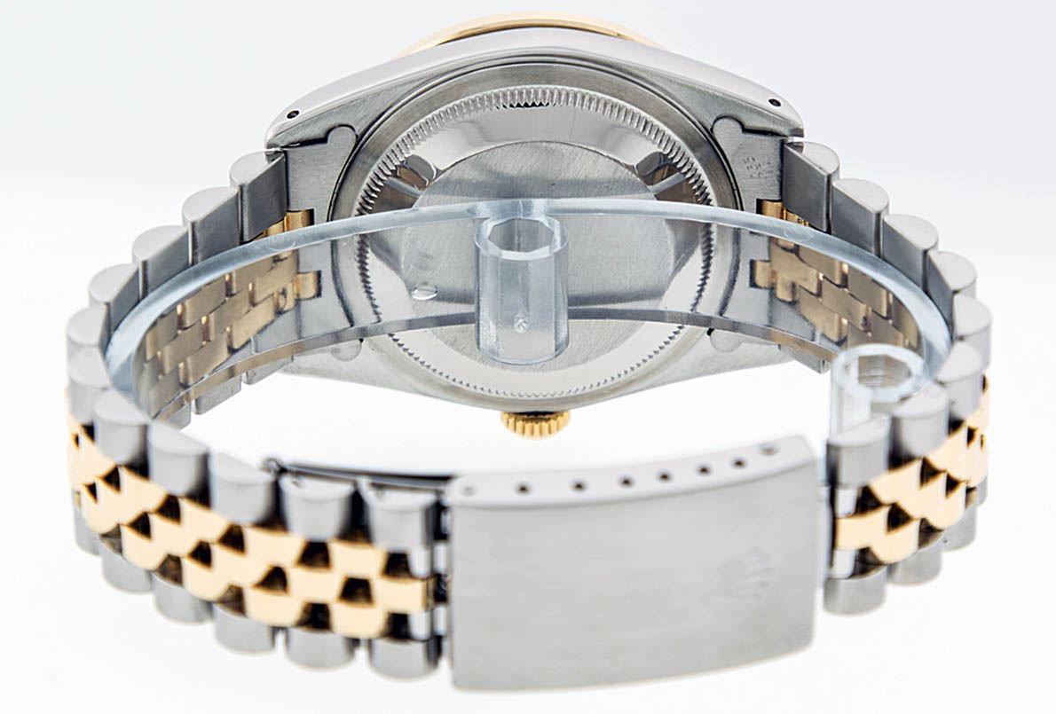 One Mens 14K Yellow Gold Two Tone Rolex Datejust Polished, Serviced & Electronically Tested, 14K Yellow Gold & Stainless Steel Case: 36mm, 14K Yellow Gold Crown, Custom Bezel: 18K Yellow Gold Beadset Diamond Bezel, Diamond Count: 44 Diamonds, Total Weight 1.00 Carat, Clarity: SI-VS, Color: G to H. Custom Crystal: Synthetic Sapphire Cyclops Lens. Custom Hands: New Luminecent Hands. Movement: Automatic Winding Movement Caliber 3035. Custom Dial: Black VS Single Cut String Diamond Dial, Diamond Count: 58 Diamonds in Dial G To H In Color, VS In Clarity. Date Window: 3 O'Clock Position Date Display, Quickset, Model: 16013 Datejust. Condition: G-6 Extra Fine. Bracelet:Two Tone 14K Yellow Gold & Stainless Steel Jubilee. Bright Polish. 7.0 Inch Length, Adjustable. Standard Clasp, With Rolex Logo. This Watch Has Been Serviced Time Tested And Is In Excellent Condition It Is Free Of All Scratches And Dents.