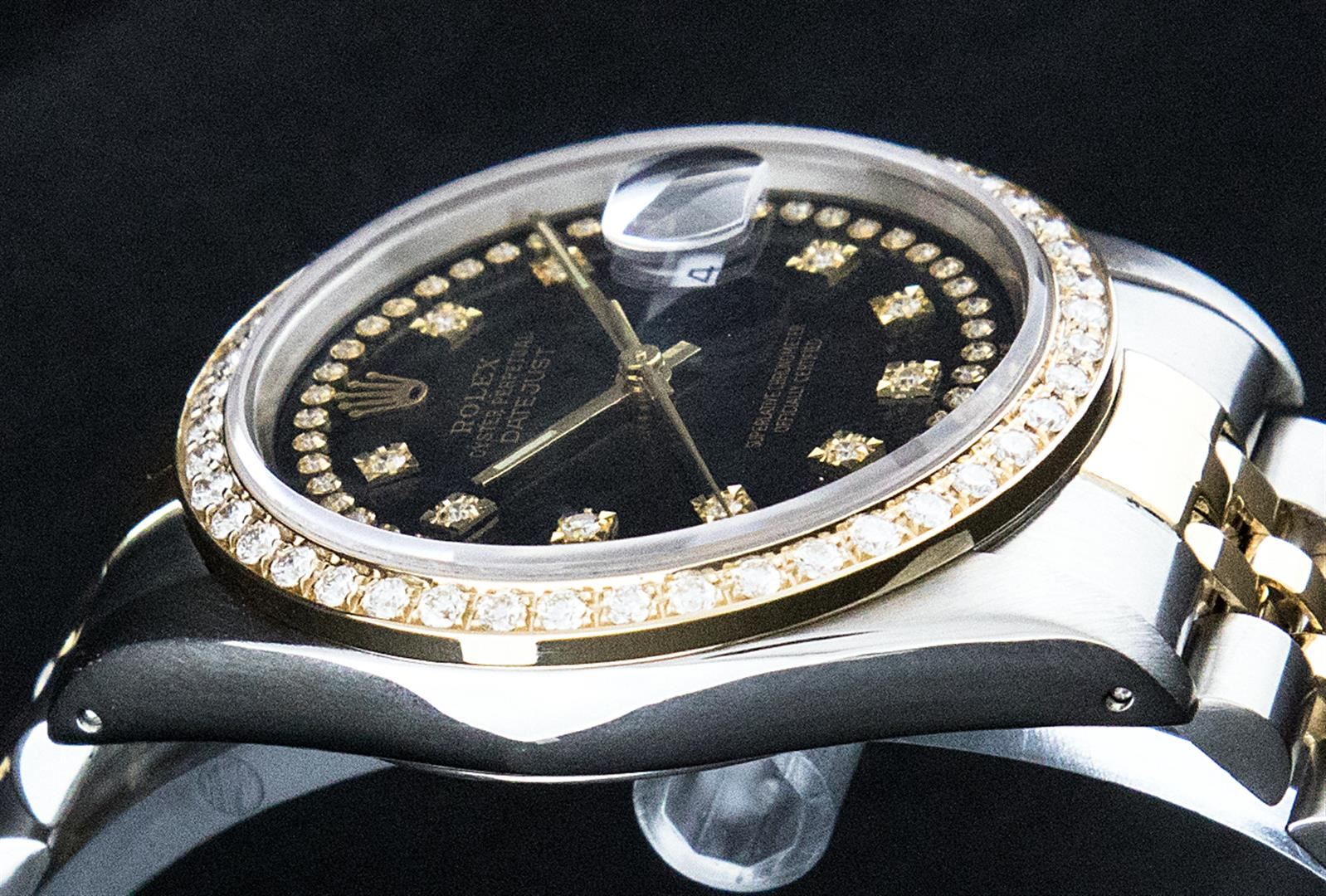 One Mens 14K Yellow Gold Two Tone Rolex Datejust Polished, Serviced & Electronically Tested, 14K Yellow Gold & Stainless Steel Case: 36mm, 14K Yellow Gold Crown, Custom Bezel: 18K Yellow Gold Beadset Diamond Bezel, Diamond Count: 44 Diamonds In Bezel, Total Weight 1.00 Carat, Clarity: SI-VS, Color: G to H. New Custom Crystal: Scratch Resistant Synthetic Sapphire Cyclops Lens. Custom Hands: New Luminecent Hands. Movement: Automatic Winding Movement Caliber 3035. Custom Dial: Black VS Single Cut String Diamond Dial, Diamond Count: 58 Diamonds in Dial G To H In Color, VS In Clarity. Date Window: 3 O'Clock Position Date Display, Quickset, Model: Datejust. Condition: G-6 Extra Fine. Bracelet:Two Tone 14K Yellow Gold & Stainless Steel Jubilee. Bright Polish. 7.0 Inch Length, Adjustable. Standard Clasp, With Rolex Logo. This Watch Has Been Serviced Time Tested And Is In Excellent Condition It Is Free Of All Scratches And Dents.