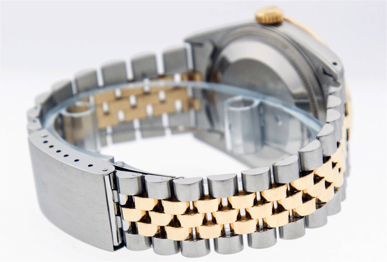 One Mens 14K Yellow Gold Two Tone Rolex Datejust Polished, Serviced & Electronically Tested, 14K Yellow Gold & Stainless Steel Case: 36mm, 14K Yellow Gold Crown, Custom Bezel: 18K Yellow Gold Beadset Diamond Bezel, Diamond Count: 44 Diamonds, Total Weight 1.00 Carat, Clarity: SI-VS, Color: G to H. Custom Crystal: Synthetic Sapphire Cyclops Lens. Custom Hands: New Luminecent Hands. Movement: Automatic Winding Movement Caliber 3035. Custom Dial: Black VS Single Cut String Diamond Dial, Diamond Count: 58 Diamonds in Dial G To H In Color, VS In Clarity. Date Window: 3 O'Clock Position Date Display, Quickset, Model: 16013 Datejust. Condition: G-6 Extra Fine. Bracelet:Two Tone 14K Yellow Gold & Stainless Steel Jubilee. Bright Polish. 7.0 Inch Length, Adjustable. Standard Clasp, With Rolex Logo. This Watch Has Been Serviced Time Tested And Is In Excellent Condition It Is Free Of All Scratches And Dents.
