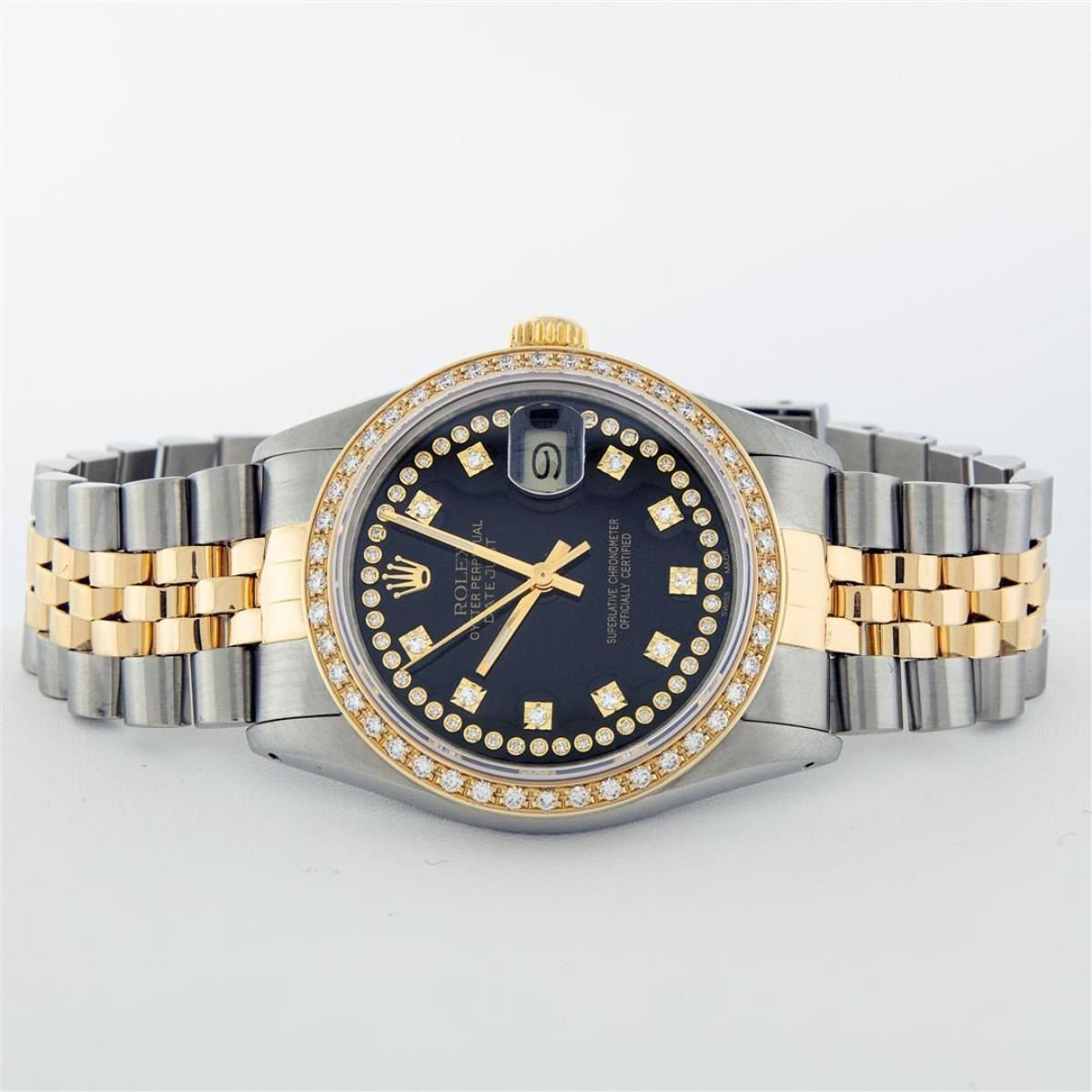 One Mens 14K Yellow Gold Two Tone Rolex Datejust Polished, Serviced & Electronically Tested, 14K Yellow Gold & Stainless Steel Case: 36mm, 14K Yellow Gold Crown, Custom Bezel: 18K Yellow Gold Beadset Diamond Bezel, Diamond Count: 44 Diamonds, Total Weight 1.00 Carat, Clarity: SI-VS, Color: G to H. Custom Crystal: Synthetic Sapphire Cyclops Lens. Custom Hands: New Luminecent Hands. Movement: Automatic Winding Movement Caliber 3035. Custom Dial: Black VS Single Cut String Diamond Dial, Diamond Count: 58 Diamonds in Dial G To H In Color, VS In Clarity. Date Window: 3 O'Clock Position Date Display, Quickset, Model: 16013 Datejust. Condition: G-6 Extra Fine. Bracelet:Two Tone 14K Yellow Gold & Stainless Steel Jubilee. Bright Polish. 7.0 Inch Length, Adjustable. Standard Clasp, With Rolex Logo. This Watch Has Been Serviced Time Tested And Is In Excellent Condition It Is Free Of All Scratches And Dents. This Watch Comes With A Rolex Box And Appraisal.