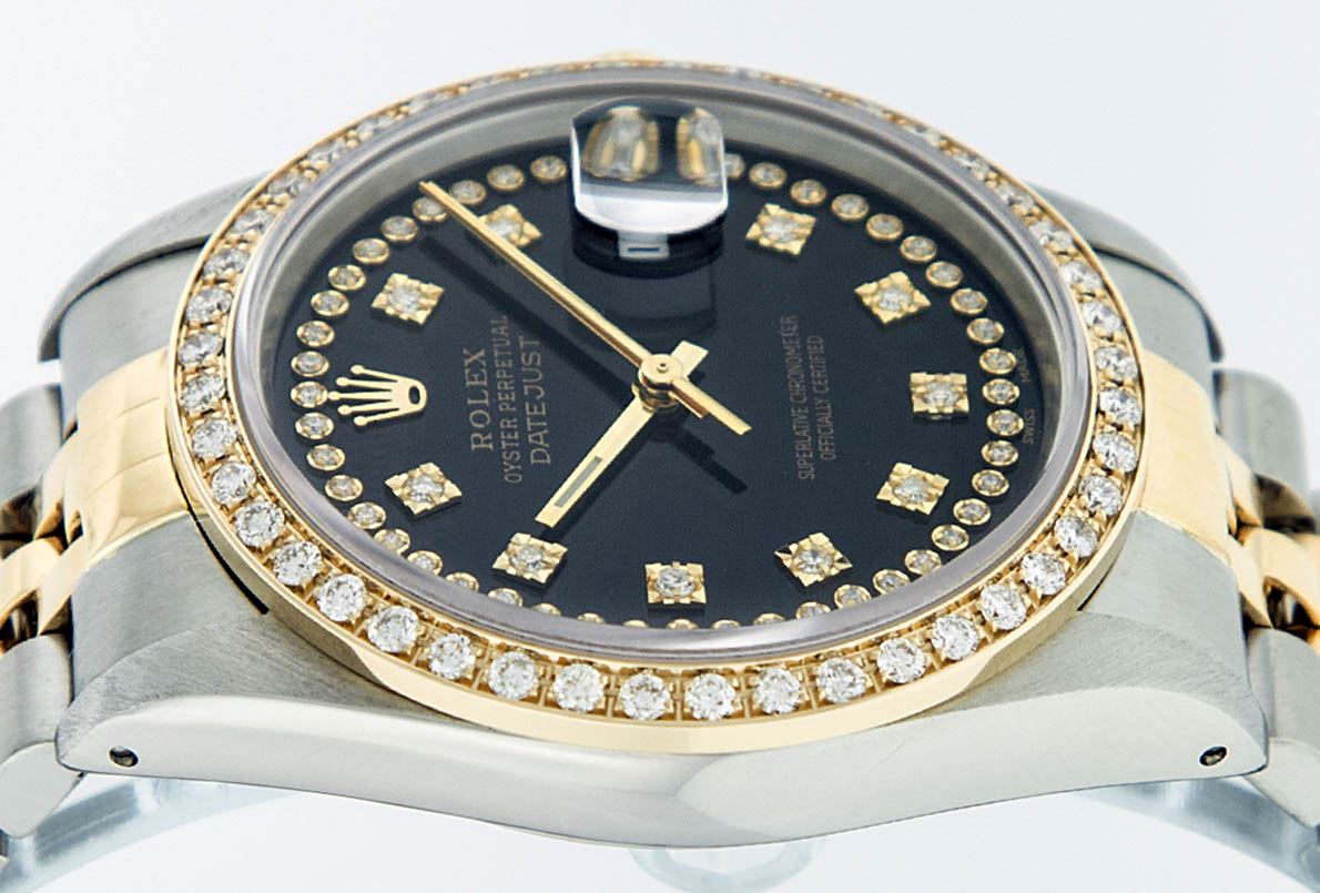 One Mens 14K Yellow Gold Two Tone Rolex Datejust Polished, Serviced & Electronically Tested, 14K Yellow Gold & Stainless Steel Case: 36mm, 14K Yellow Gold Crown, Custom Bezel: 18K Yellow Gold Beadset Diamond Bezel, Diamond Count: 44 Diamonds, Total Weight 1.00 Carat, Clarity: SI-VS, Color: G to H. Custom Crystal: Synthetic Sapphire Cyclops Lens. Custom Hands: New Luminecent Hands. Movement: Automatic Winding Movement Caliber 3035. Custom Dial: Black VS Single Cut String Diamond Dial, Diamond Count: 58 Diamonds in Dial G To H In Color, VS In Clarity. Date Window: 3 O'Clock Position Date Display, Quickset, Model: 16013 Datejust. Condition: G-6 Extra Fine. Bracelet:Two Tone 14K Yellow Gold & Stainless Steel Jubilee. Bright Polish. 7.0 Inch Length, Adjustable. Standard Clasp, With Rolex Logo. This Watch Has Been Serviced Time Tested And Is In Excellent Condition It Is Free Of All Scratches And Dents.