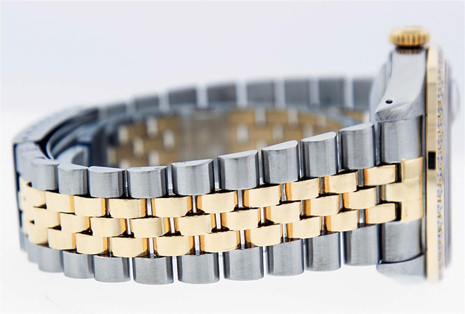 One Mens 14K Yellow Gold Two Tone Rolex Datejust Polished, Serviced & Electronically Tested, 14K Yellow Gold & Stainless Steel Case: 36mm, 14K Yellow Gold Crown, Custom Bezel: 18K Yellow Gold Beadset Diamond Bezel, Diamond Count: 44 Diamonds, Total Weight 1.00 Carat, Clarity: SI-VS, Color: G to H. Custom Crystal: Synthetic Sapphire Cyclops Lens. Custom Hands: New Luminecent Hands. Movement: Automatic Winding Movement Caliber 3035. Custom Dial: Black VS Single Cut String Diamond Dial, Diamond Count: 58 Diamonds in Dial G To H In Color, VS In Clarity. Date Window: 3 O'Clock Position Date Display, Quickset, Model: 16013 Datejust. Condition: G-6 Extra Fine. Bracelet:Two Tone 14K Yellow Gold & Stainless Steel Jubilee. Bright Polish. 7.0 Inch Length, Adjustable. Standard Clasp, With Rolex Logo. This Watch Has Been Serviced Time Tested And Is In Excellent Condition It Is Free Of All Scratches And Dents.