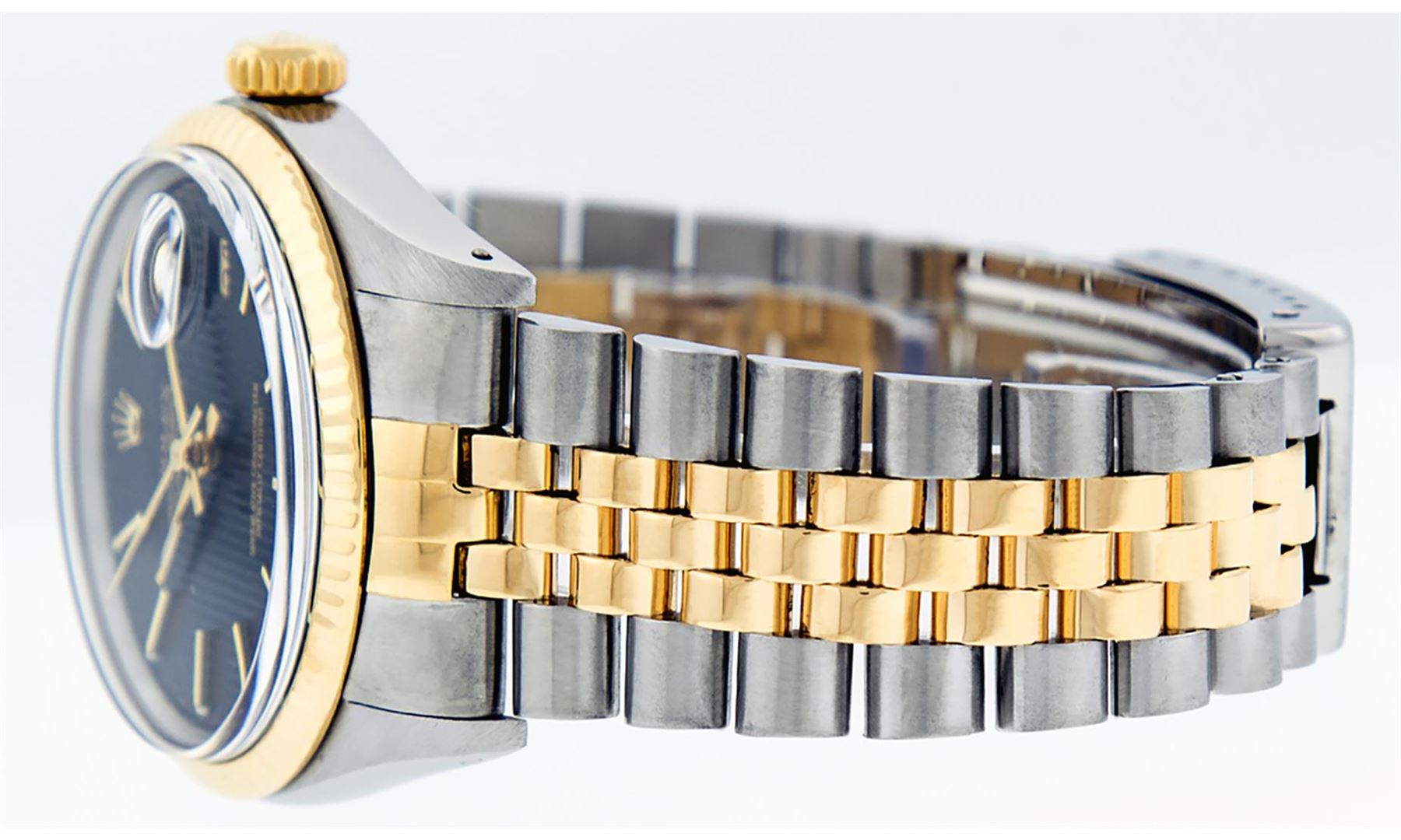 One Mens 14K Yellow Gold Two Tone Rolex Datejust Polished, Serviced & Electronically Tested, 14K Yellow Gold & Stainless Steel Case: 36mm,14K Yellow Gold Crown, Bezel: 14K Yellow Gold Fluted Bezel. Custom Crystal: New Acrylic Cyclops Lens. Custom Hands: New Luminecent Hands. Movement: Automatic Winding Movement Caliber 3035. Dial: Black Tapestry Dial With Index Hour Markers and Small Track With Lumi Dots. Date Window: 3 O'Clock Position Date Display, Quickset, Model: Datejust. Condition: G-6 Extra Fine. Bracelet: Two Tone 14K Yellow Gold & Stainless Steel Jubilee Band. Bright Polish. 7.0 Inch Length, Adjustable. Standard Clasp, With Rolex Logo. This Watch Has Been Serviced Time Tested And Is In Excellent Condition It Is Free Of All Scratches And Dents. This Watch Comes With A Rolex Box.