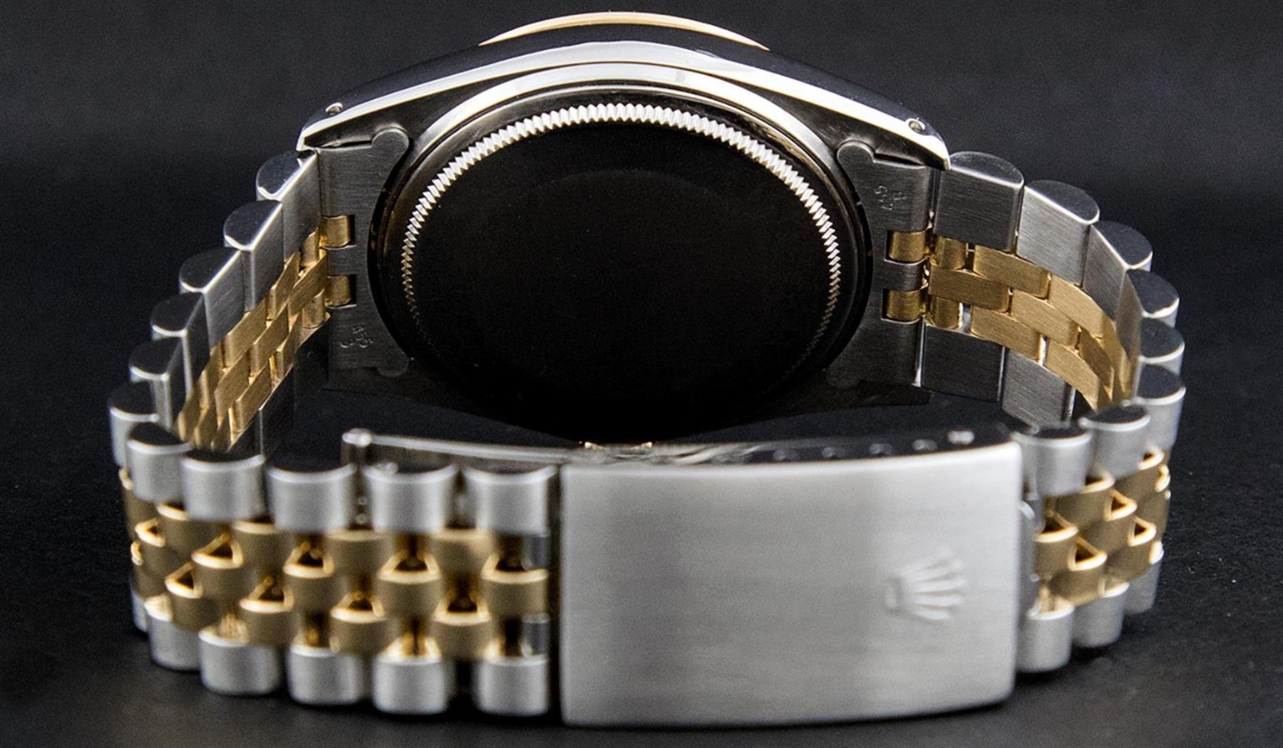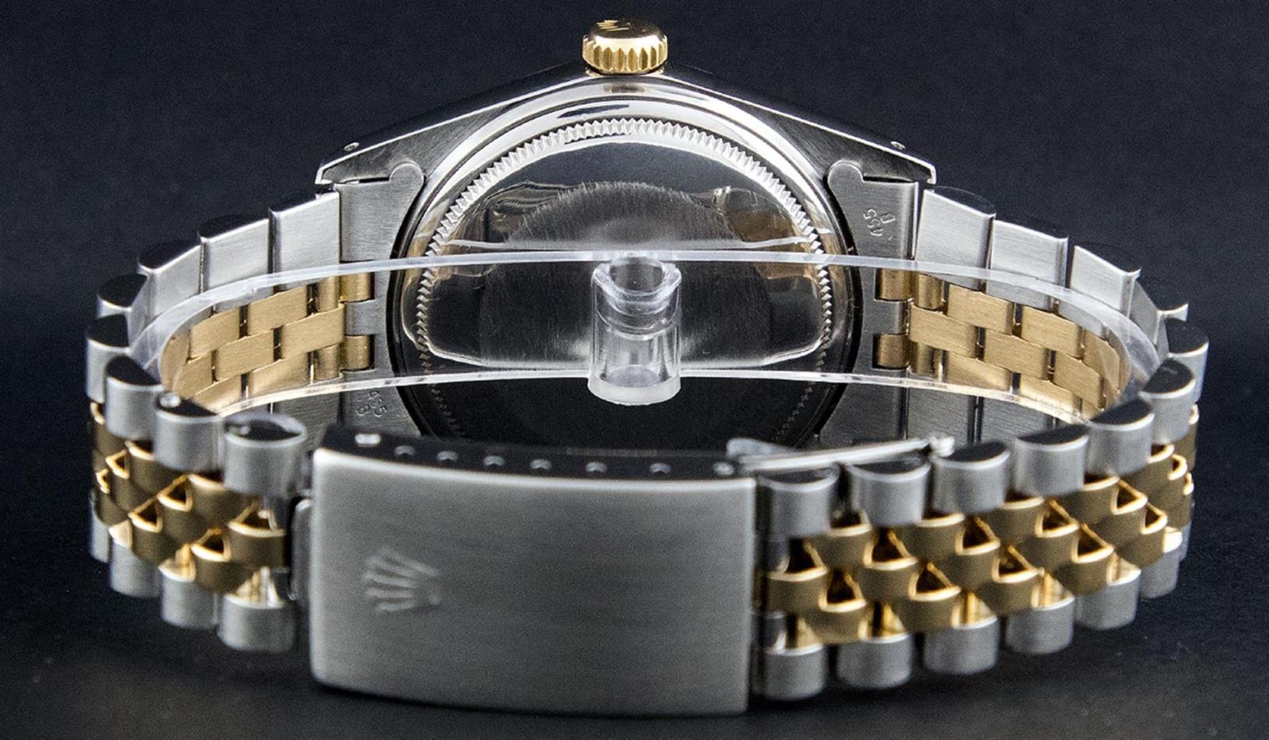One Mens 14K Yellow Gold Two Tone Rolex Datejust Polished, Serviced & Electronically Tested, 14K Yellow Gold & Stainless Steel Case: 36mm,14K Yellow Gold Crown, Bezel: 14K Yellow Gold Fluted Bezel. Custom Crystal: New Acrylic Cyclops Lens. Custom Hands: New Luminecent Hands. Movement: Automatic Winding Movement Caliber 3035. Dial: Black Tapestry Dial With Index Hour Markers and Small Track With Lumi Dots. Date Window: 3 O'Clock Position Date Display, Quickset, Model: Datejust. Condition: G-6 Extra Fine. Bracelet: Two Tone 14K Yellow Gold & Stainless Steel Jubilee Band. Bright Polish. 7.0 Inch Length, Adjustable. Standard Clasp, With Rolex Logo. This Watch Has Been Serviced Time Tested And Is In Excellent Condition It Is Free Of All Scratches And Dents. This Watch Comes With A Rolex Box.