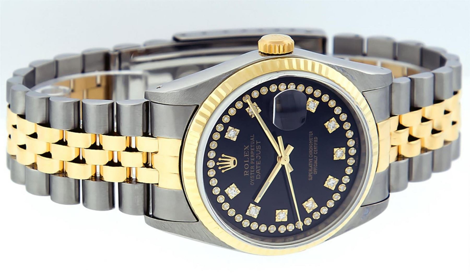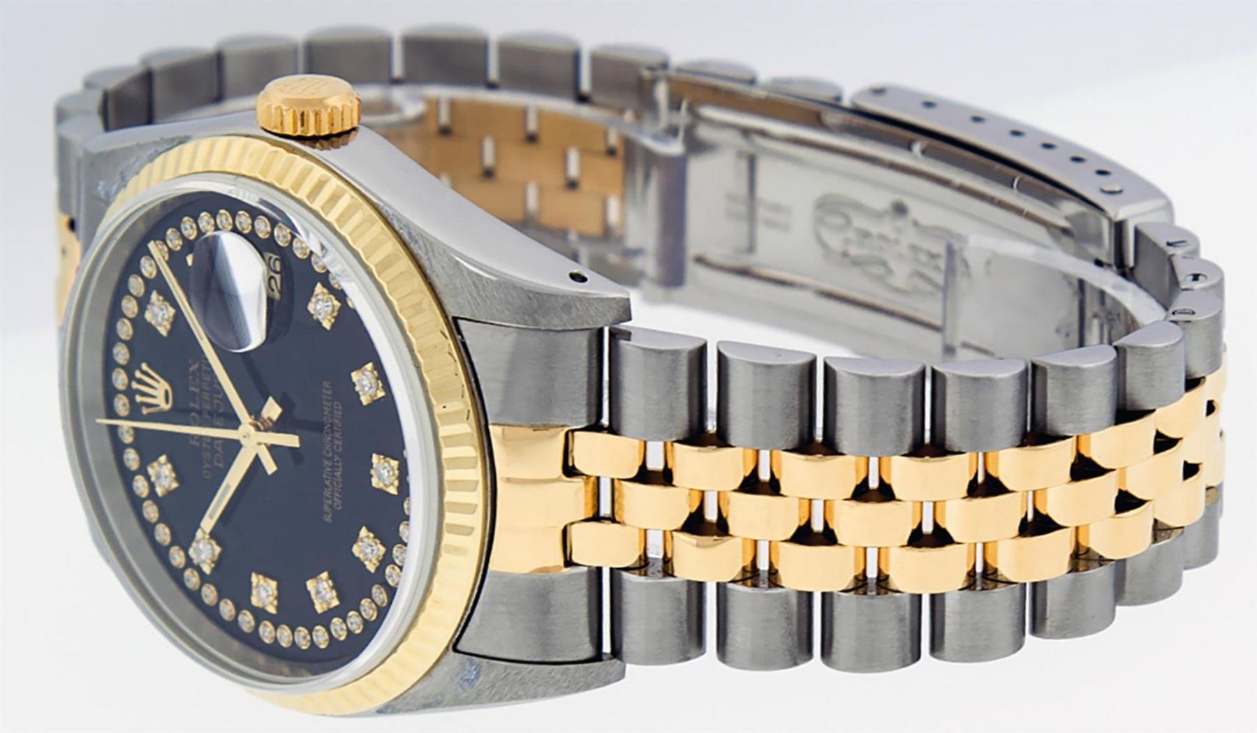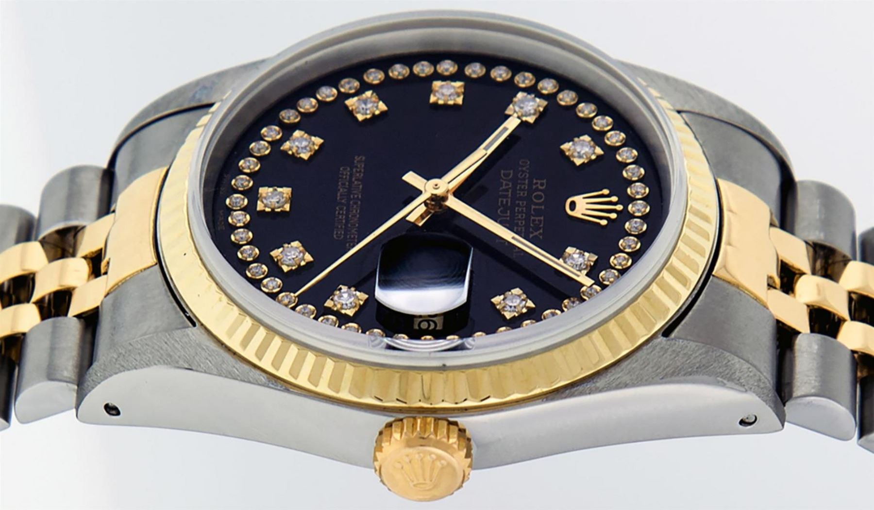 One Mens 14K Yellow Gold Two Tone Rolex Datejust Polished, Serviced & Electronically Tested, 14K Yellow Gold & Stainless Steel Case: 36mm, 14K Yellow Gold Crown,�Bezel: 14K Yellow Gold�Fluted Bezel. Custom Crystal: New Acrylic Cyclops Lens. Custom Hands: New Luminecent Hands. Movement: Automatic Winding Movement Caliber 3035. Custom Dial: Black Single Cut String Dial Set With VS Diamond Hour Markers,�Diamond Count: 58 Diamonds�in Dial, G To H In Color, SI-VS Clarity. Date Window: 3 O'Clock Position Date Display,�Quickset, Model: 16013 Datejust, Condition: G-6 Extra Fine. Bracelet: Two Tone 14K Yellow Gold & Stainless Steel Jubilee Band. Bright Polish.�7.0 Inch Length, Adjustable. Standard Clasp, With Rolex Logo. This Watch Has Been Serviced And Polished It Is Free Of All Scratches And Dents.