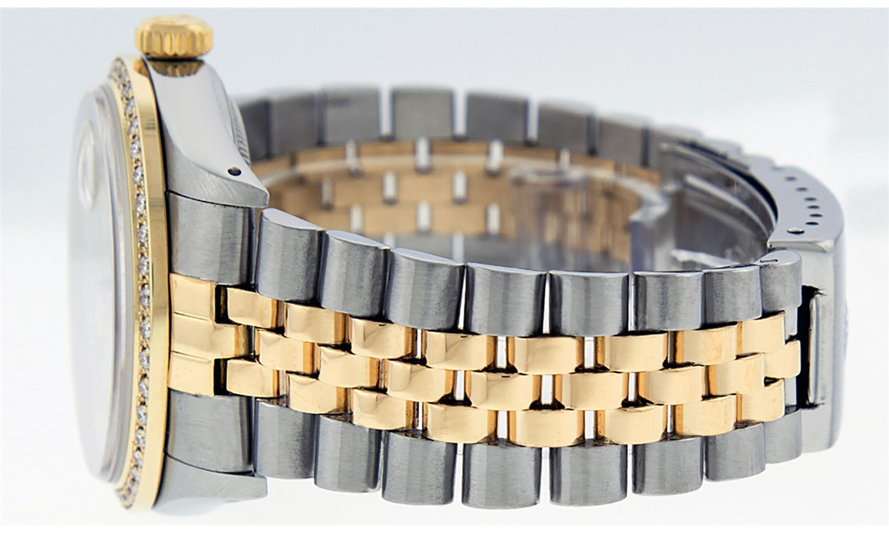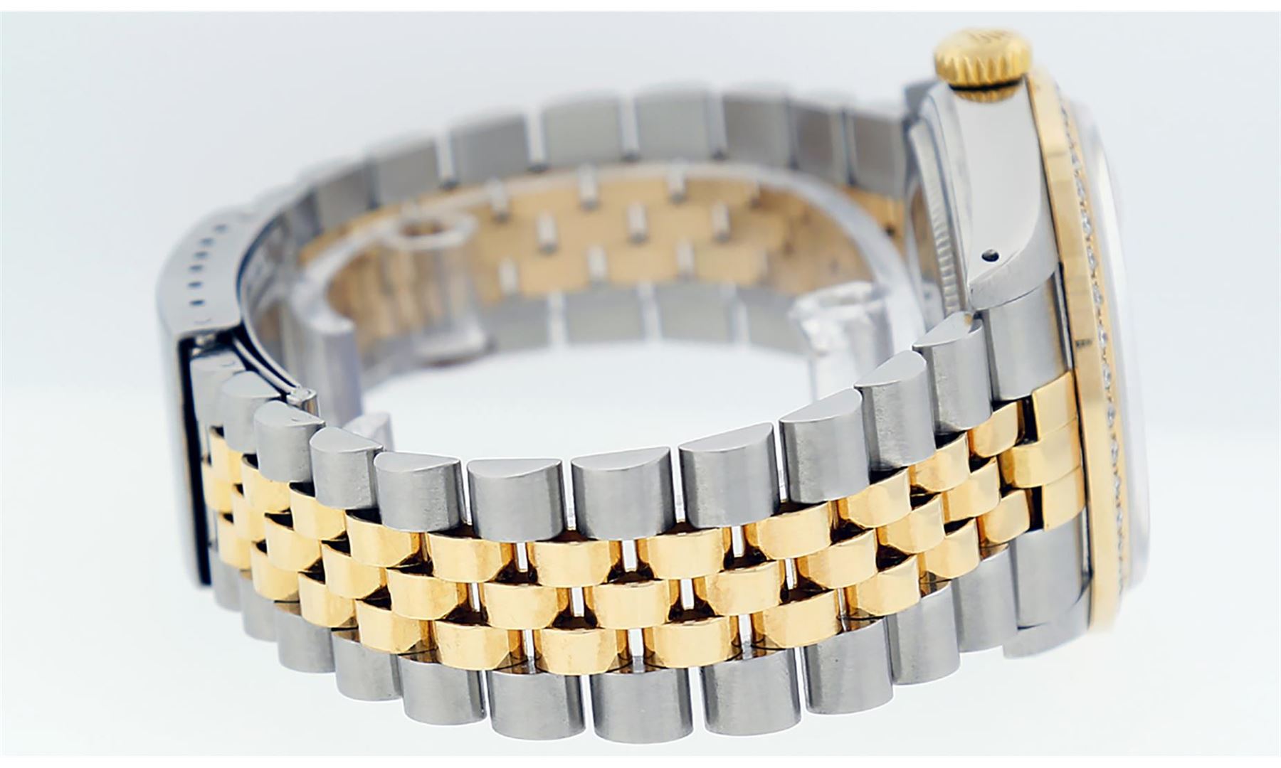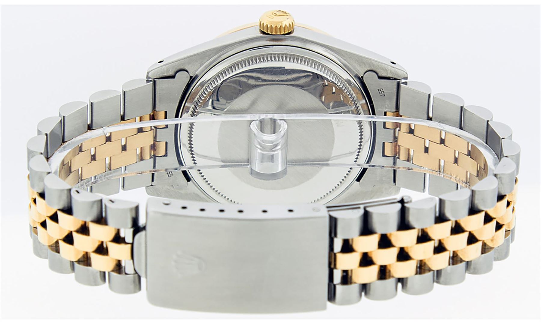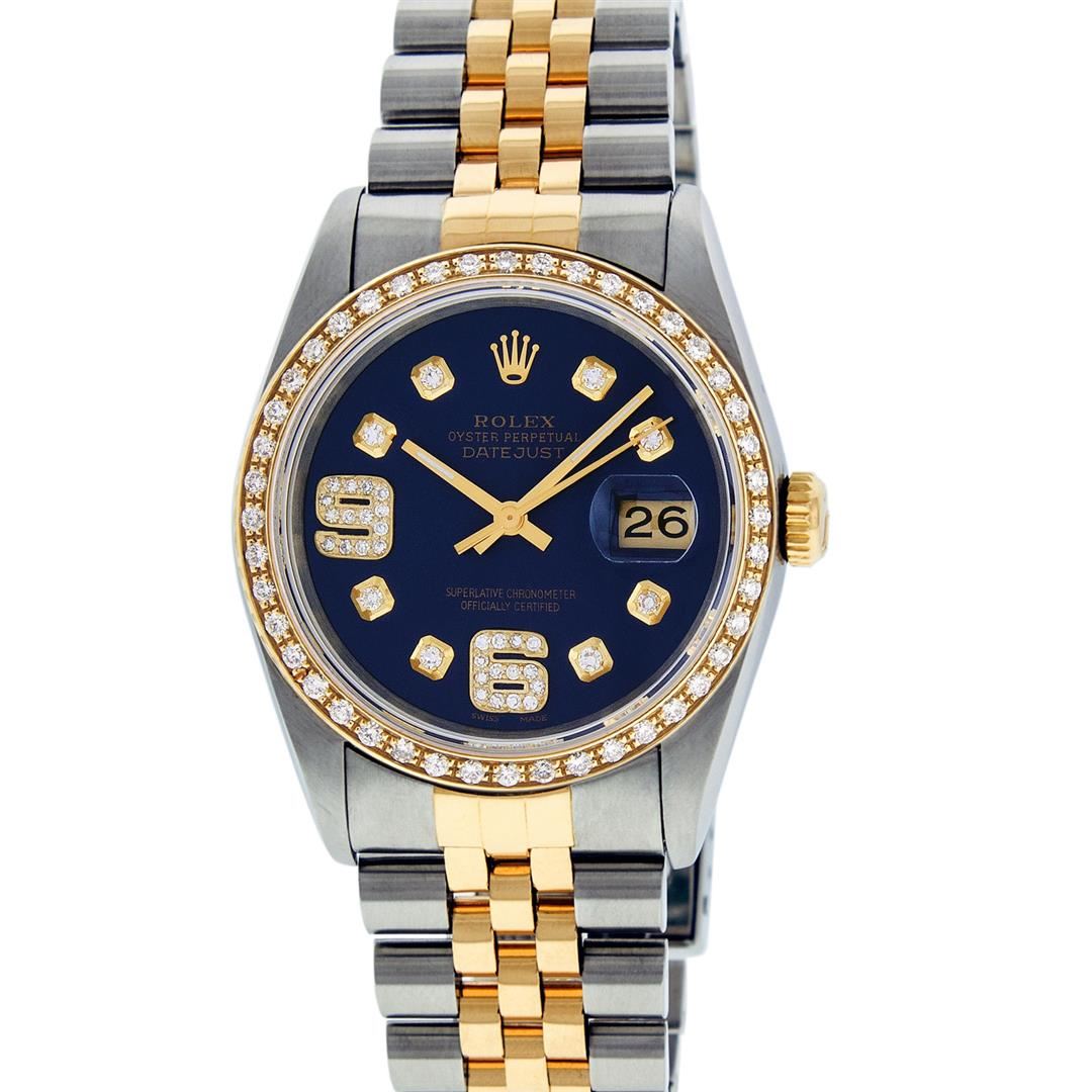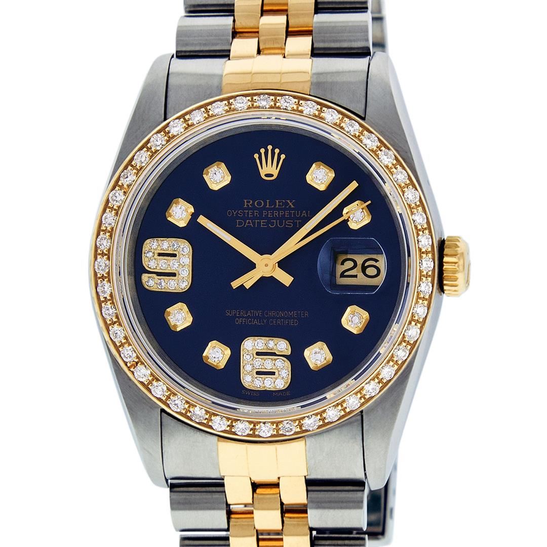 One Mens 14K Yellow Gold Two Tone Rolex Datejust Polished, Serviced & Electronically Tested, 14K Yellow Gold & Stainless Steel Case: 36mm, 14K Yellow Gold Crown, Custom Bezel: New 18K Yellow Gold Beadset Diamond Bezel, Diamond Count: 44 Diamonds, Total Weight 1.00 Carat, Clarity: SI-VS, Color: G to H. Custom Crystal: New Scratch Resistant Synthetic Sapphire Cyclops Lens. Movement: Automatic Winding Movement Caliber 3035. Custom Dial: Blue Diamond Dial with 9 & 6 Diamond Hour Markers, Diamond Count: 8 Diamonds + 28 Diamonds On 6 & 9 Hour Markers, Color: G To H In Color, Clarity: SI-VS, Date Window: 3 O'Clock Position Date Display, Quickset, Model: 16013 Datejust. Condition: G-6 Extra Fine. Bracelet: Two Tone 14K Yellow Gold & Stainless Steel Jubilee. Bright Polish. 7.0 Inch Length, Adjustable. Standard Clasp, With Rolex Logo. This Watch Has Been Serviced Time Tested And Is In Excellent Condition It Is Free Of All Scratches And Dents.
