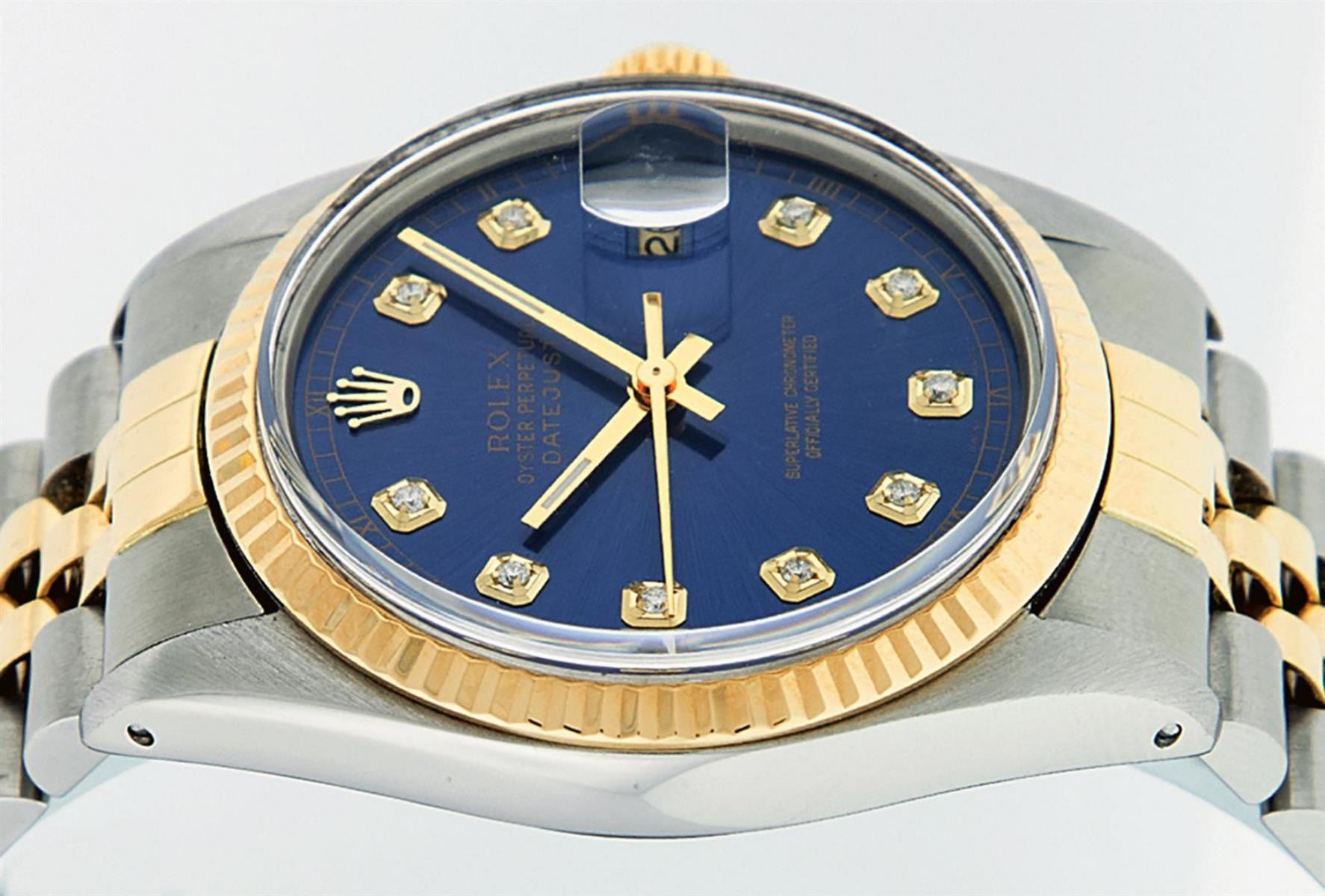 One Mens 14K Yellow Gold Two Tone Rolex Datejust Polished, Serviced & Electronically Tested, 14K Yellow Gold & Stainless Steel Case: 36mm, 14K Yellow Gold Crown,�Bezel: 14K Yellow Gold�Fluted Bezel. Custom Crystal: New Acrylic Cyclops Lens. Custom Hands: New Luminecent Hands. Movement: Automatic Winding Movement Caliber 3035. Custom Dial: Blue With Diamond Hour Markers And Square Roman Track,�Diamond Count: 10 Diamonds�in Dial, G To H In Color, SI-VS Clarity. Date Window: 3 O'Clock Position Date Display,� Quickset, Model: 16013 Datejust, Condition: G-6 Extra Fine. Bracelet: Two Tone 14K Yellow Gold & Stainless Steel Jubilee. Bright Polish.�7.0 Inch Length, Adjustable. Standard Clasp, With Rolex Logo. This Watch Has Been Serviced And Polished It Is Free Of All Scratches And Dents.