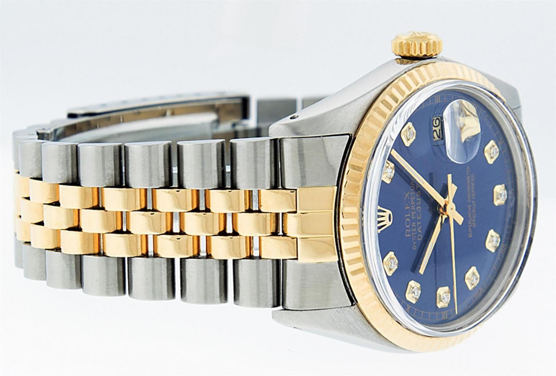 One Mens 14K Yellow Gold Two Tone Rolex Datejust Polished, Serviced & Electronically Tested, 14K Yellow Gold & Stainless Steel Case: 36mm, 14K Yellow Gold Crown, Bezel: 14K Yellow Gold Fluted Bezel. Custom Crystal: New Acrylic Cyclops Lens. Custom Hands: New Luminecent Hands. Movement: Automatic Winding Movement Caliber 3035. Custom Dial: Blue With Diamond Hour Markers And Square Roman Track, Diamond Count: 10 Diamonds in Dial, G To H In Color, SI-VS Clarity. Date Window: 3 O'Clock Position Date Display, Quickset, Model: 16013 Datejust, Condition: G-6 Extra Fine. Bracelet: Two Tone 14K Yellow Gold & Stainless Steel Jubilee. Bright Polish. 7.0 Inch Length, Adjustable. Standard Clasp, With Rolex Logo. This Watch Has Been Serviced And Polished It Is Free Of All Scratches And Dents.
