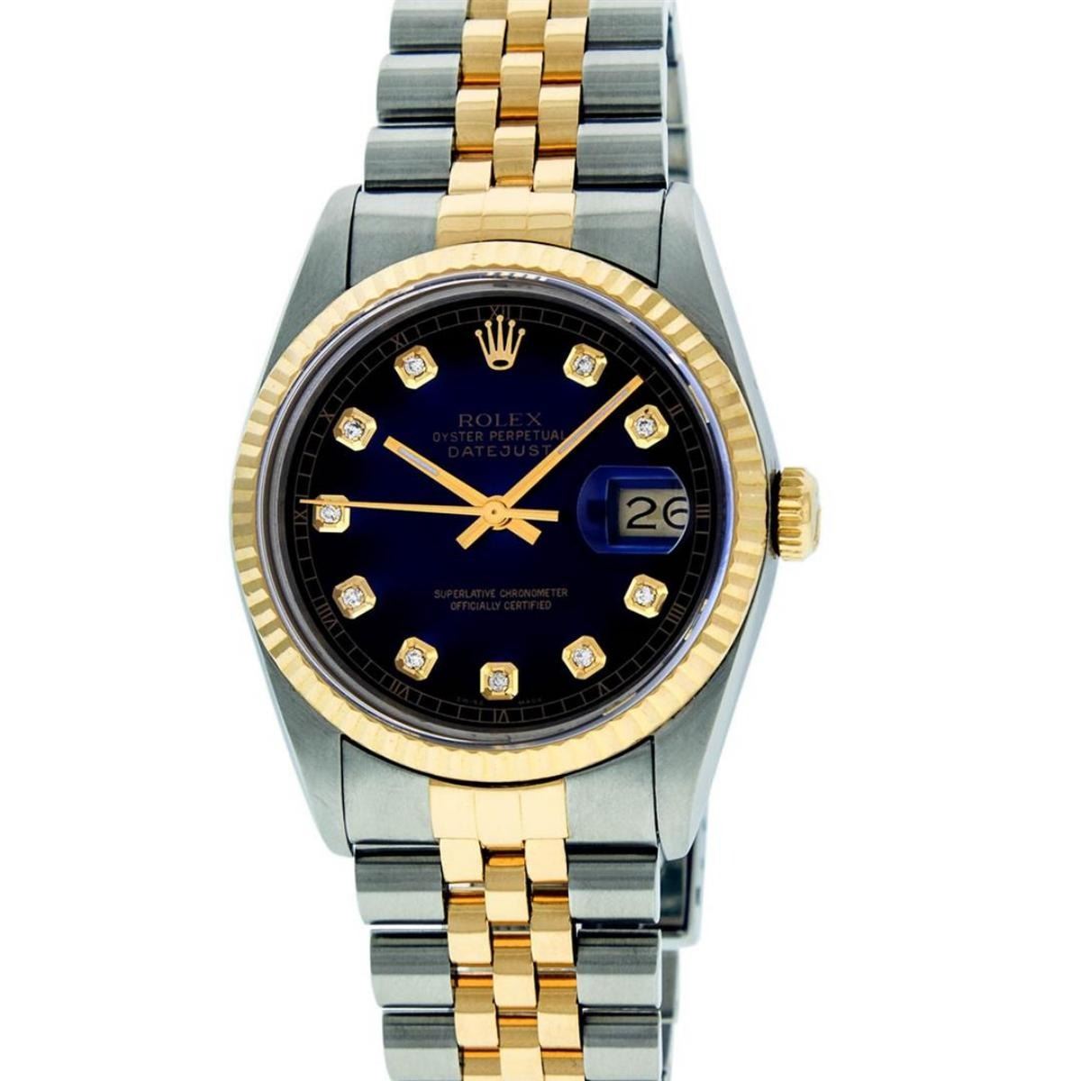 One Mens 14K Yellow Gold Two Tone Rolex Datejust Polished, Serviced & Electronically Tested, 14K Yellow Gold & Stainless Steel Case: 36mm, 14K Yellow Gold Crown, Bezel: 18K Yellow Gold Fluted Bezel. Custom Crystal: New Acrylic Cyclops Lens. Custom Hands: New Luminecent Hands. Movement: Automatic Winding Movement Caliber 3035. Custom Dial: Blue Vignette Dial Set With Diamond Hour Markers And Square Roman Track, Diamond Count: 10 Diamonds in Dial G To H In Color, Si-VS Clarity. Date Window: 3 O'Clock Position Date Display,  Quickset, Model: 16013 Condition: G-6 Extra Fine. Bracelet: Two Tone 14K Yellow Gold & Stainless Steel Jubilee. Bright Polish. 7.0 Inch Length, Adjustable. Standard Clasp, With Rolex Logo. This Watch Has Been Serviced And Polished It Is Free Of All Scratches And Dents.