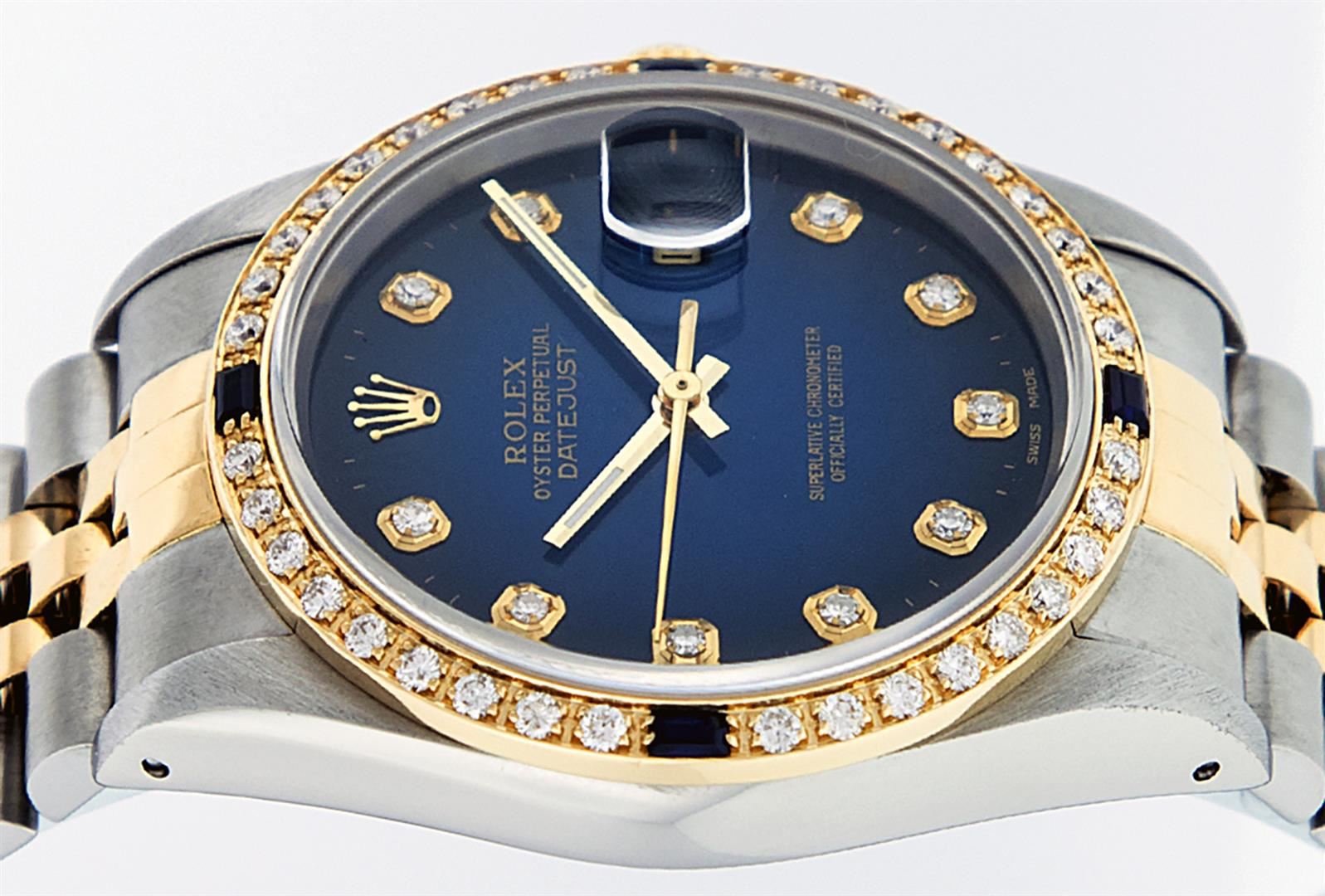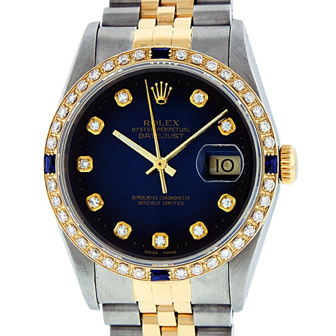 One Mens 14K Yellow Gold Two Tone Rolex Datejust Polished, Serviced & Electronically Tested, 14K Yellow Gold & Stainless Steel Case: 36mm, 14K Yellow Gold Crown, Custom Bezel: New 18K Yellow Gold Sapphire Beadset Diamond Bezel, Diamond Count: 36 Diamonds + 4 Sapphires Total Weight 1.00 Carat, Clarity: SI-VS, Color: G to H. Custom Crystal: New Scratch Resistant Synthetic Sapphire Cyclops Lens. Custom Hands: New Luminecent Hands. Movement: Automatic Winding Movement Caliber 3035. Custom Dial: Blue Vignette With Diamond Hour Markers & Dash Track. Diamond Count: 10 Diamonds, Clarity: VS, Color: G to H Date Window: 3 O'Clock Position Date Display, Quickset, Model: Datejust, Condition: G-6 Extra Fine. Bracelet: Two Tone 14K Yellow Gold & Stainless Steel Jubilee. Bright Polish. 7.0 Inch Length, Adjustable. Standard Clasp, With Rolex Logo. This Watch Has Been Serviced Time Tested And Is In Excellent Condition It Is Free Of All Scratches And Dents.