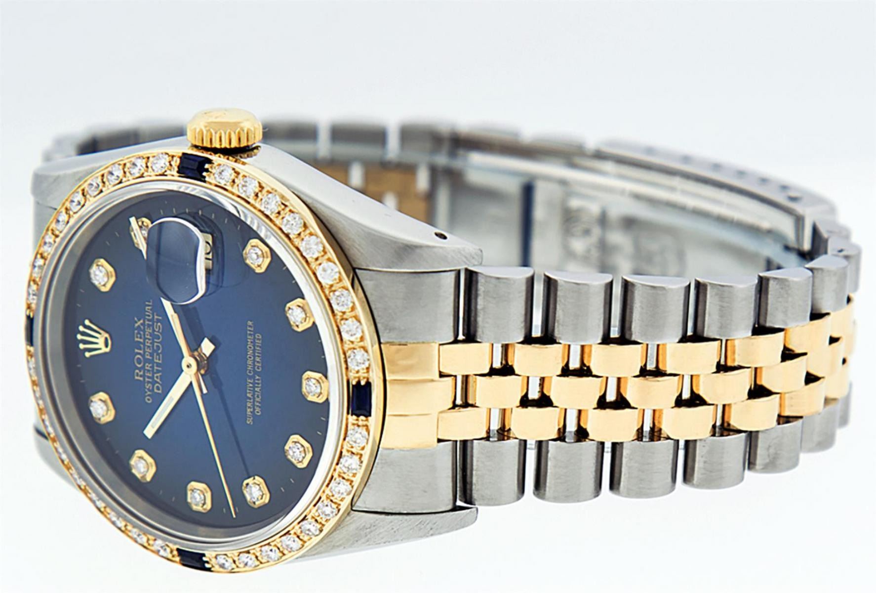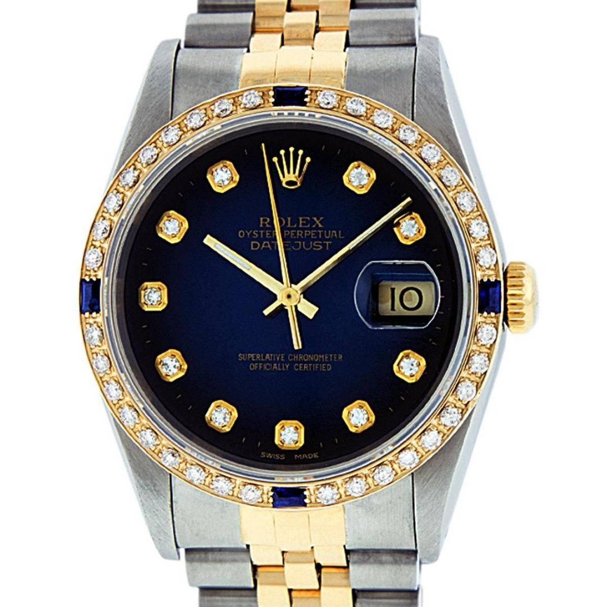 One Mens 14K Yellow Gold Two Tone Rolex Datejust Polished, Serviced & Electronically Tested, 14K Yellow Gold & Stainless Steel Case: 36mm, 14K Yellow Gold Crown, Custom Bezel: New 18K Yellow Gold Sapphire Beadset Diamond Bezel, Diamond Count:�36 Diamonds + 4 Sapphires�Total Weight 1.00 Carat, Clarity: SI-VS, Color: G to H. Custom Crystal: New Scratch Resistant Synthetic Sapphire Cyclops Lens. Custom Hands: New Luminecent Hands. Movement: Automatic Winding Movement Caliber 3035. Custom Dial: Blue Vignette With Diamond Hour Markers & Dash Track. Diamond Count: 10 Diamonds, Clarity: VS, Color: G to H Date Window: 3 O'Clock Position Date Display,�Quickset, Model: Datejust, Condition: G-6 Extra Fine. Bracelet: Two Tone 14K Yellow Gold & Stainless Steel Jubilee. Bright Polish. 7.0 Inch Length, Adjustable. Standard Clasp, With Rolex Logo. This Watch Has Been Serviced Time Tested And Is In Excellent Condition It Is Free Of All Scratches And Dents.