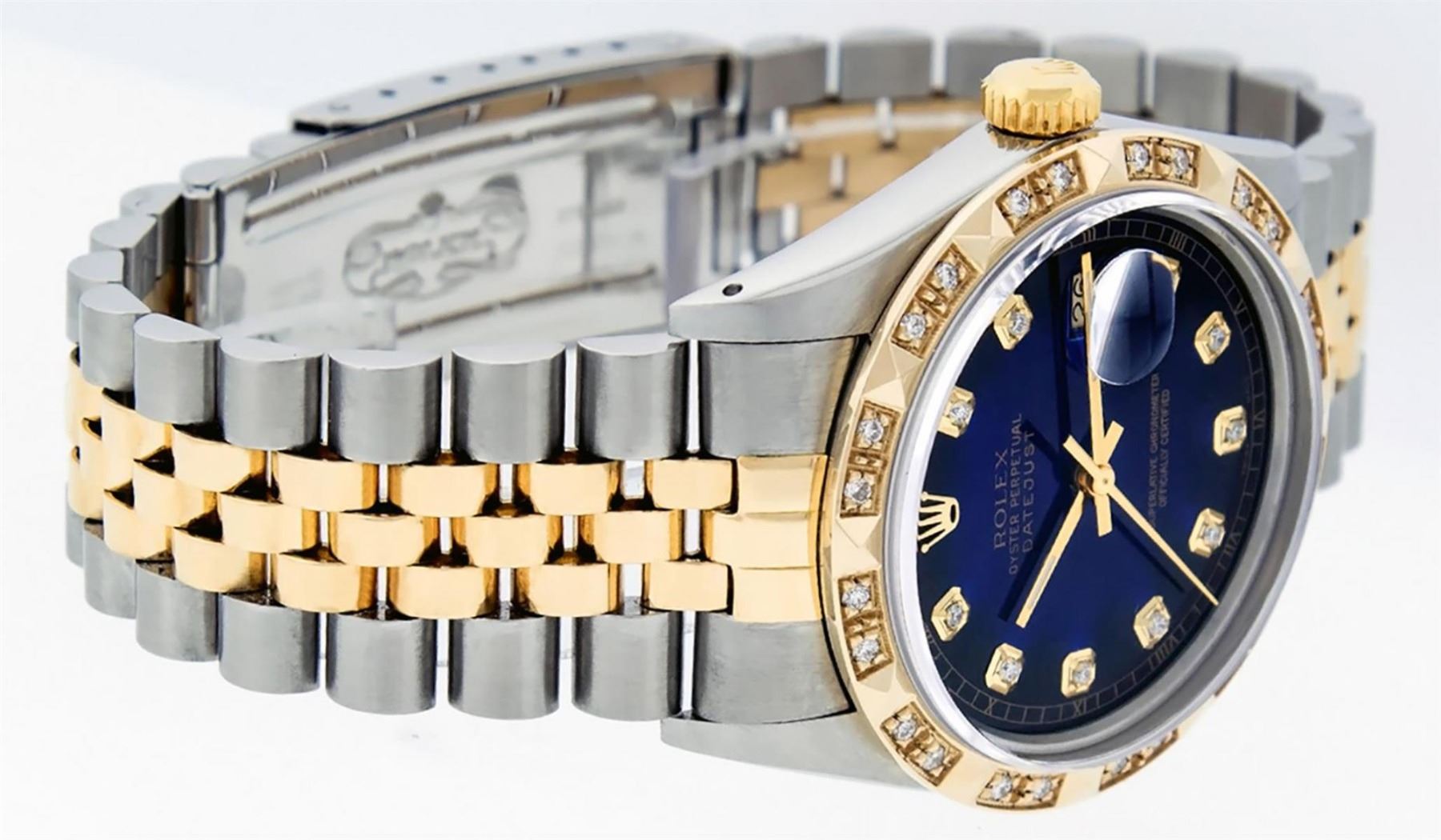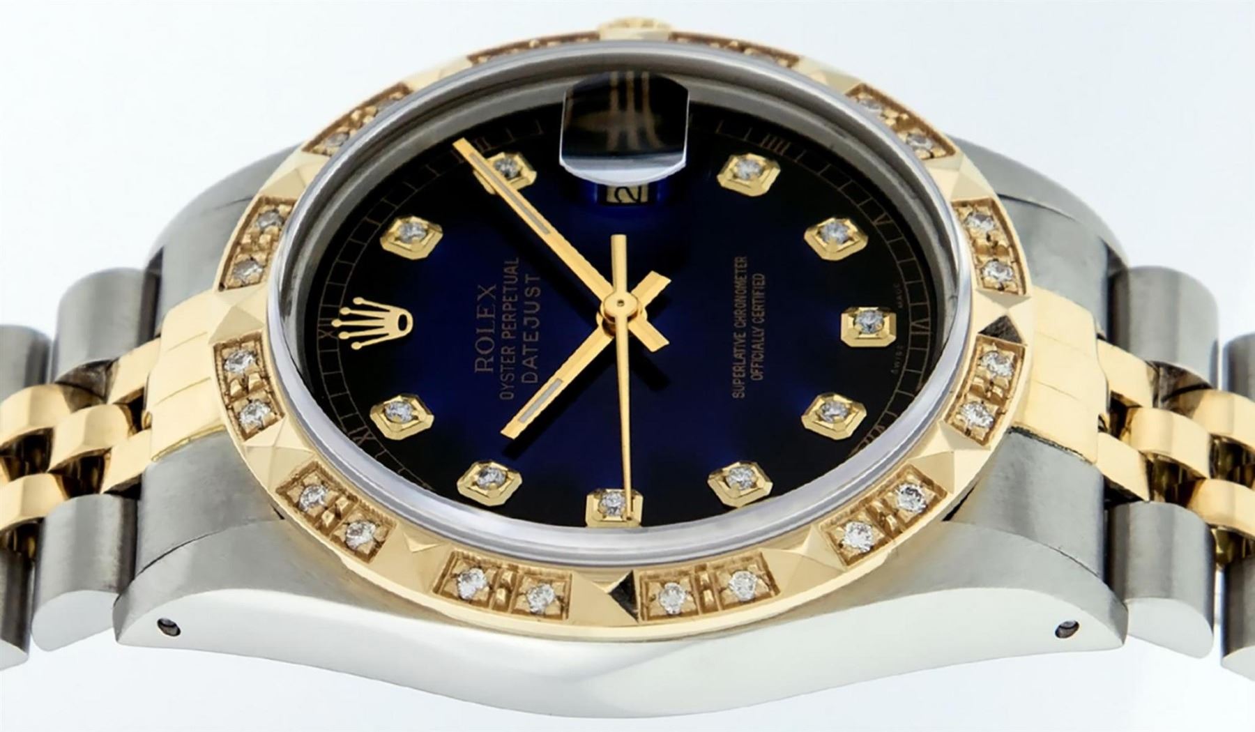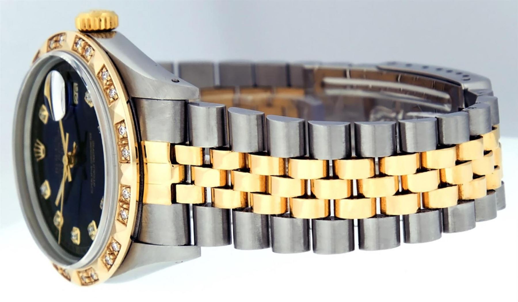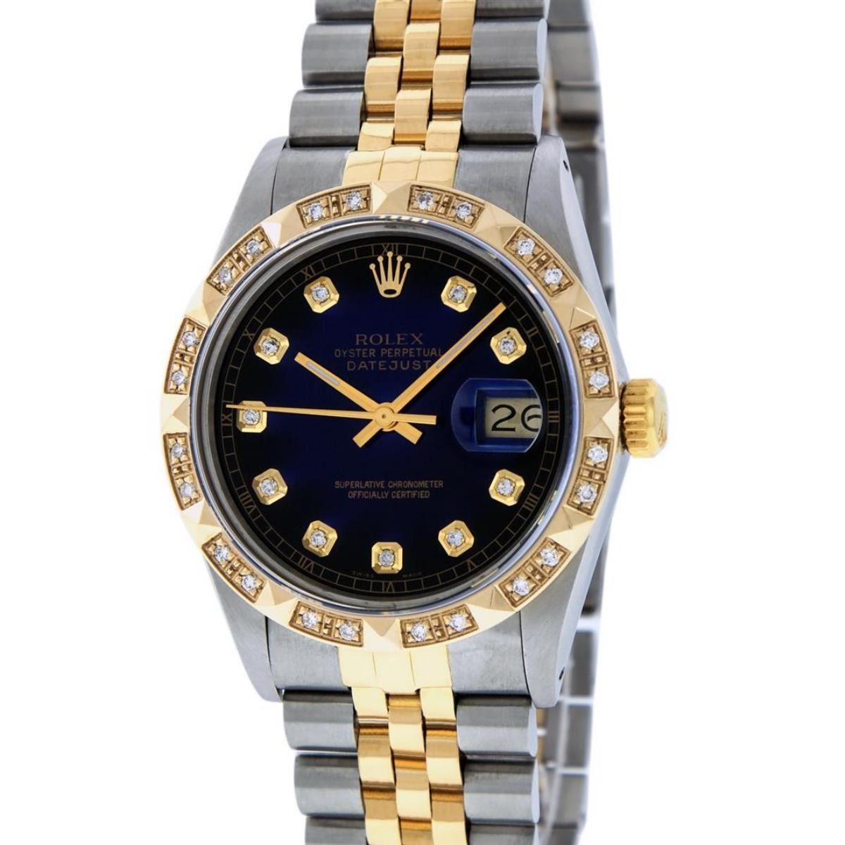 One Mens 14K Yellow Gold Rolex Datejust Polished Bright with Satin Finish, Serviced & Electronically Tested, Stainless Steel Case: 36mm, Yellow Gold Crown, Custom Bezel: New 18K Yellow Gold Pyramid Diamond Bezel, Diamond Count: 24 Diamonds, Total Weight .75 Carat, Clarity: SI-VS, Color: G to H. Custom Crystal: New Scratch Resistant Synthetic Sapphire Cyclops Lens. Custom Hands: New Luminecent Hands. Movement: Automatic Winding Movement Caliber 3035. Custom Dial: Blue Vignette Diamond Dial With Roman Track, Diamond Count: 10 Diamonds In Dial, Color: G to H, Clarity: VS. Date Window: 3 O'Clock Position Date Display, Quickset, Model: Datejust. Condition: G-6 Extra Fine. Bracelet: 14K Yellow Gold And Stainless Steel Jubilee Band. Bright Polish & Satin Finish. 7.0 Inch Length, Adjustable. Standard Clasp, With Rolex Logo. This Watch Has Been Serviced And Polished It Is Free Of All Scratches And Dents.