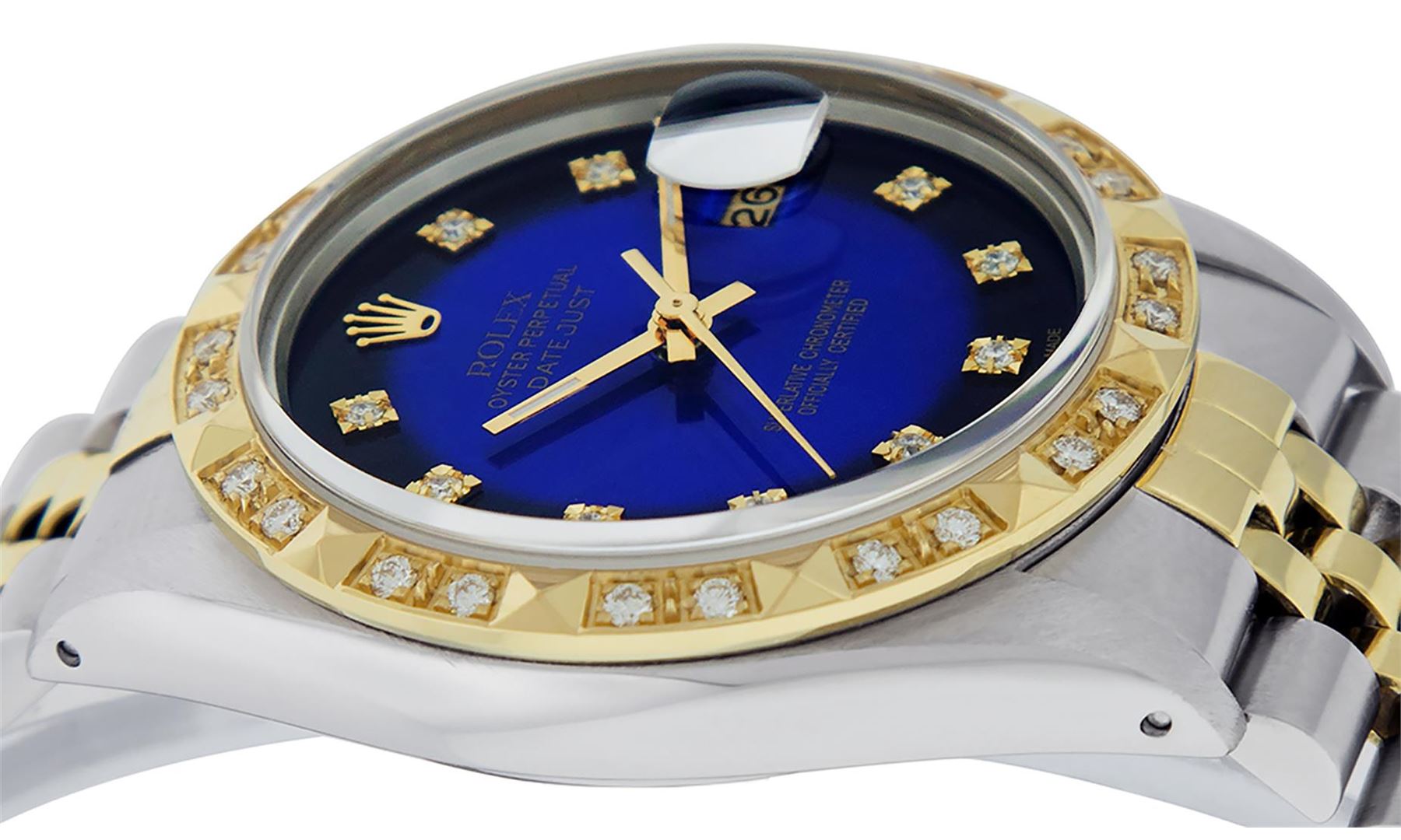 One Mens 14K Yellow Gold Rolex Datejust Polished Bright with Satin Finish, Serviced & Electronically Tested, Stainless Steel Case: 36mm, Yellow Gold Crown, Custom Bezel: New 18K Yellow Gold Pyramid Diamond Bezel, Diamond Count: 24 Diamonds In Bezel, Total Weight .75 Carat, Clarity: SI-VS, Color: G to H. Custom Crystal: New Scratch Resistant Synthetic Sapphire Cyclops Lens. Custom Hands: New Luminecent Hands. Movement: Automatic Winding Movement Caliber 3035. Custom Dial: Blue Vignette Single Cut Diamond Dial, Diamond Count: 10 Diamonds In Dial, Color: G to H, Clarity: VS. Date Window: 3 O'Clock Position Date Display, Quickset, Model: Datejust. Condition: G-6 Extra Fine. Bracelet: 14K Yellow Gold And Stainless Steel Jubilee Band. Bright Polish & Satin Finish. 7.0 Inch Length, Adjustable. Standard Clasp, With Rolex Logo. This Watch Has Been Serviced And Polished It Is Free Of All Scratches And Dents.