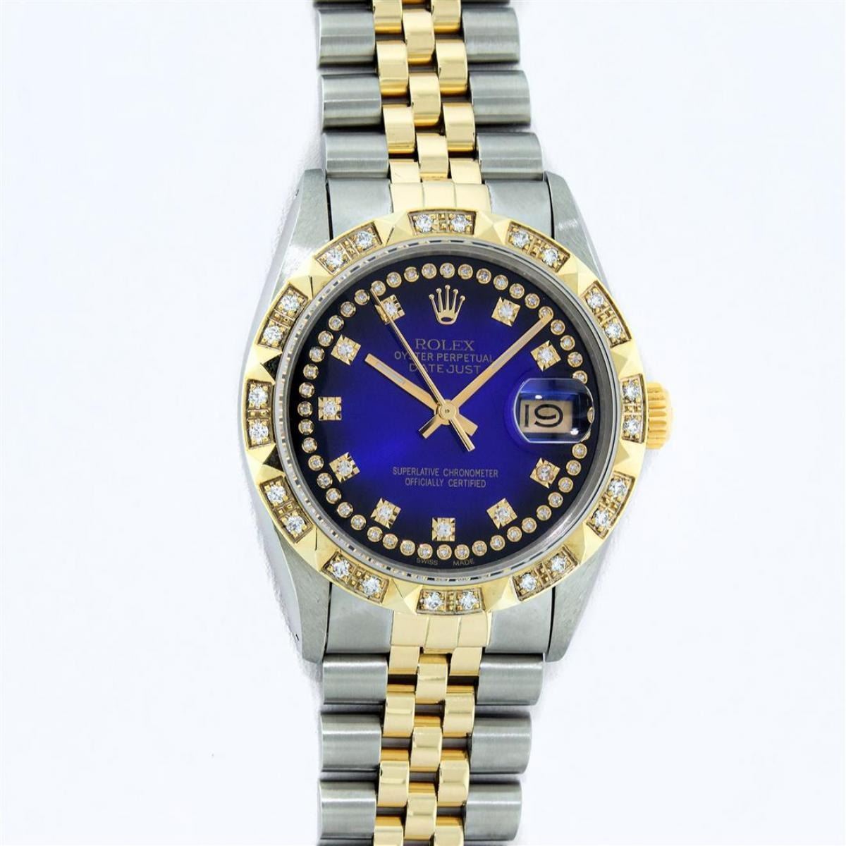 One Mens 14K Yellow Gold Rolex Datejust Polished Bright with Satin Finish, Serviced & Electronically Tested, Stainless Steel Case: 36mm, Yellow Gold Crown, Custom Bezel: New 18K Yellow Gold Pyramid Diamond Bezel, Diamond Count: 24 Diamonds, Total Weight .75 Carat, Clarity: SI-VS, Color: G to H. Custom Crystal: New Synthetic Sapphire Cyclops Lens. Custom Hands: New Luminecent Hands. Movement: Automatic Winding Movement Caliber 3035. Custom Dial: Blue Vignette String Diamond Dial, Diamond Count: 58 Diamonds In Dial, Color: G to H, Clarity: VS. Date Window: 3 O'Clock Position Date Display, Quickset, Model: 16013 Datejust. Condition: G-6 Extra Fine. Bracelet: 14K Yellow Gold And Stainless Steel Jubilee Band. Bright Polish & Satin Finish. 7.0 Inch Length, Adjustable. Standard Clasp, With Rolex Logo. This Watch Has Been Serviced And Polished It Is Free Of All Scratches And Dents. This Watch Comes With A Rolex Box And Appraisal.
