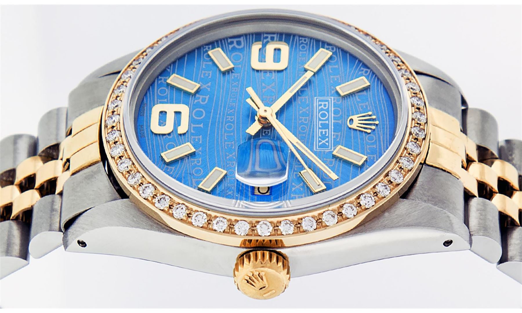 One Mens 14K Yellow Gold Two Tone Rolex Datejust Polished, Serviced & Electronically Tested, 14K Yellow Gold & Stainless Steel Case: 36mm, 14K Yellow Gold Crown, Custom Bezel: New 18K Yellow Gold Beadset Diamond Bezel, Diamond Count: 44 Diamonds, Total Weight 1.00 Carat, Clarity: SI-VS, Color: G to H. Custom Crystal: New Scratch Resistant Synthetic Sapphire Cyclops Lens. Custom Hands: New Luminecent Hands. Movement: Automatic Winding Movement Caliber 3035. Custom Dial: Blue Wave Arabic Dial. Date Window: 3 O'Clock Position Date Display, Quickset, Model: Datejust. Condition: G-6 Extra Fine. Bracelet: Two Tone 14K Yellow Gold & Stainless Steel Jubilee Band. Bright Polish. 7.0 Inch Length, Adjustable. Standard Clasp, With Rolex Logo. This Watch Has Been Serviced Time Tested And Is In Excellent Condition It Is Free Of All Scratches And Dents.