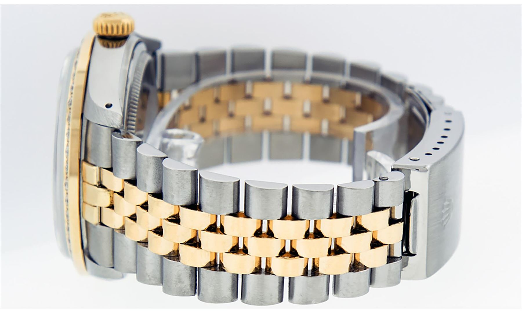 One Mens 14K Yellow Gold Two Tone Rolex Datejust Polished, Serviced & Electronically Tested, 14K Yellow Gold & Stainless Steel Case: 36mm, 14K Yellow Gold Crown, Custom Bezel: New 18K Yellow Gold Beadset Diamond Bezel, Diamond Count: 44 Diamonds, Total Weight 1.00 Carat, Clarity: SI-VS, Color: G to H. Custom Crystal: New Scratch Resistant Synthetic Sapphire Cyclops Lens. Custom Hands: New Luminecent Hands. Movement: Automatic Winding Movement Caliber 3035. Custom Dial: Blue Wave Arabic Dial. Date Window: 3 O'Clock Position Date Display, Quickset, Model: Datejust. Condition: G-6 Extra Fine. Bracelet: Two Tone 14K Yellow Gold & Stainless Steel Jubilee Band. Bright Polish. 7.0 Inch Length, Adjustable. Standard Clasp, With Rolex Logo. This Watch Has Been Serviced Time Tested And Is In Excellent Condition It Is Free Of All Scratches And Dents.