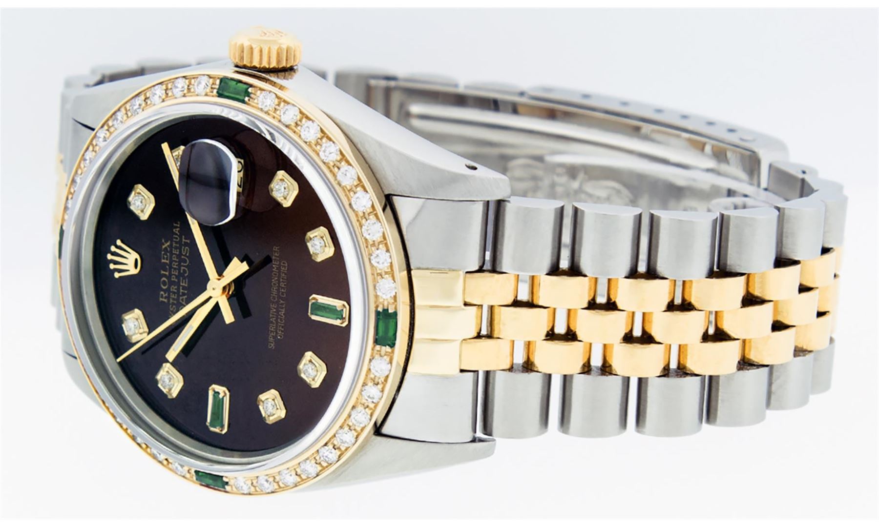 One Mens 14K Yellow Gold Two Tone Rolex Datejust Polished, Serviced & Electronically Tested, 14K Yellow Gold & Stainless Steel Case: 36mm, 14K Yellow Gold Crown, Custom Bezel: New 18K Yellow Gold Emerald Beadset Diamond Bezel, Diamond Count: 36 Diamonds + 4 Emeralds, Total Weight 1.00 Carat, Clarity: SI-VS, Color: G to H. Custom Crystal: New Scratch Resistant Synthetic Sapphire Cyclops Lens. Movement: Automatic Winding Movement Caliber 3035. Custom Dial: Brown Dial With Diamond Hour Markers and Synthetic Emerald Baguette Markers On 6 and 9, Stone Count: 8 Diamonds + 2 Synthetic Bagguette Emeralds In Dial. Date Window: 3 O'Clock Position Date Display, Quickset, Model: 16013 Datejust. Condition: G-6 Extra Fine. Bracelet: Two Tone 14K Yellow Gold & Stainless Steel Jubilee. Bright Polish. 7.0 Inch Length, Adjustable. Standard Clasp, With Rolex Logo. This Watch Has Been Serviced Time Tested And Is In Excellent Condition It Is Free Of All Scratches And Dents.