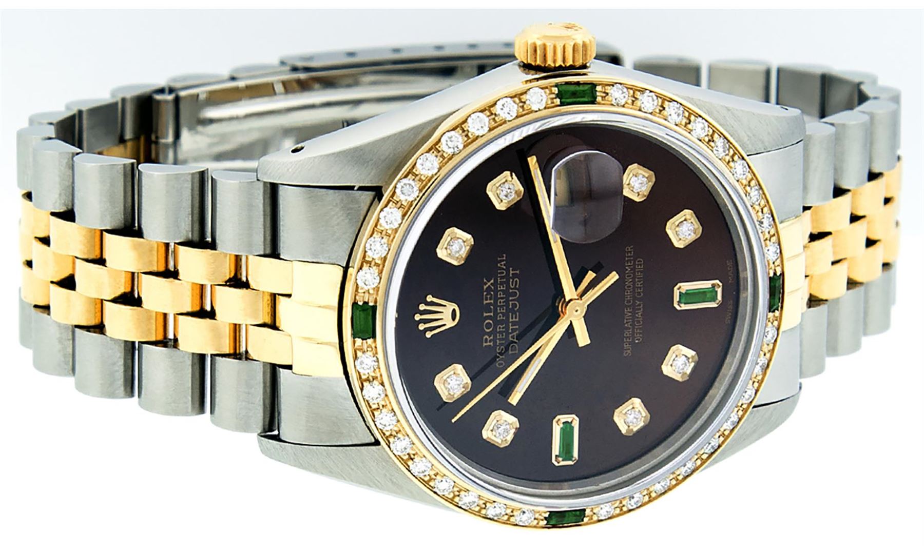 One Mens 14K Yellow Gold Two Tone Rolex Datejust Polished, Serviced & Electronically Tested, 14K Yellow Gold & Stainless Steel Case: 36mm, 14K Yellow Gold Crown, Custom Bezel: New 18K Yellow Gold Emerald Beadset Diamond Bezel, Diamond Count: 36 Diamonds + 4 Emeralds, Total Weight 1.00 Carat, Clarity: SI-VS, Color: G to H. Custom Crystal: New Scratch Resistant Synthetic Sapphire Cyclops Lens. Movement: Automatic Winding Movement Caliber 3035. Custom Dial: Brown Dial With Diamond Hour Markers and Synthetic Emerald Baguette Markers On 6 and 9, Stone Count: 8 Diamonds + 2 Synthetic Bagguette Emeralds In Dial. Date Window: 3 O'Clock Position Date Display, Quickset, Model: 16013 Datejust. Condition: G-6 Extra Fine. Bracelet: Two Tone 14K Yellow Gold & Stainless Steel Jubilee. Bright Polish. 7.0 Inch Length, Adjustable. Standard Clasp, With Rolex Logo. This Watch Has Been Serviced Time Tested And Is In Excellent Condition It Is Free Of All Scratches And Dents.