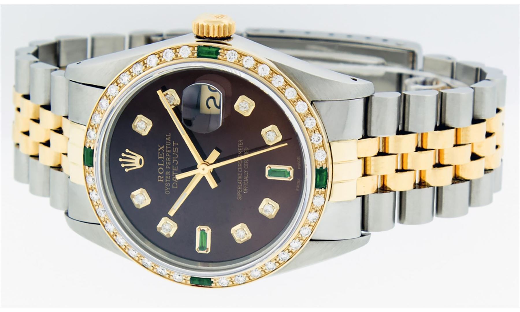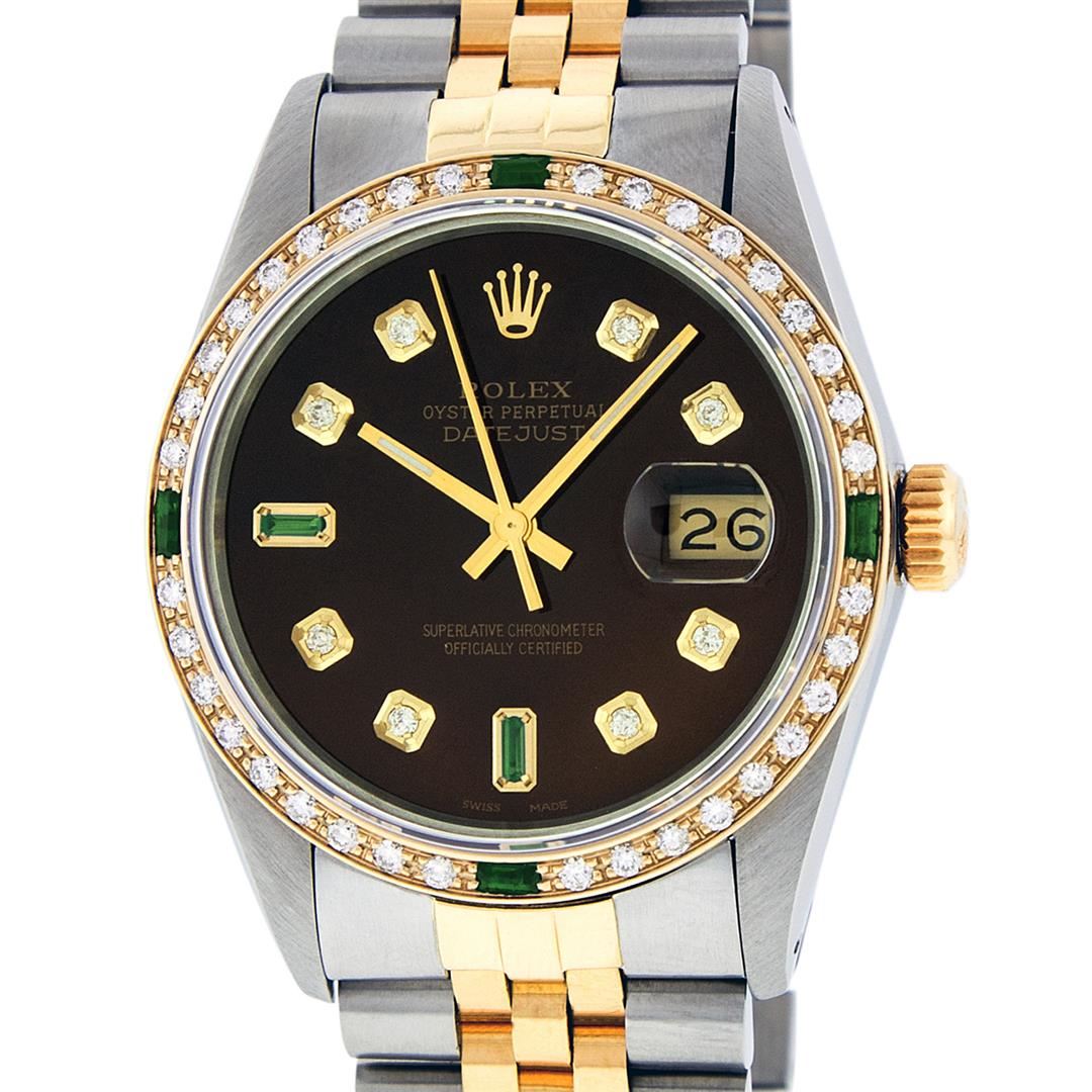 One Mens 14K Yellow Gold Two Tone Rolex Datejust Polished, Serviced & Electronically Tested, 14K Yellow Gold & Stainless Steel Case: 36mm, 14K Yellow Gold Crown, Custom Bezel: New 18K Yellow Gold Emerald Beadset Diamond Bezel, Diamond Count: 36 Diamonds + 4 Emeralds, Total Weight 1.00 Carat, Clarity: SI-VS, Color: G to H. Custom Crystal: New Scratch Resistant Synthetic Sapphire Cyclops Lens. Movement: Automatic Winding Movement Caliber 3035. Custom Dial: Brown Dial With Diamond Hour Markers and Synthetic Emerald Baguette Markers On 6 and 9, Stone Count: 8 Diamonds + 2 Synthetic Bagguette Emeralds In Dial. Date Window: 3 O'Clock Position Date Display, Quickset, Model: 16013 Datejust. Condition: G-6 Extra Fine. Bracelet: Two Tone 14K Yellow Gold & Stainless Steel Jubilee. Bright Polish. 7.0 Inch Length, Adjustable. Standard Clasp, With Rolex Logo. This Watch Has Been Serviced Time Tested And Is In Excellent Condition It Is Free Of All Scratches And Dents.