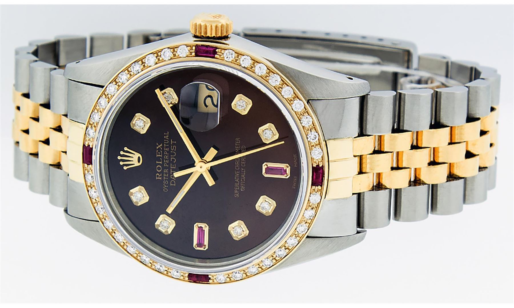 One Mens 14K Yellow Gold Two Tone Rolex Datejust Polished, Serviced & Electronically Tested, 14K Yellow Gold & Stainless Steel Case: 36mm, 14K Yellow Gold Crown, Custom Bezel: New 18K Yellow Gold Ruby Beadset Diamond Bezel, Diamond Count: 36 Diamonds + 4 Ruby, Total Weight 1.00 Carat, Clarity: SI-VS, Color: G to H. Custom Crystal: New Scratch Resistant Synthetic Sapphire Cyclops Lens. Movement: Automatic Winding Movement Caliber 3035. Custom Dial: Brown Dial With Diamond Hour Markers and Synthetic Ruby Baguette Markers On 6 and 9, Stone Count: 8 Diamonds + 2 Synthetic Bagguette Rubies In Dial. Date Window: 3 O'Clock Position Date Display, Quickset, Model: 16013 Condition: G-6 Extra Fine. Bracelet: Two Tone 14K Yellow Gold & Stainless Steel Jubilee. Bright Polish. 7.0 Inch Length, Adjustable. Standard Clasp, With Rolex Logo. This Watch Has Been Serviced Time Tested And Is In Excellent Condition It Is Free Of All Scratches And Dents.