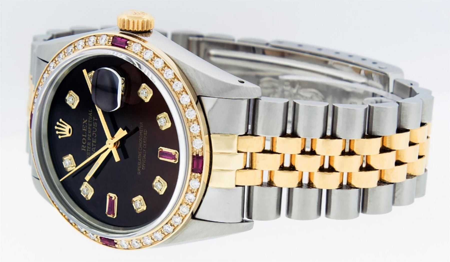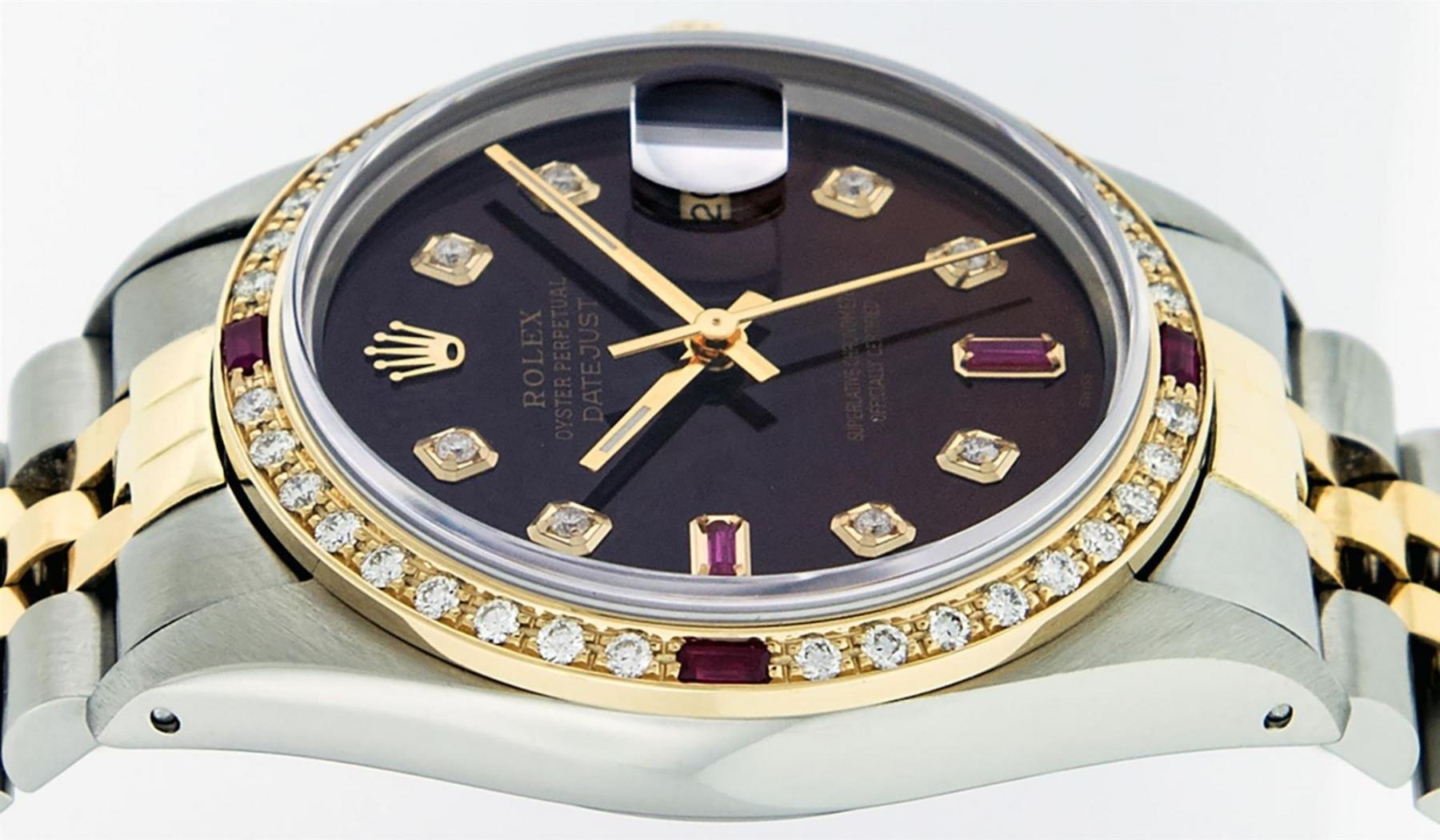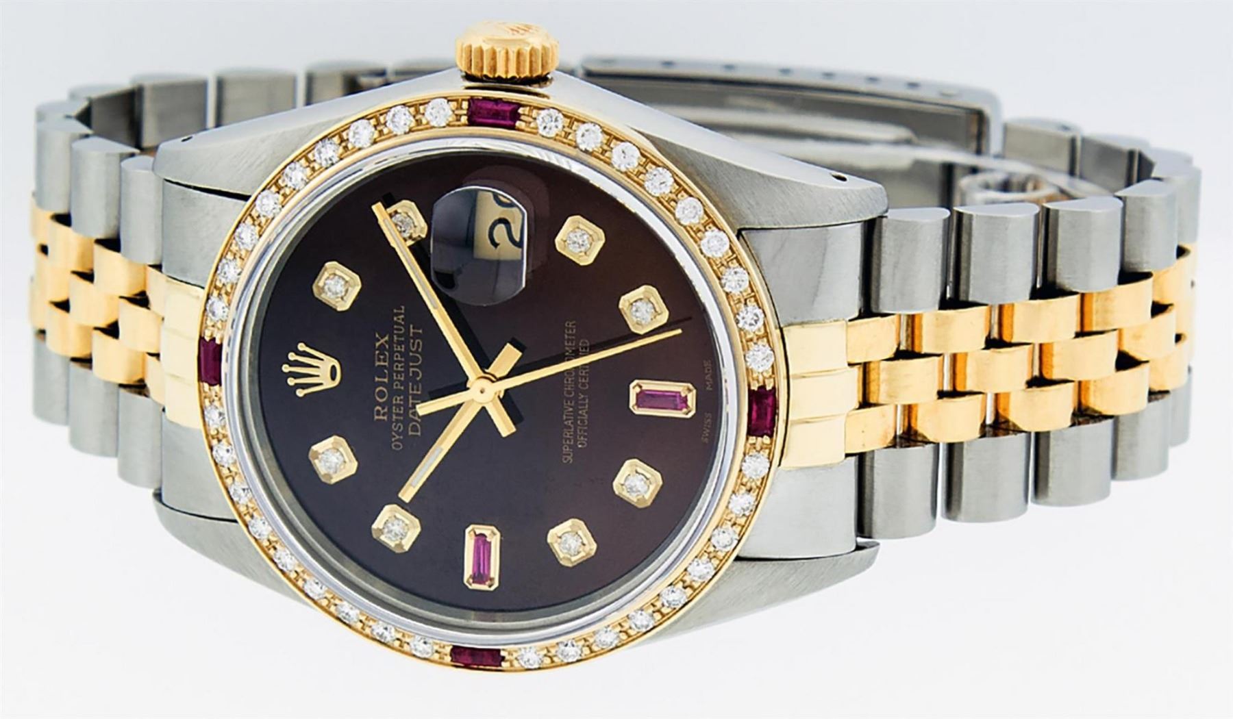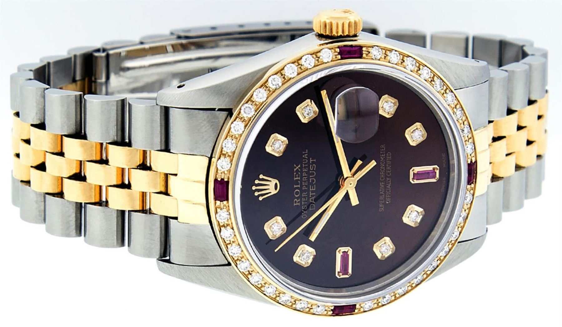 One Mens 14K Yellow Gold Two Tone Rolex Datejust Polished, Serviced & Electronically Tested, 14K Yellow Gold & Stainless Steel Case: 36mm, 14K Yellow Gold Crown, Custom Bezel: New 18K Yellow Gold Ruby Beadset Diamond Bezel, Diamond Count:�36 Diamonds + 4 Ruby, Total Weight 1.00 Carat, Clarity: SI-VS, Color: G to H. Custom Crystal: New Scratch Resistant Synthetic Sapphire Cyclops Lens. Movement: Automatic Winding Movement Caliber 3035. Custom Dial: Brown Dial With Diamond Hour Markers and Synthetic Ruby Baguette Markers On 6 and 9,�Stone Count: 8 Diamonds + 2 Synthetic Bagguette Rubies In Dial. Date Window: 3 O'Clock Position Date Display,�Quickset, Model: 16013 Condition: G-6 Extra Fine. Bracelet: Two Tone 14K Yellow Gold & Stainless Steel Jubilee. Bright Polish.�7.0 Inch Length, Adjustable. Standard Clasp, With Rolex Logo. This Watch Has Been Serviced Time Tested And Is In Excellent Condition It Is Free Of All Scratches And Dents.