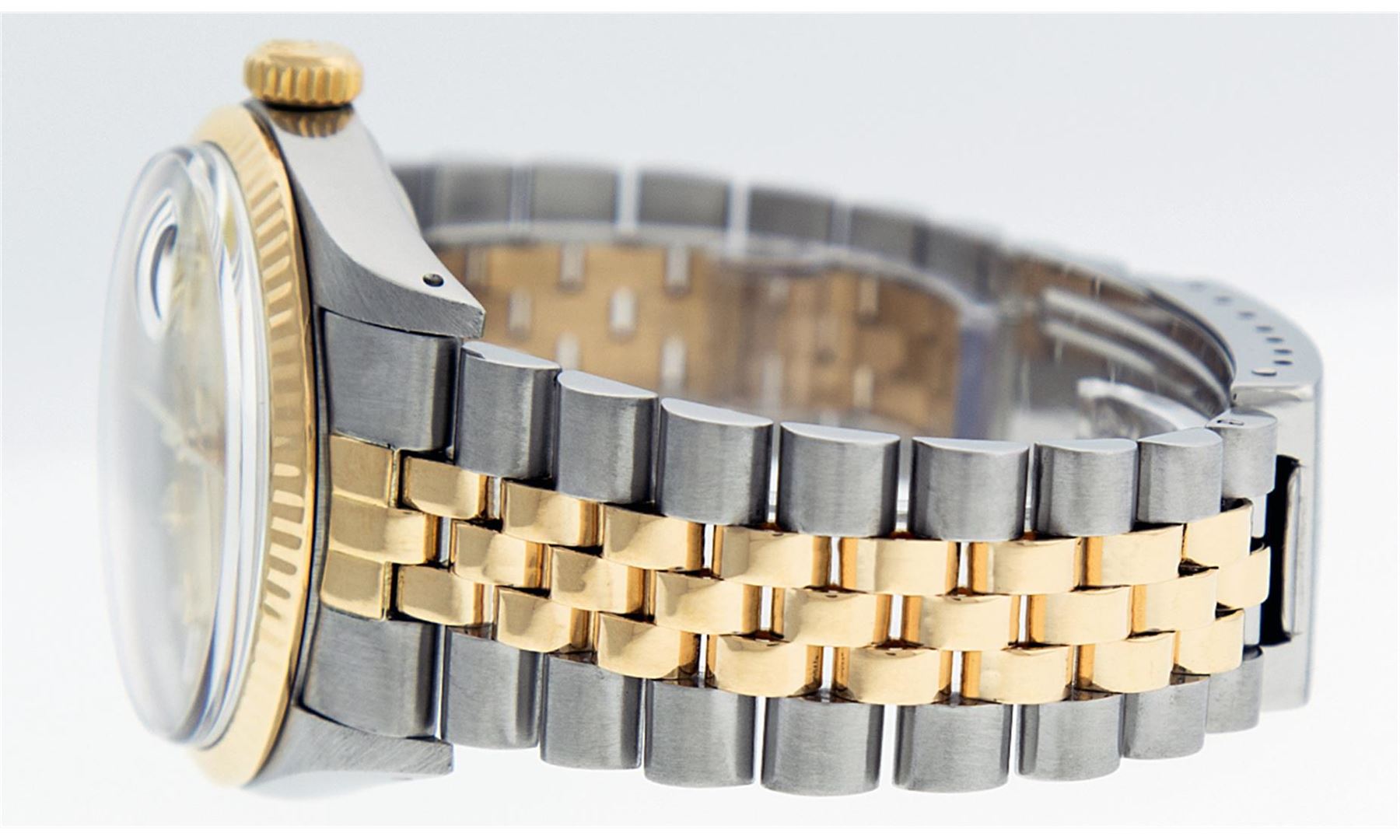 One Mens 14K Yellow Gold Two Tone Rolex Datejust Polished, Serviced & Electronically Tested, 14K Yellow Gold & Stainless Steel Case: 36mm, 14K Yellow Gold Crown, Bezel: 14K Yellow Gold Fluted Bezel. Custom Crystal: New Acrylic Cyclops Lens. Custom Hands: New Luminecent Hands. Movement: Automatic Winding Movement Caliber 3035. Custom Dial: Champagne Diamond Dial, Diamond Count: 8 Diamonds + 2 Baguette Diamonds in Dial, G To H In Color, SI-VS Clarity. Date Window: 3 O'Clock Position Date Display, Quickset, Model: Datejust, Condition: G-6 Extra Fine. Bracelet: Two Tone 14K Yellow Gold & Stainless Steel Jubilee Band. Bright Polish. 7.0 Inch Length, Adjustable. Standard Clasp, With Rolex Logo. This Watch Has Been Serviced And Polished It Is Free Of All Scratches And Dents.