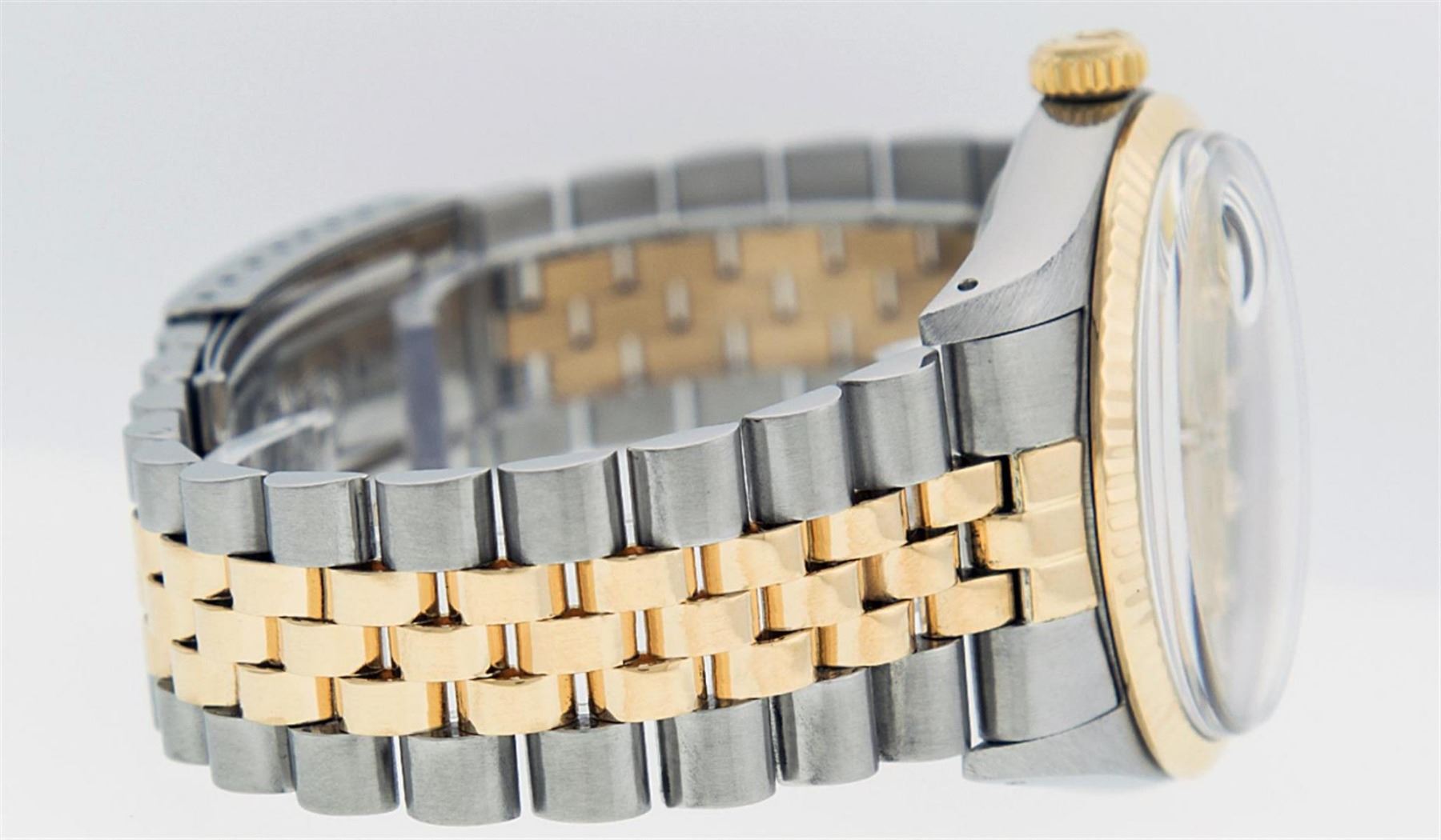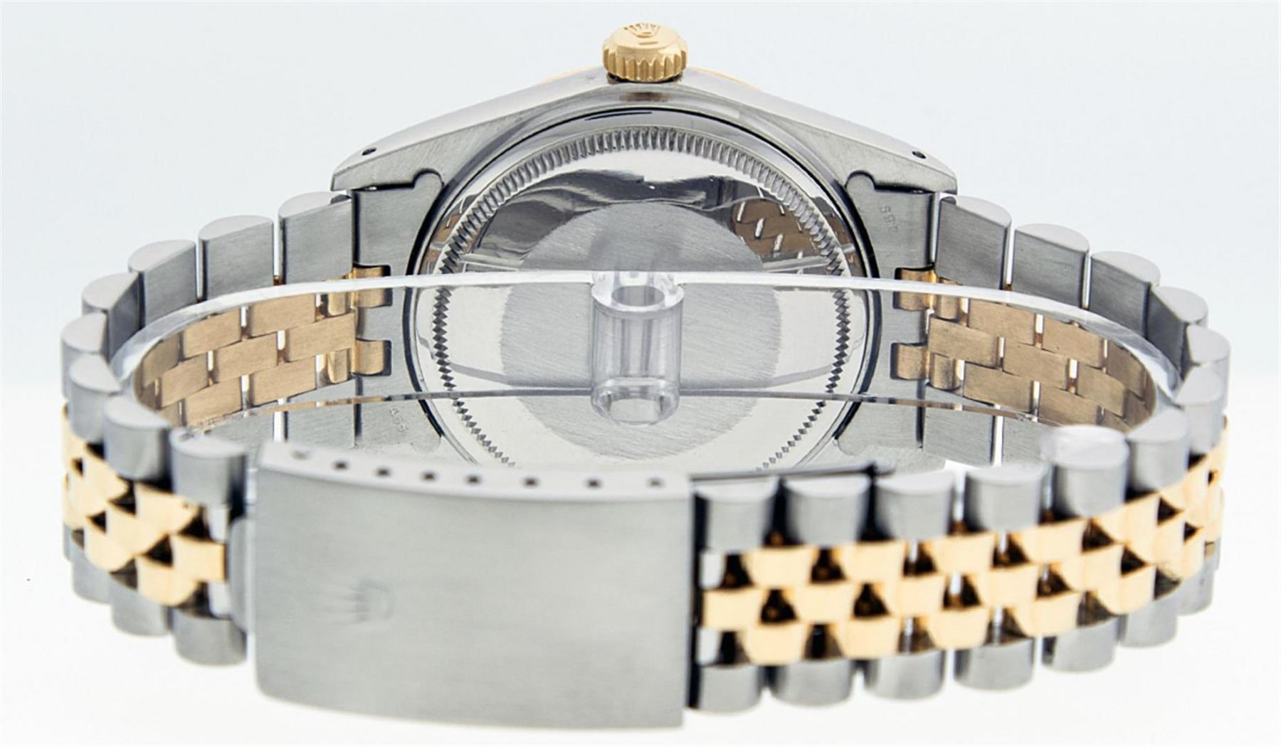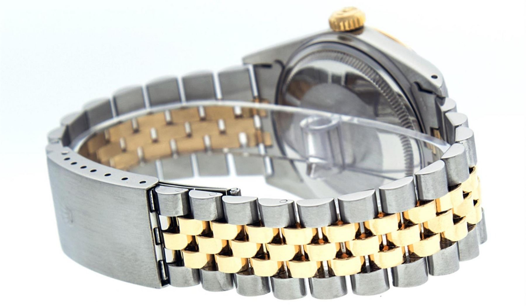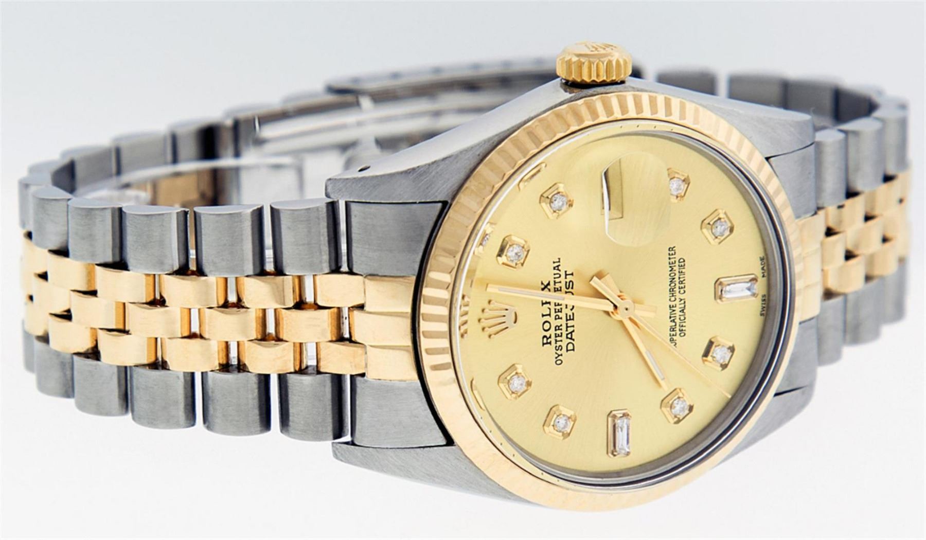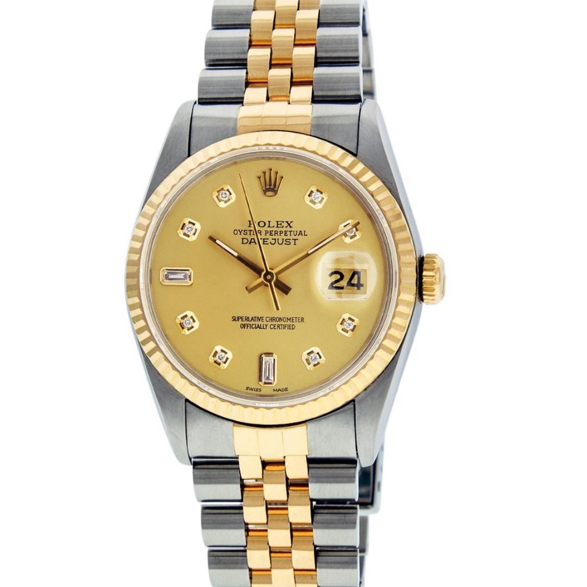 One Mens 14K Yellow Gold Two Tone Rolex Datejust Polished, Serviced & Electronically Tested, 14K Yellow Gold & Stainless Steel Case: 36mm, 14K Yellow Gold Crown, Bezel: 14K Yellow Gold Fluted Bezel. Custom Crystal: New Acrylic Cyclops Lens. Custom Hands: New Luminecent Hands. Movement: Automatic Winding Movement Caliber 3035. Custom Dial: Champagne Diamond Dial, Diamond Count: 8 Diamonds + 2 Baguette Diamonds in Dial, G To H In Color, SI-VS Clarity. Date Window: 3 O'Clock Position Date Display, Quickset, Model: Datejust, Condition: G-6 Extra Fine. Bracelet: Two Tone 14K Yellow Gold & Stainless Steel Jubilee Band. Bright Polish. 7.0 Inch Length, Adjustable. Standard Clasp, With Rolex Logo. This Watch Has Been Serviced And Polished It Is Free Of All Scratches And Dents.