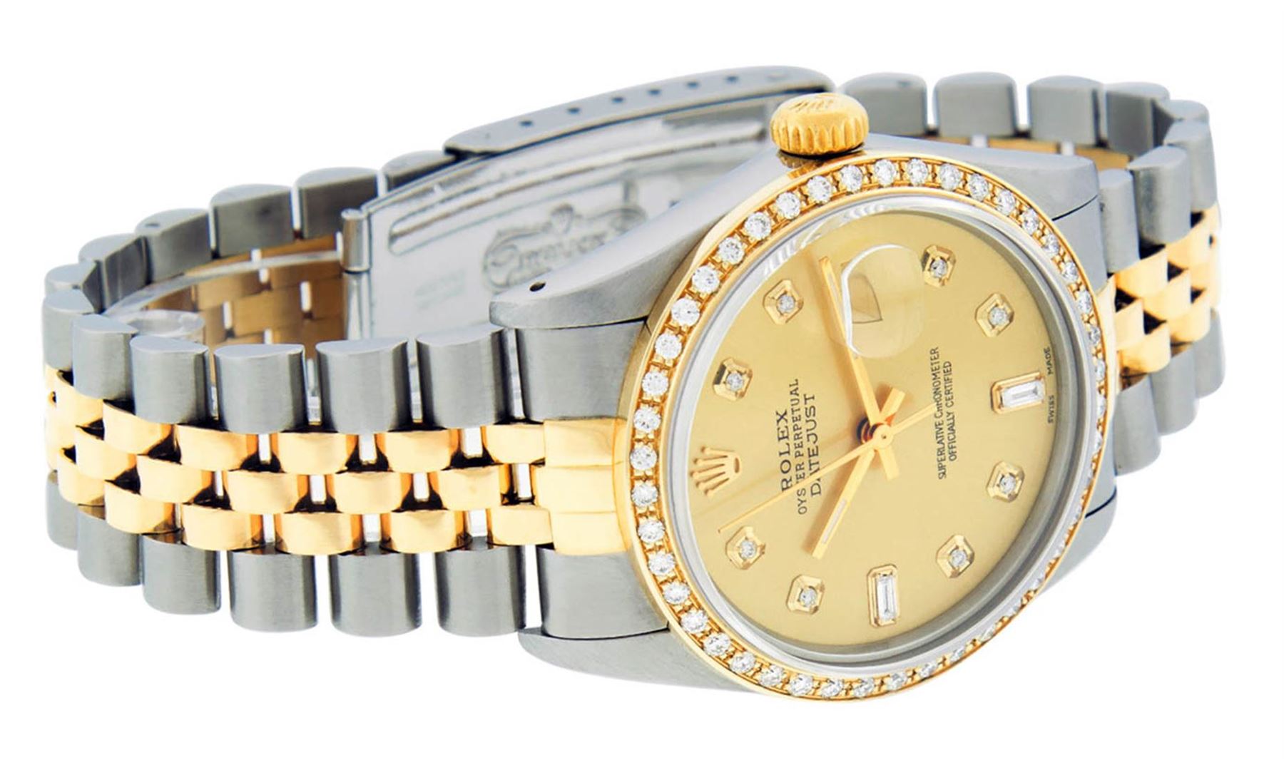One Mens 14K Yellow Gold Two Tone Rolex Datejust Polished, Serviced & Electronically Tested, 18K Yellow Gold & Stainless Steel Case: 36mm, 18K Yellow Gold Crown, Custom Bezel: New 18K Yellow Gold Beadset Diamond Bezel, Diamond Count: 44 Diamonds, Total Weight 1.00 Carat, Clarity: SI-VS, Color: G to H. Crystal: New Synthetic Sapphire Cyclops Lens. Custom Hands: New Luminecent Hands. Movement: Automatic Winding Movement Caliber 3035. Custom Dial: Champagne and Baguette Diamond Hour Markers On 6 and 9, Diamond Count: 8 + 2 Bagguette Diamonds in Dial G To H In Color, Clarity: VS2-SI1, Date Window: 3 O'Clock Position Date Display, Quickset, Model: 16013 Condition: G-6 Extra Fine. Bracelet: Two Tone 14K Yellow Gold & Stainless Steel Jubilee. Bright Polish. 7.0 Inch Length, Adjustable. Standard Clasp, With Rolex Logo. This Watch Has Been Serviced Time Tested And Is In Excellent Condition It Is Free Of All Scratches And Dents.