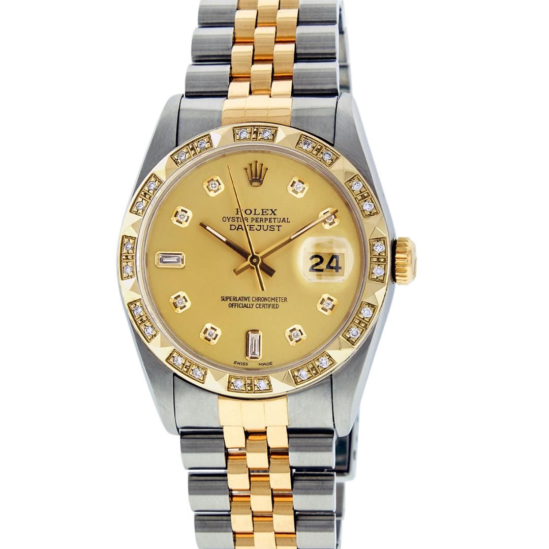 One Mens 14K Yellow Gold Rolex Datejust Polished Bright with Satin Finish, Serviced & Electronically Tested, Stainless Steel Case: 36mm, Yellow Gold Crown, Custom Bezel: New 18K Yellow Gold Pyramid Diamond Bezel, Diamond Count: 24 Diamonds, Total Weight .75 Carat, Clarity: SI-VS, Color: G to H. Custom Crystal: New Synthetic Sapphire Cyclops Lens. Custom Hands: New Luminecent Hands. Movement: Automatic Winding Movement Caliber 3035. Custom Dial: Champagne Diamond Dial, Diamond Count: 8 Diamonds + 2 Baguette Diamonds In Dial, Color: G to H, Clarity: VS. Date Window: 3 O'Clock Position Date Display, Quickset, Model: 16013 Datejust. Condition: G-6 Extra Fine. Bracelet: 14K Yellow Gold And Stainless Steel Jubilee Band. Bright Polish & Satin Finish. 7.0 Inch Length, Adjustable. Standard Clasp, With Rolex Logo. This Watch Has Been Serviced And Polished It Is Free Of All Scratches And Dents.