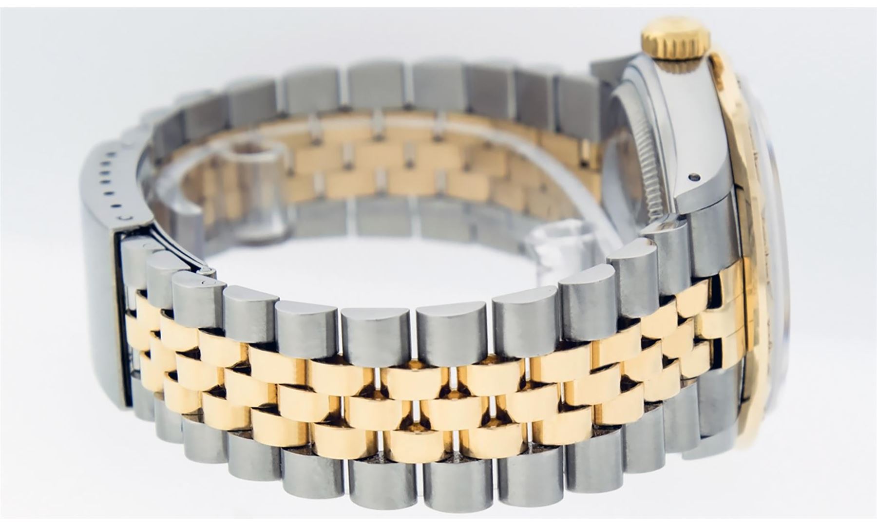 One Mens 14K Yellow Gold Rolex Datejust Polished Bright with Satin Finish, Serviced & Electronically Tested, Stainless Steel Case: 36mm, Yellow Gold Crown, Custom Bezel: New 18K Yellow Gold Pyramid Diamond Bezel, Diamond Count: 24 Diamonds, Total Weight .75 Carat, Clarity: SI-VS, Color: G to H. Custom Crystal: New Synthetic Sapphire Cyclops Lens. Custom Hands: New Luminecent Hands. Movement: Automatic Winding Movement Caliber 3035. Custom Dial: Champagne Diamond Dial, Diamond Count: 8 Diamonds + 2 Baguette Diamonds In Dial, Color: G to H, Clarity: VS. Date Window: 3 O'Clock Position Date Display, Quickset, Model: 16013 Datejust. Condition: G-6 Extra Fine. Bracelet: 14K Yellow Gold And Stainless Steel Jubilee Band. Bright Polish & Satin Finish. 7.0 Inch Length, Adjustable. Standard Clasp, With Rolex Logo. This Watch Has Been Serviced And Polished It Is Free Of All Scratches And Dents.