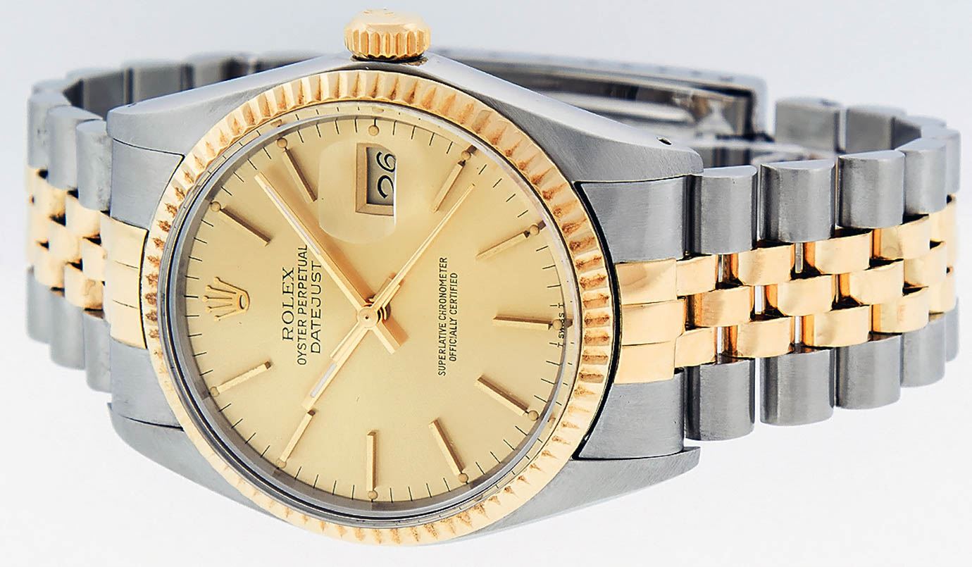 One Mens 14K Yellow Gold Two Tone Rolex Datejust Polished, Serviced & Electronically Tested, 14K Yellow Gold & Stainless Steel Case: 36mm,14K Yellow Gold Crown, Bezel: 14K Yellow Gold Fluted Bezel. Custom Crystal: New Acrylic Cyclops Lens. Custom Hands: New Luminecent Hands. Movement: Automatic Winding Movement Caliber 3035. Dial: Champagne Dial With Index Hour Markers and Small Track. Date Window: 3 O'Clock Position Date Display, Quickset, Model: 16013 Condition: G-6 Extra Fine. Bracelet: Two Tone 14K Yellow Gold & Stainless Steel Jubilee. Bright Polish. 7.0 Inch Length, Adjustable. Standard Clasp, With Rolex Logo. This Watch Has Been Serviced Time Tested And Is In Excellent Condition It Is Free Of All Scratches And Dents.