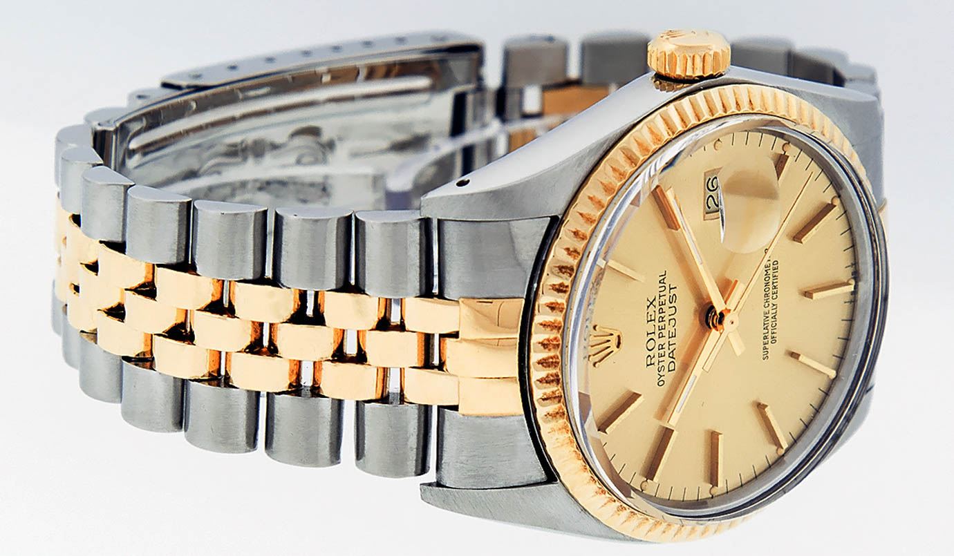 One Mens 14K Yellow Gold Two Tone Rolex Datejust Polished, Serviced & Electronically Tested, 14K Yellow Gold & Stainless Steel Case: 36mm,14K Yellow Gold Crown, Bezel: 14K Yellow Gold Fluted Bezel. Custom Crystal: New Acrylic Cyclops Lens. Custom Hands: New Luminecent Hands. Movement: Automatic Winding Movement Caliber 3035. Dial: Champagne Dial With Index Hour Markers and Small Track. Date Window: 3 O'Clock Position Date Display, Quickset, Model: 16013 Condition: G-6 Extra Fine. Bracelet: Two Tone 14K Yellow Gold & Stainless Steel Jubilee. Bright Polish. 7.0 Inch Length, Adjustable. Standard Clasp, With Rolex Logo. This Watch Has Been Serviced Time Tested And Is In Excellent Condition It Is Free Of All Scratches And Dents.