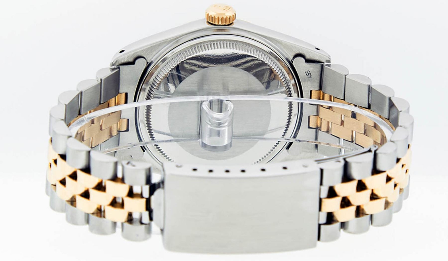 One Mens 14K Yellow Gold Two Tone Rolex Datejust Polished, Serviced & Electronically Tested, 14K Yellow Gold & Stainless Steel Case: 36mm,14K Yellow Gold Crown, Bezel: 14K Yellow Gold Fluted Bezel. Custom Crystal: New Acrylic Cyclops Lens. Custom Hands: New Luminecent Hands. Movement: Automatic Winding Movement Caliber 3035. Dial: Champagne Dial With Index Hour Markers and Small Track. Date Window: 3 O'Clock Position Date Display, Quickset, Model: 16013 Condition: G-6 Extra Fine. Bracelet: Two Tone 14K Yellow Gold & Stainless Steel Jubilee. Bright Polish. 7.0 Inch Length, Adjustable. Standard Clasp, With Rolex Logo. This Watch Has Been Serviced Time Tested And Is In Excellent Condition It Is Free Of All Scratches And Dents.